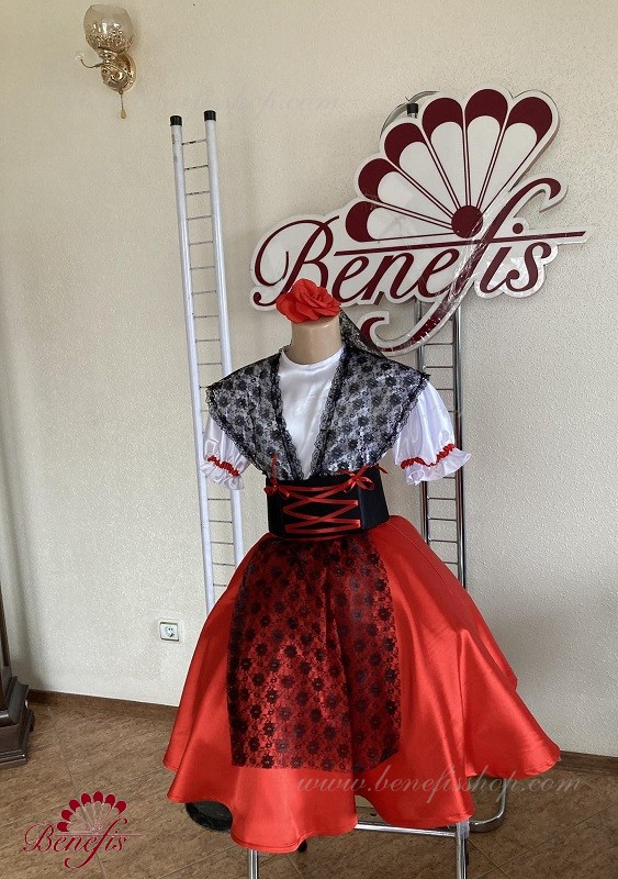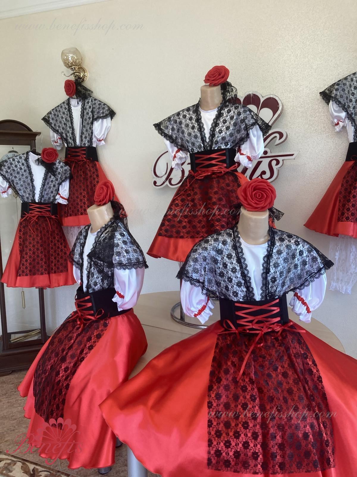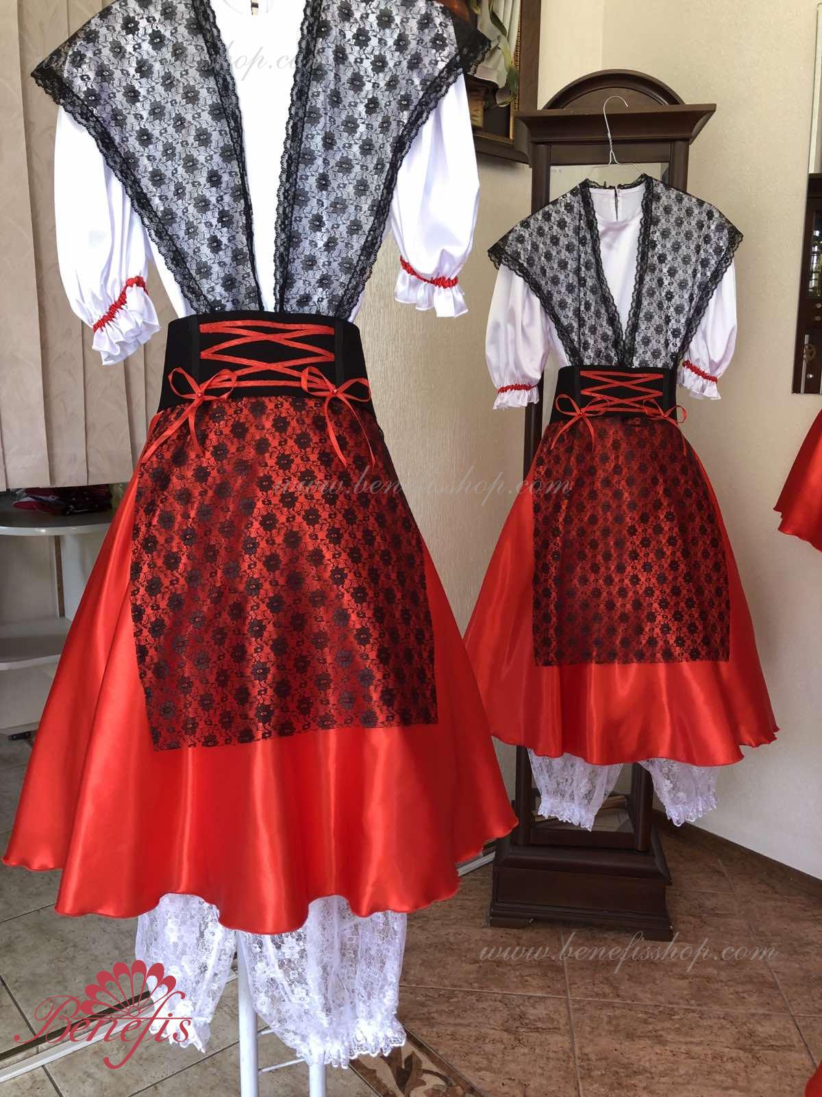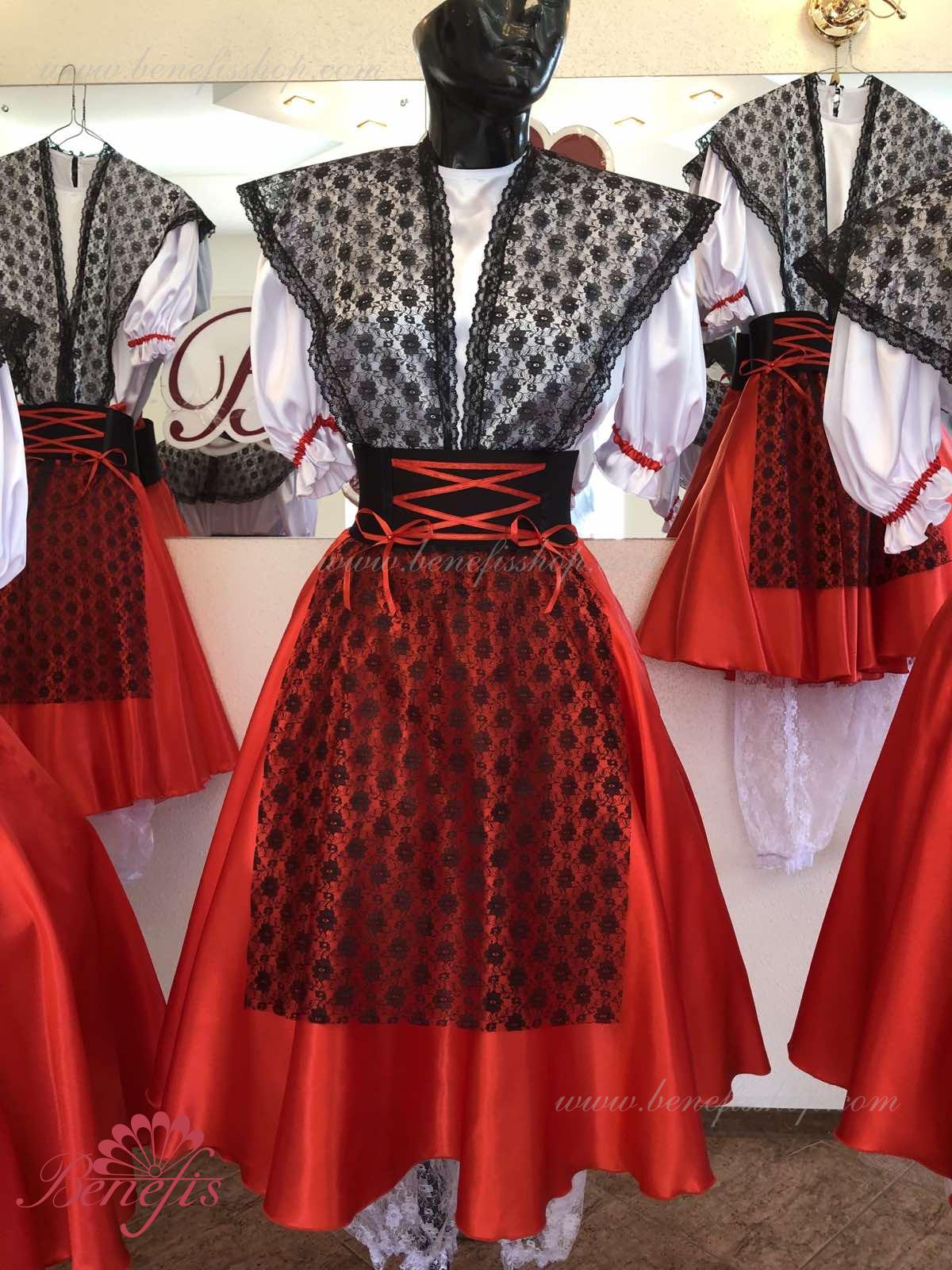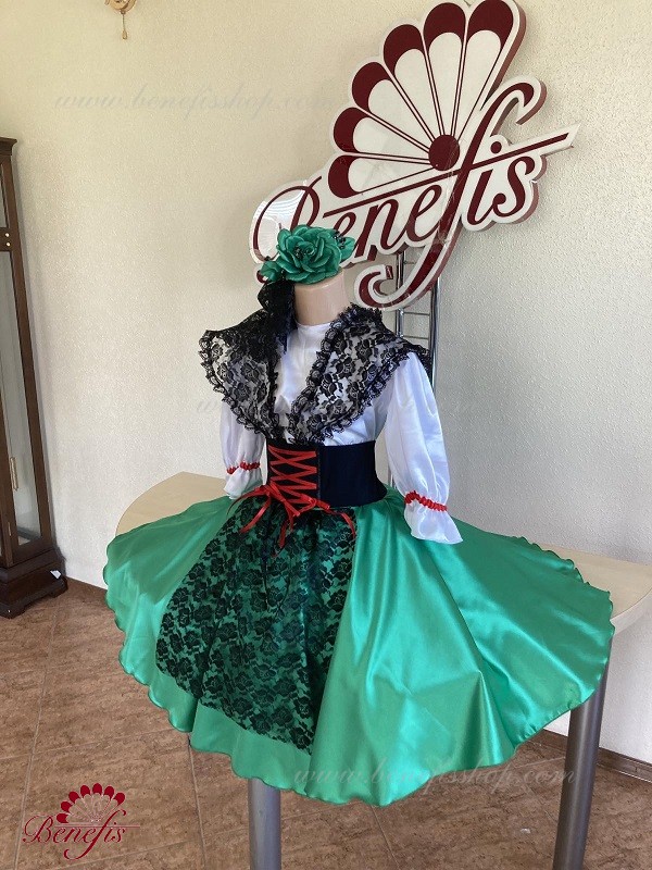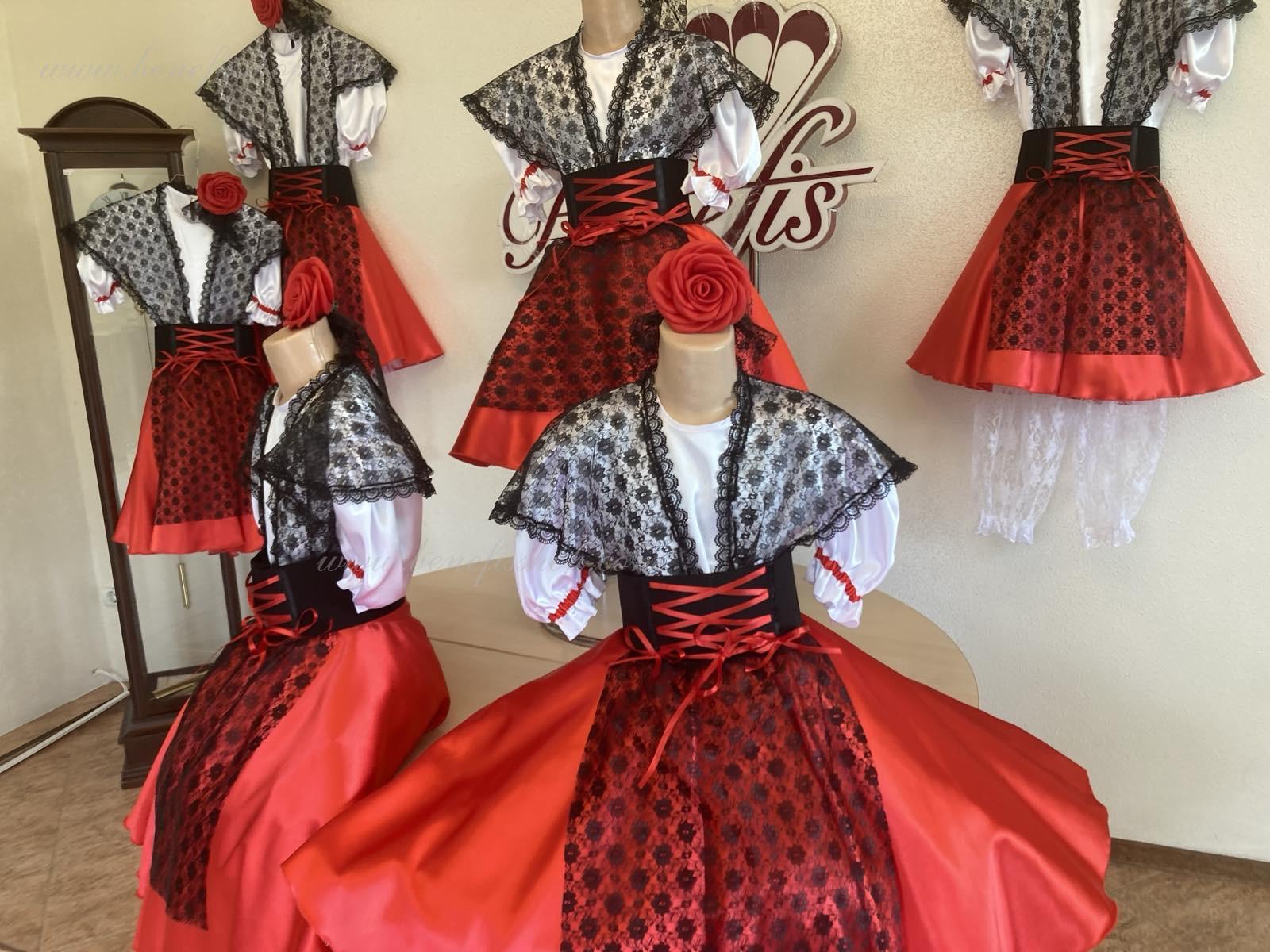 Detalii: bluză, fustă, curea, pantaloni. Acest costum de scenă de balet se bazează pe o bluză ușoară din sifon cu guler gipur. Fusta din satin are volane delicate din tul ușor și este acoperită cu un șorț de guipură deasupra. Centura elastică este fixată în spate cu cârlige pe panglică de sub partea inferioară a fustei se prevad pantalonii din ghipură.