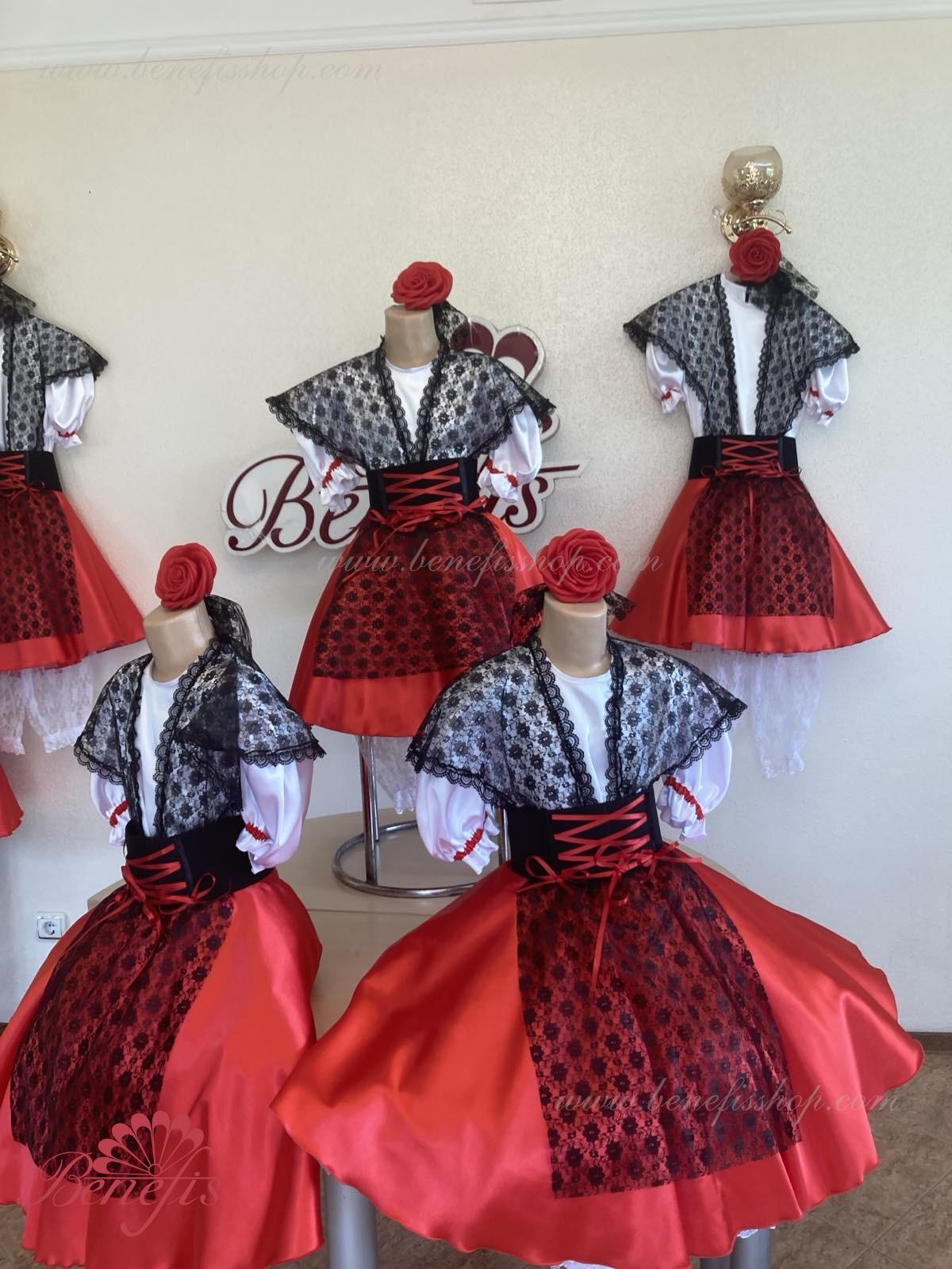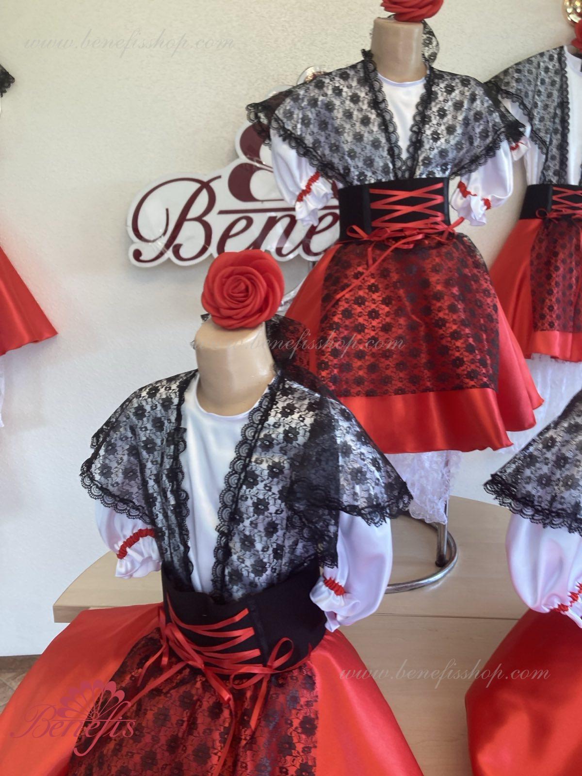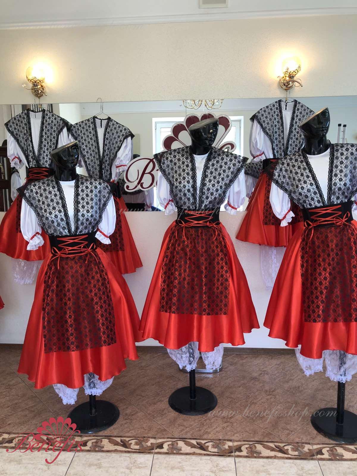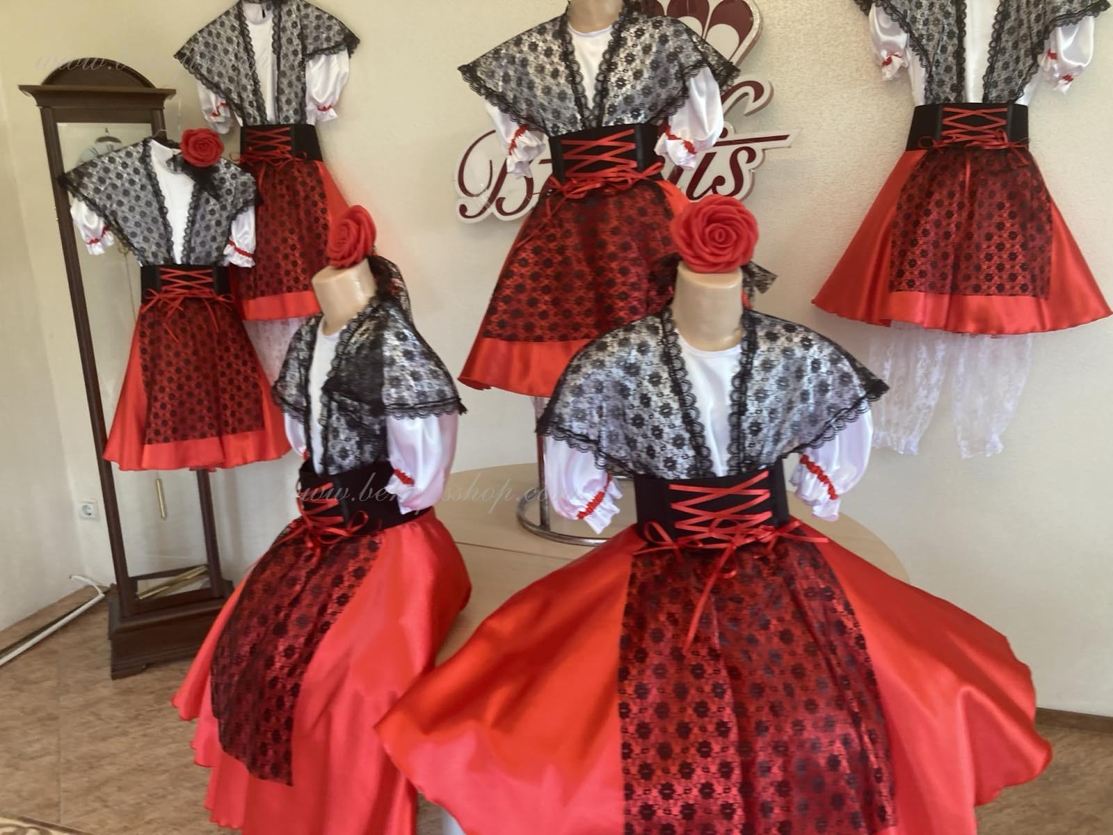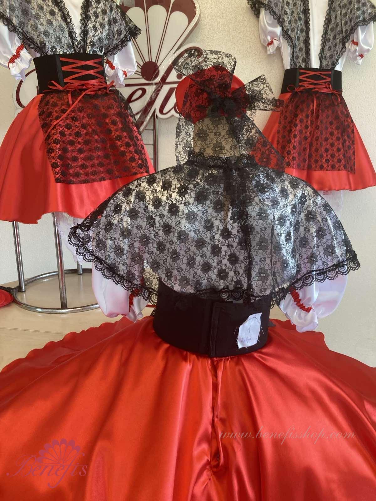 Detalii: bluză, fustă, curea, pantaloni. Acest costum de scenă de balet se bazează pe o bluză ușoară din sifon cu guler gipur. Fusta din satin are volane delicate din tul ușor și este acoperită cu un șorț de guipură deasupra. Centura elastică este fixată în spate cu cârlige pe panglică de sub partea inferioară a fustei se prevad pantalonii din ghipură.