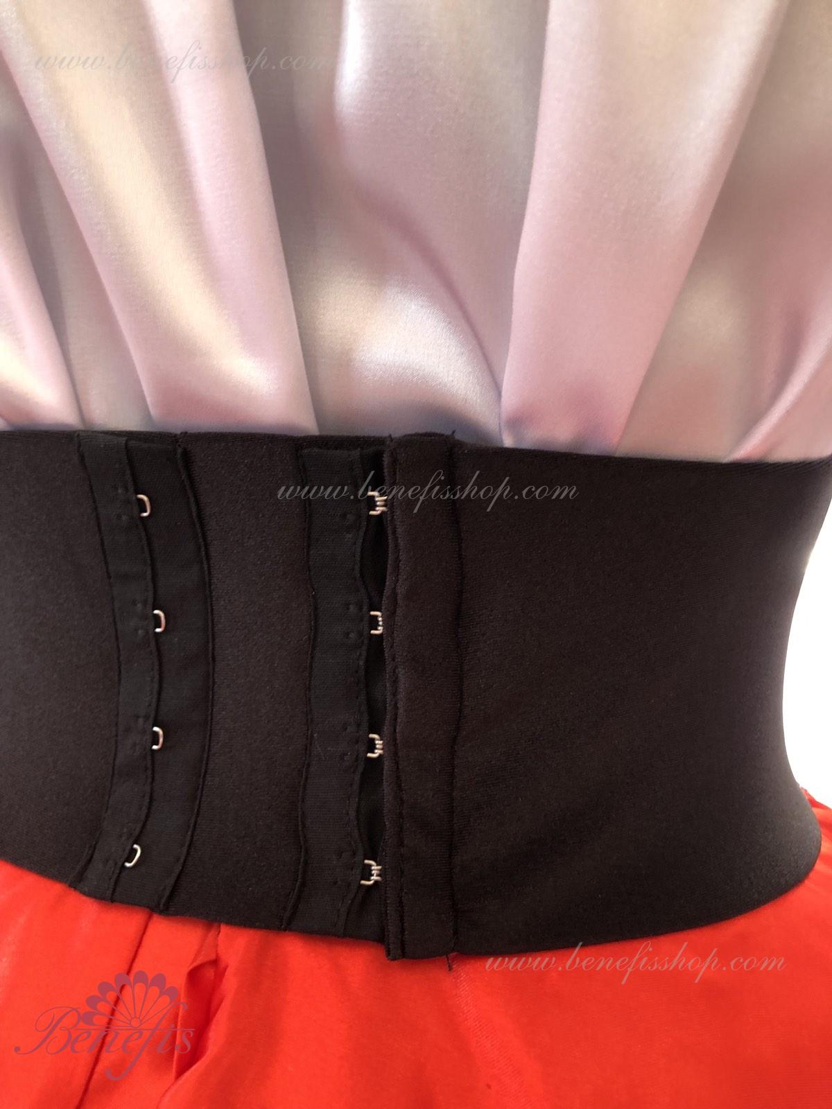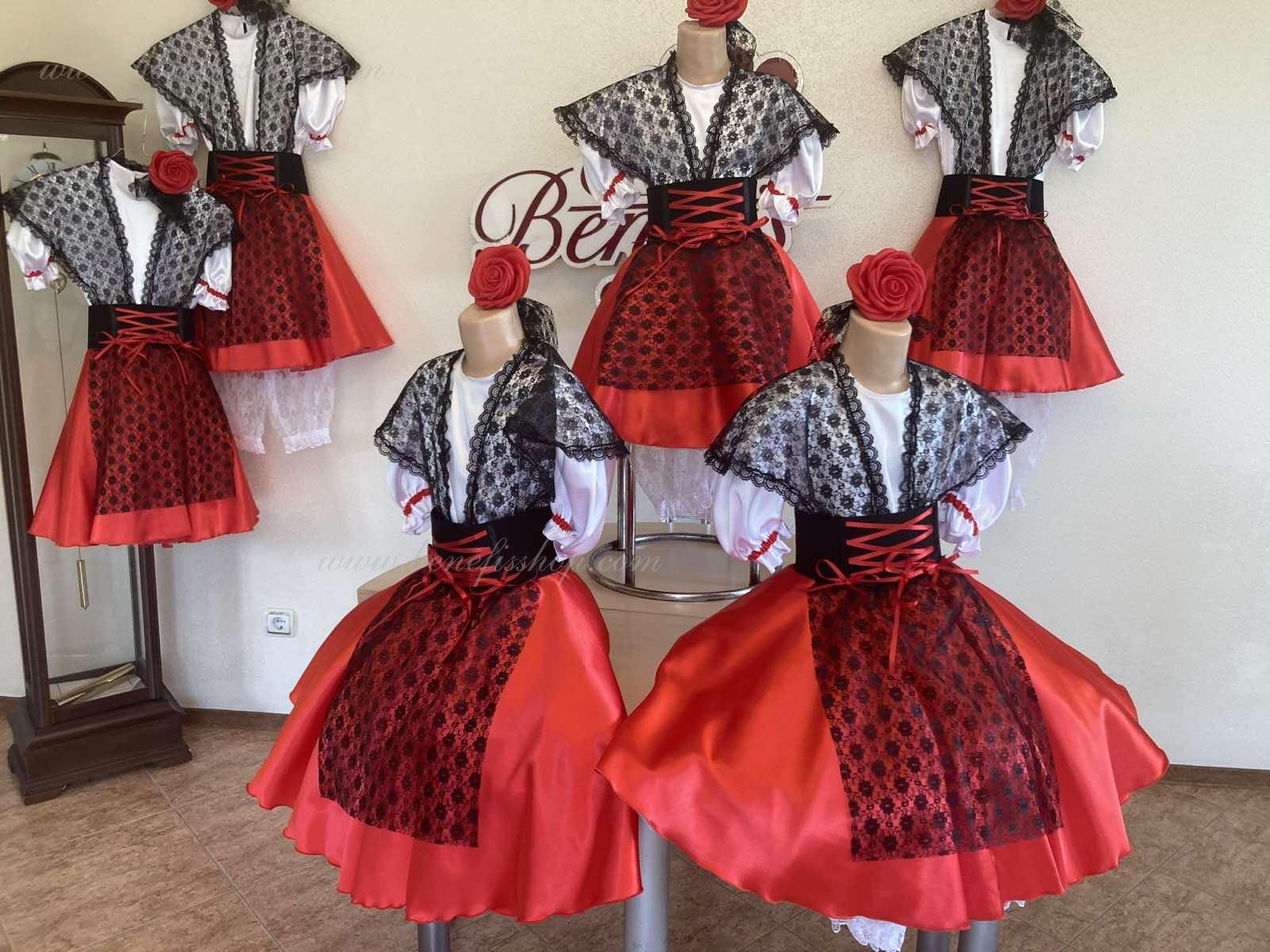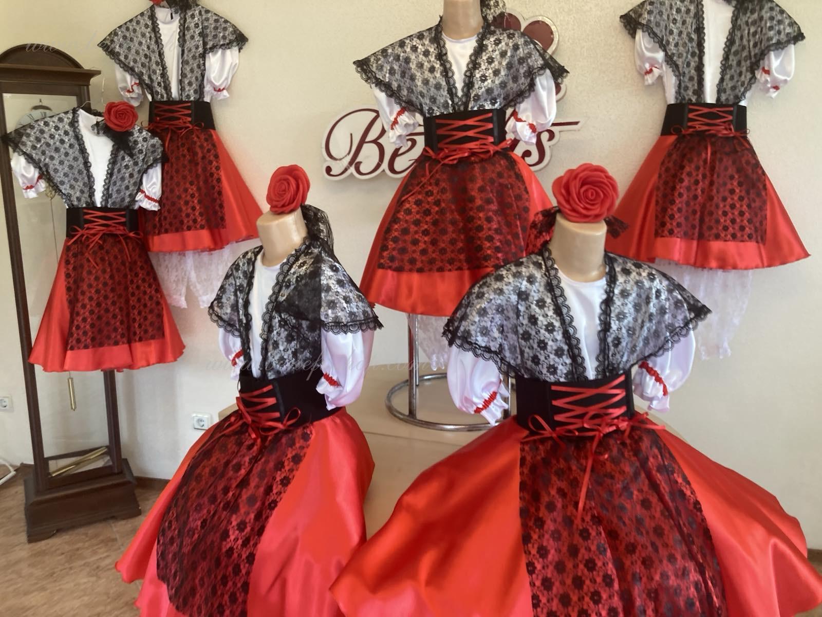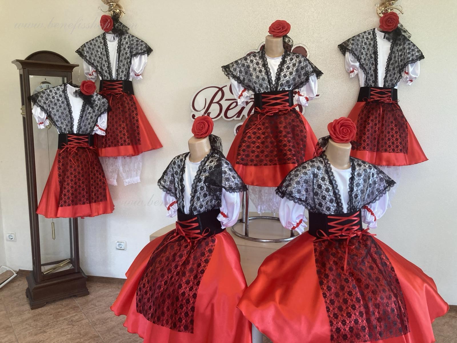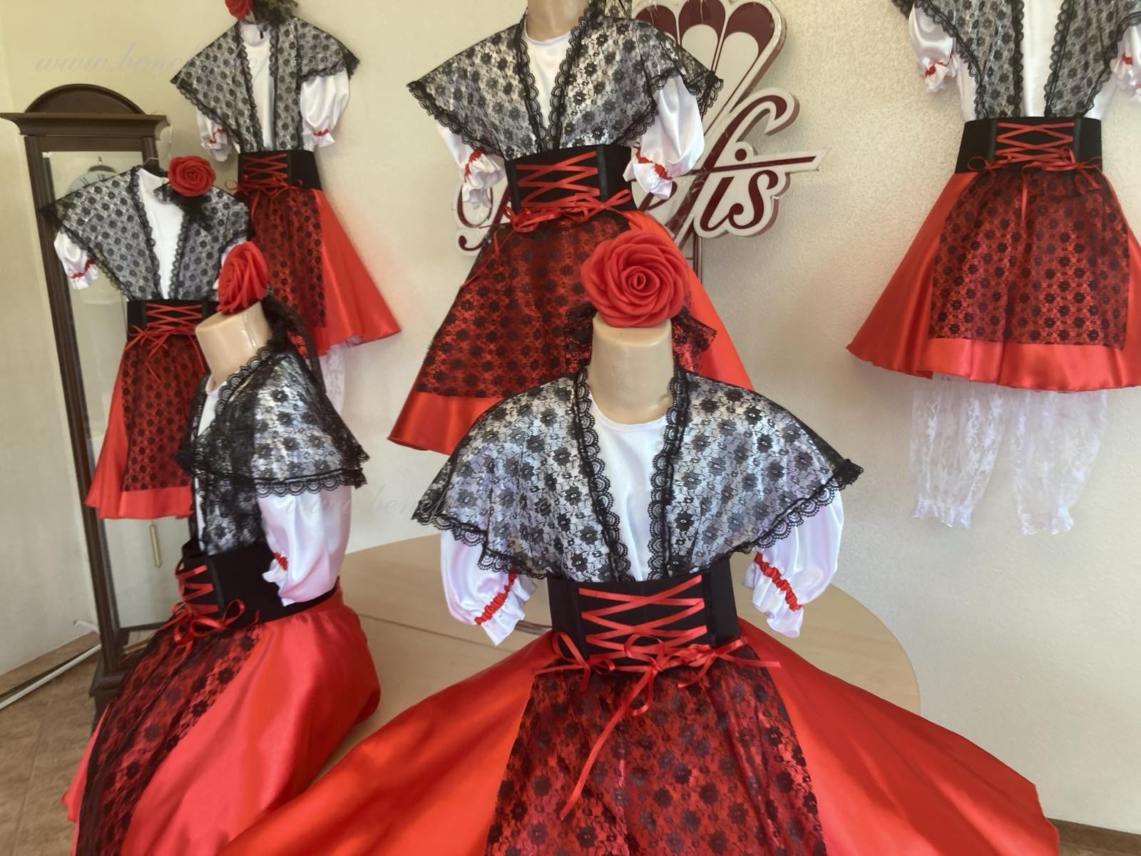 Detalii: bluză, fustă, curea, pantaloni. Acest costum de scenă de balet se bazează pe o bluză ușoară din sifon cu guler gipur. Fusta din satin are volane delicate din tul ușor și este acoperită cu un șorț de guipură deasupra. Centura elastică este fixată în spate cu cârlige pe panglică de sub partea inferioară a fustei se prevad pantalonii din ghipură.