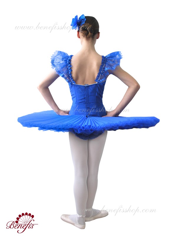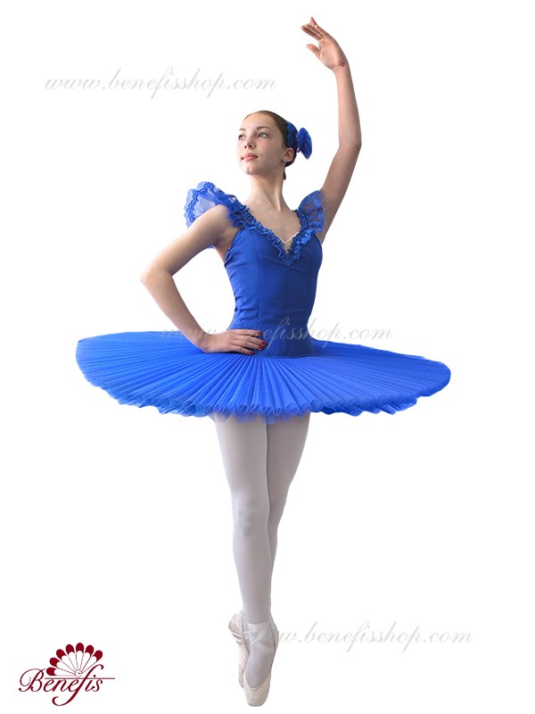 Este un costum de balet profesionist.Corsetul este fabricat pe modelul de bază T0009 pe curele elastice cu inserție corporală pe piept.Care este fixat în spate pe 2 rânduri de cârlige și bucle, şiretul interior servește la strângerea corsetului în zona pieptului.Corsetul este completat de mâneci pufoase din ghipură, sub formă de aripi.