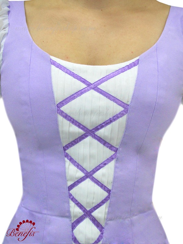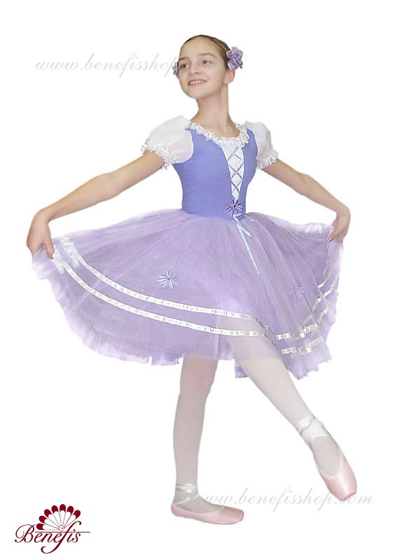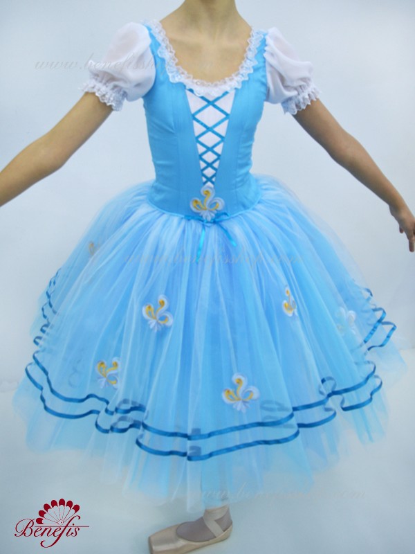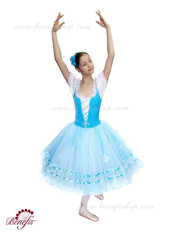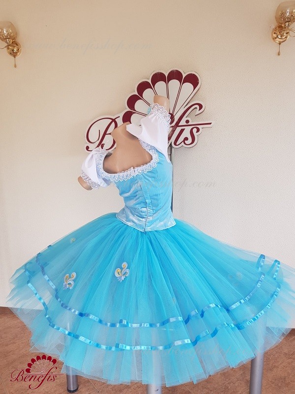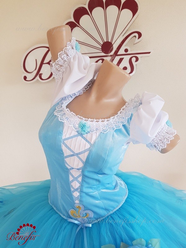 Acest costum este fabricat la maximum asemanator cu costumul solistei din baletul “Giselle”. Este modelat in baza modelului # T 0003 – o fusta cu platca pe chilotei – cu 6 straturi de tul usor. Corsetul este indeplinit dupa masurile individuale, dintr-o tesatura semi stretch cu cirlige pe spate in doua rinduri pentru regularea comoda. Costumul este decorat cu panglice de satin in culoarea costumului.