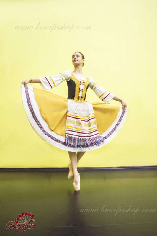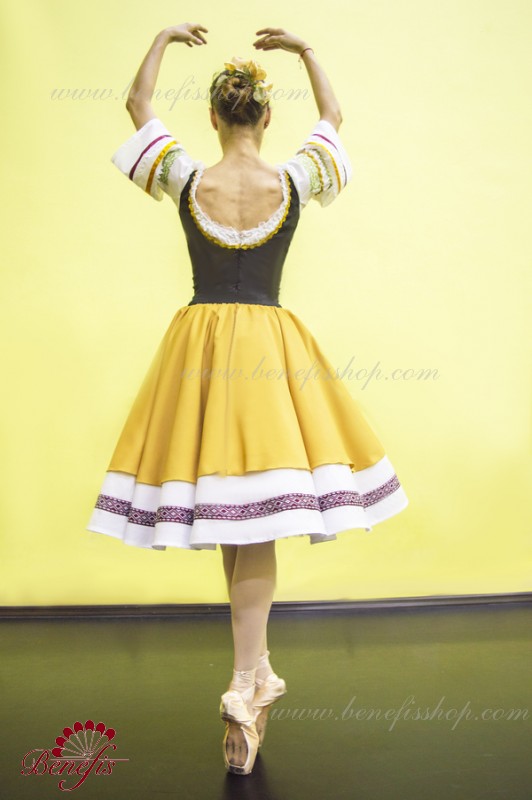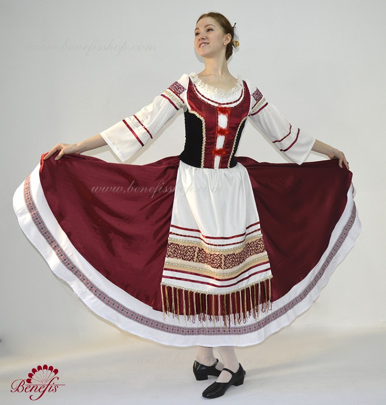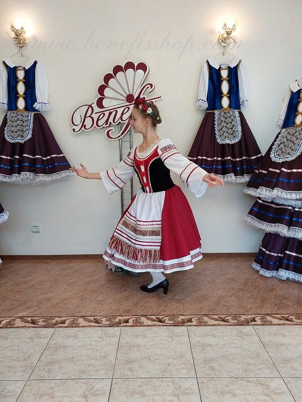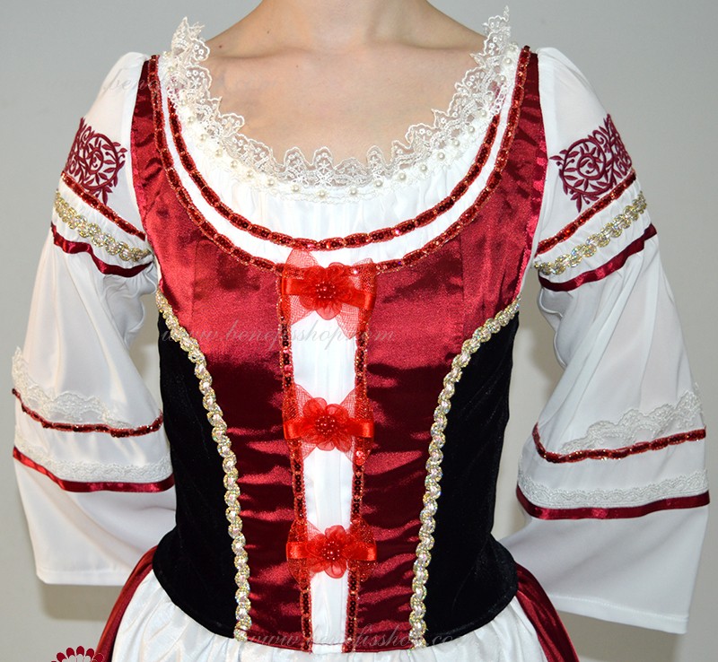 Corsetul este indeplinit dintr-un material semiflexibil, care trece în bluză cu mâneci trei sferturi. Corsetul decorat cu dantelă, margele, flori, dantelă satinata. Se incheie din spate in două rânduri de cârlige.
