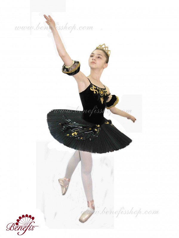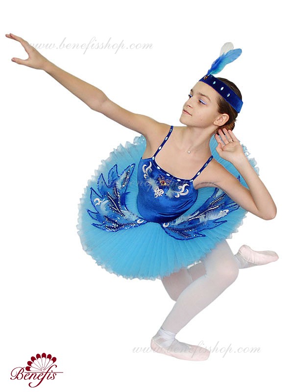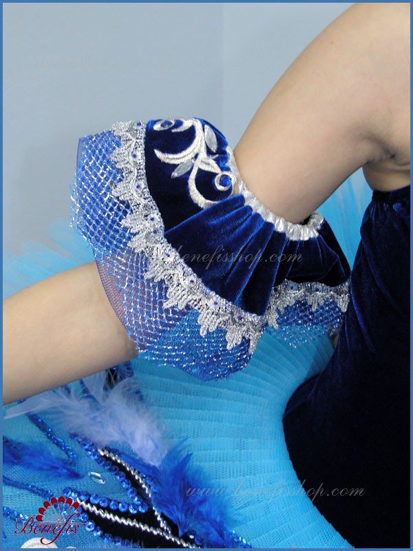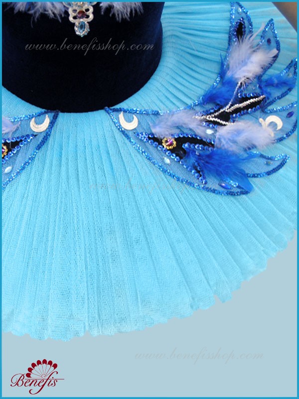 Costumul este indeplinit in baza tricoului elastic si fustei cu cercuri, cu un decor bogat in forma de aripi ca la Principesa Florina ( baletul “Frumoasa Adormita”, variatia Pasarii Albastre). Pe corset sunt prezente aplicatii, brodate cu strase si paiete. Obada nu este inclusa in pretul costumului. Va puteti procura obada pentru plata suplimentara. Vedeti “Accesorii”.