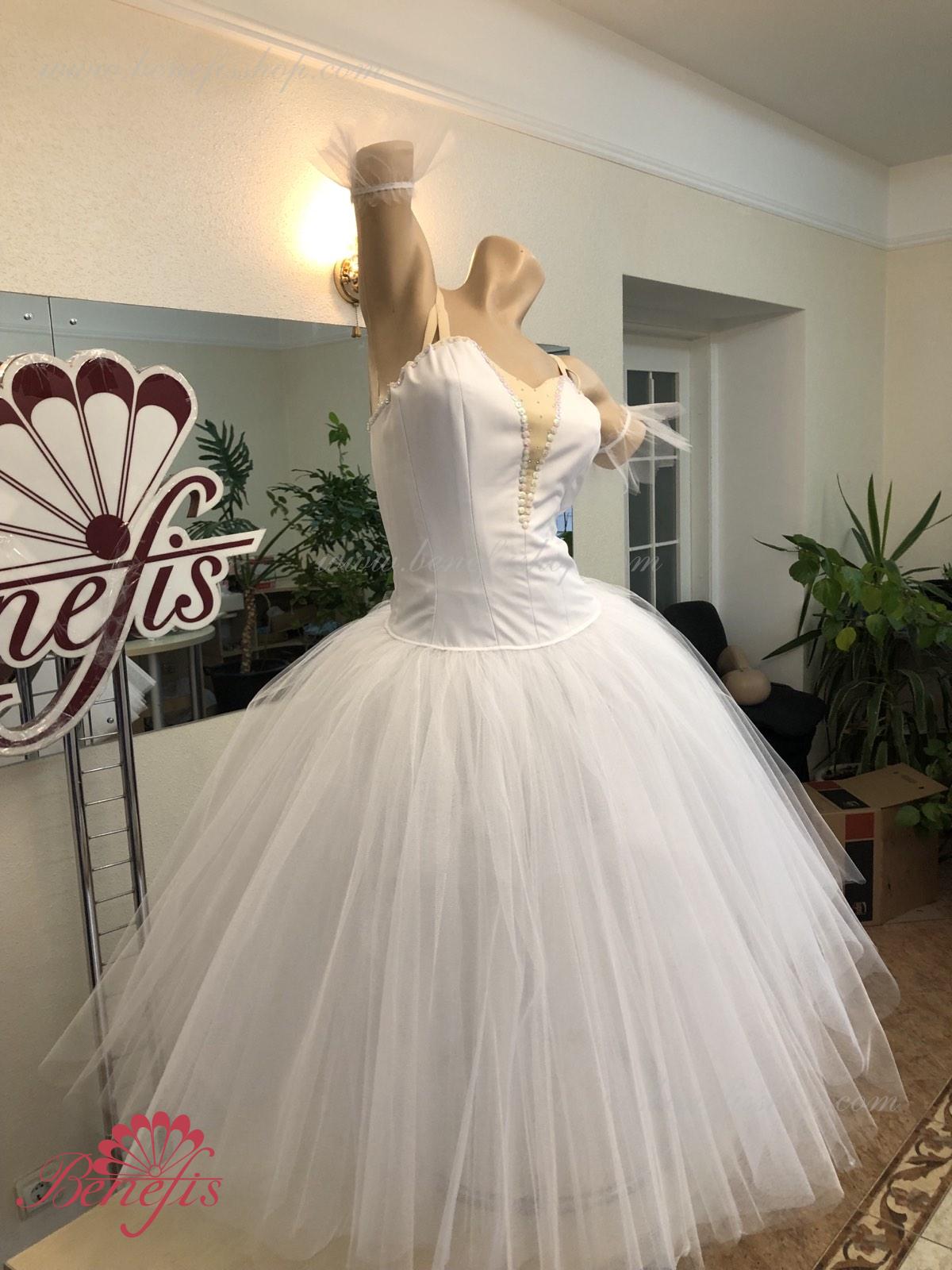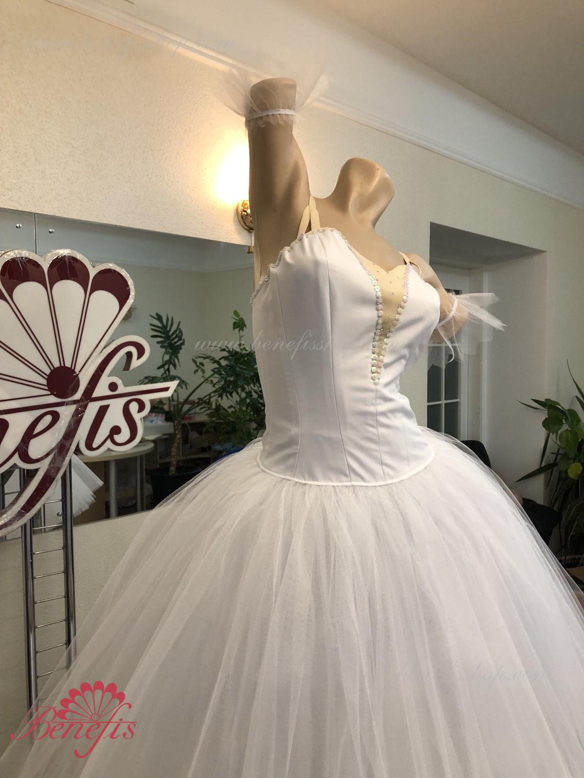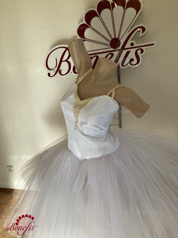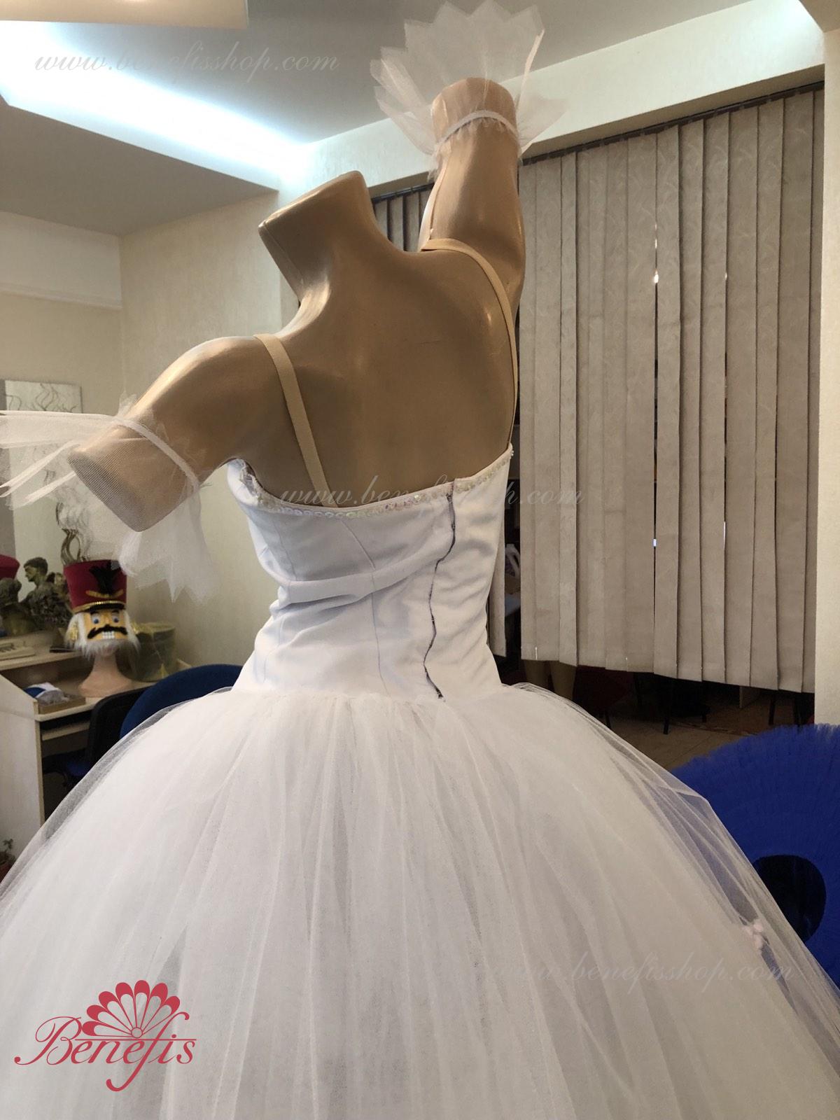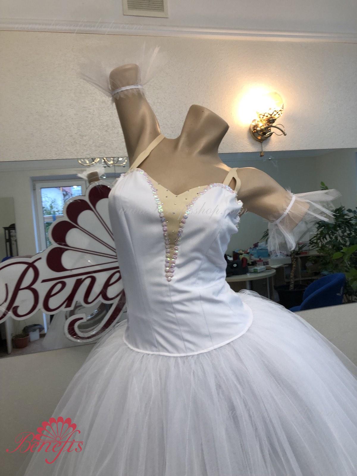 Costum de scena profesionist. Este confectionat in baza fustei de balet profesioniste romantice de baza #T0003 (vezi compartimentul „Fuste de balet de baza”). Pe piept este un plastron de culoarea pielii. Chingele sunt de culoarea pielii.Costumul se realizeaza din tesaturi albe ca zapada. Corsetul este confectionat din tesatura densa semi-stretch cu platca lungita care se termina cu virf in forma lui “v”. Fusta din fatin foarte usor este foarte larga si in lungime ajunge pana la glesnele dansatoarei.Corsetul se strange cu siret.Costumul poate fi utilizat si pentru baletul „Silfida”, “Chopeniana”. La dorinta cumparatorului, se fabrica o pereche de aripi mici.