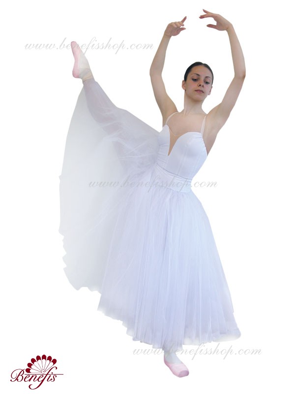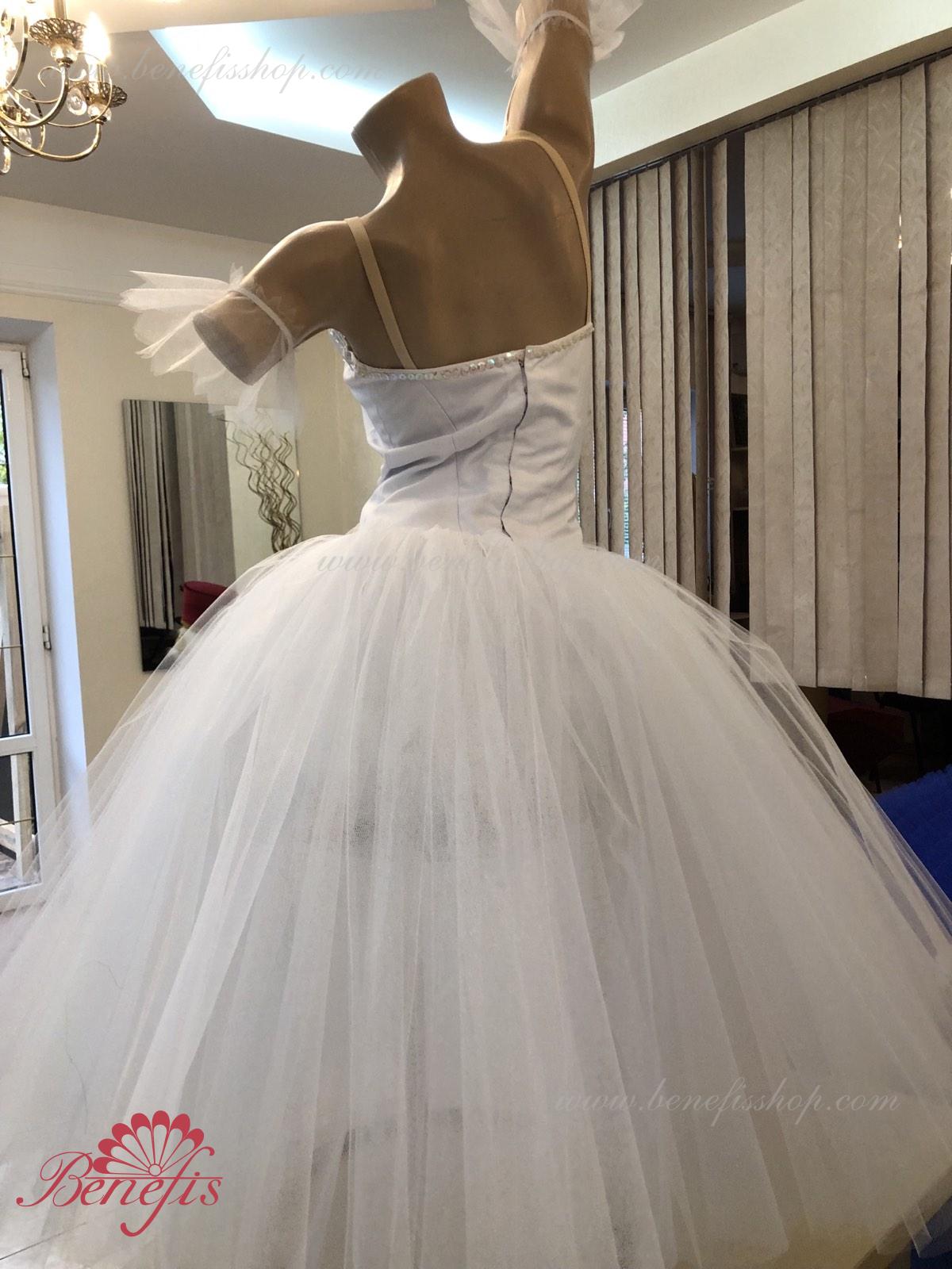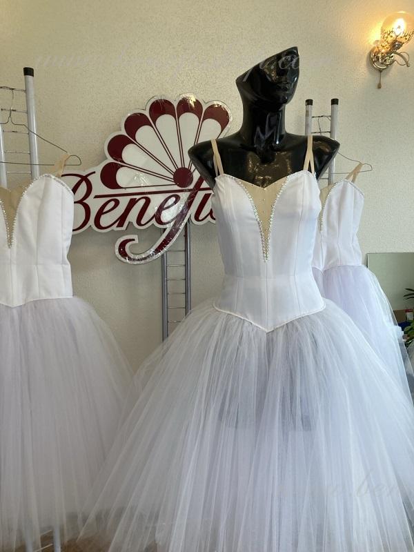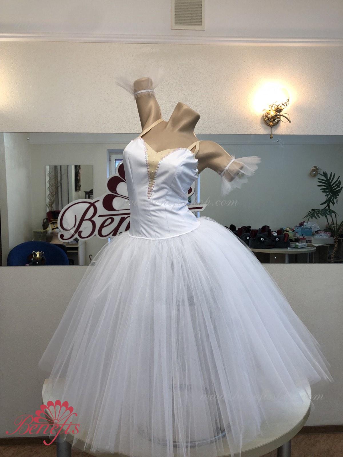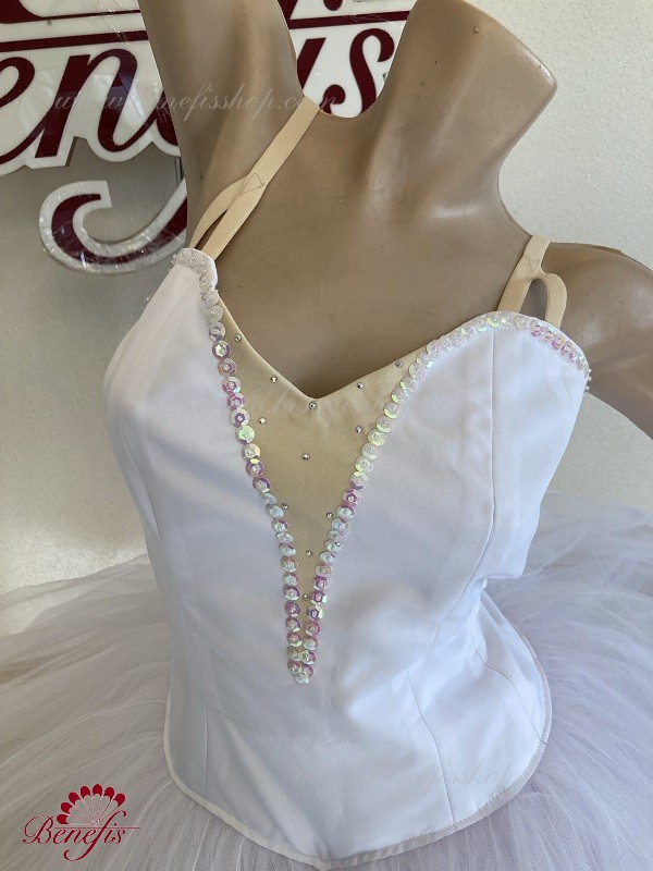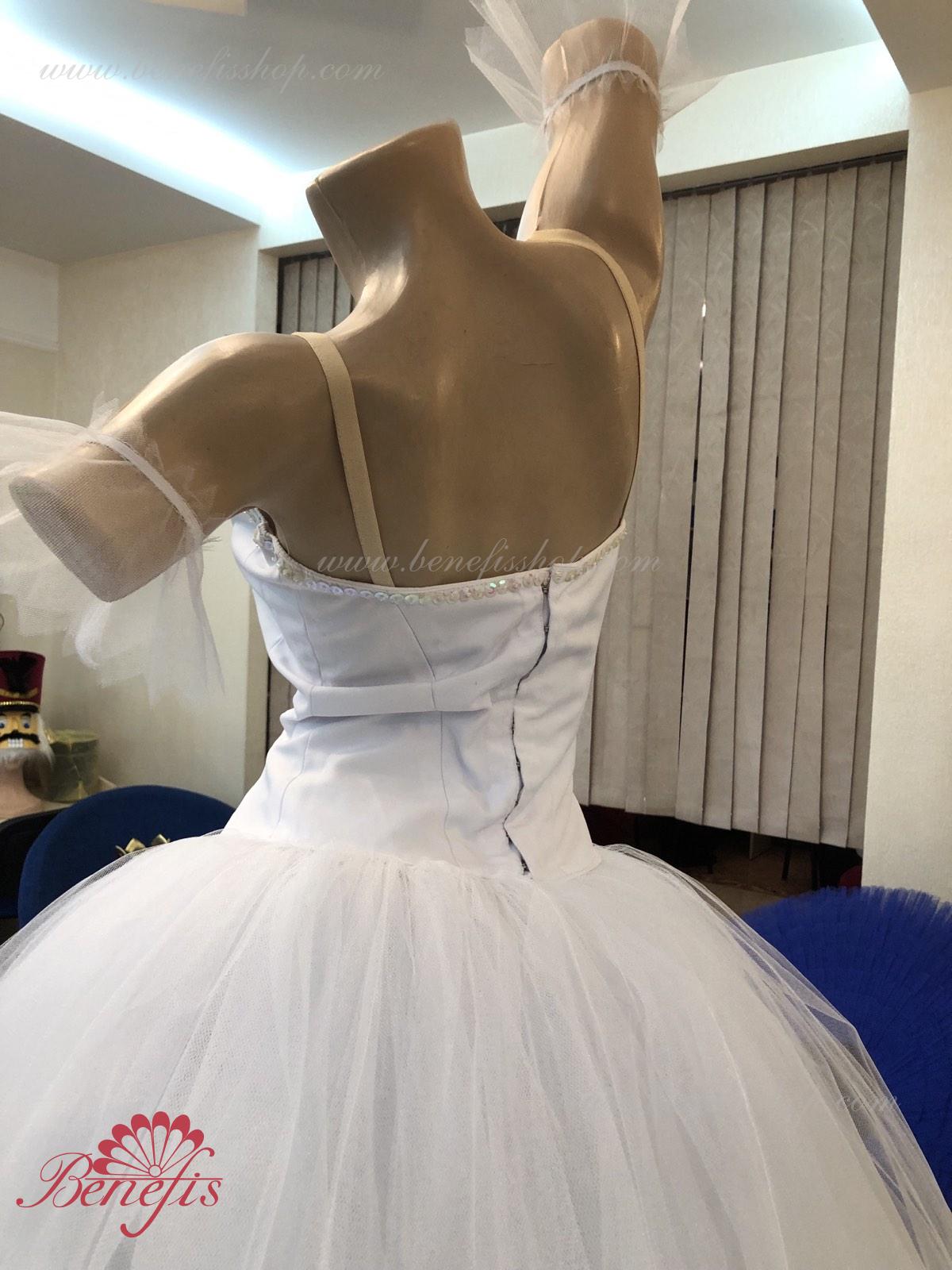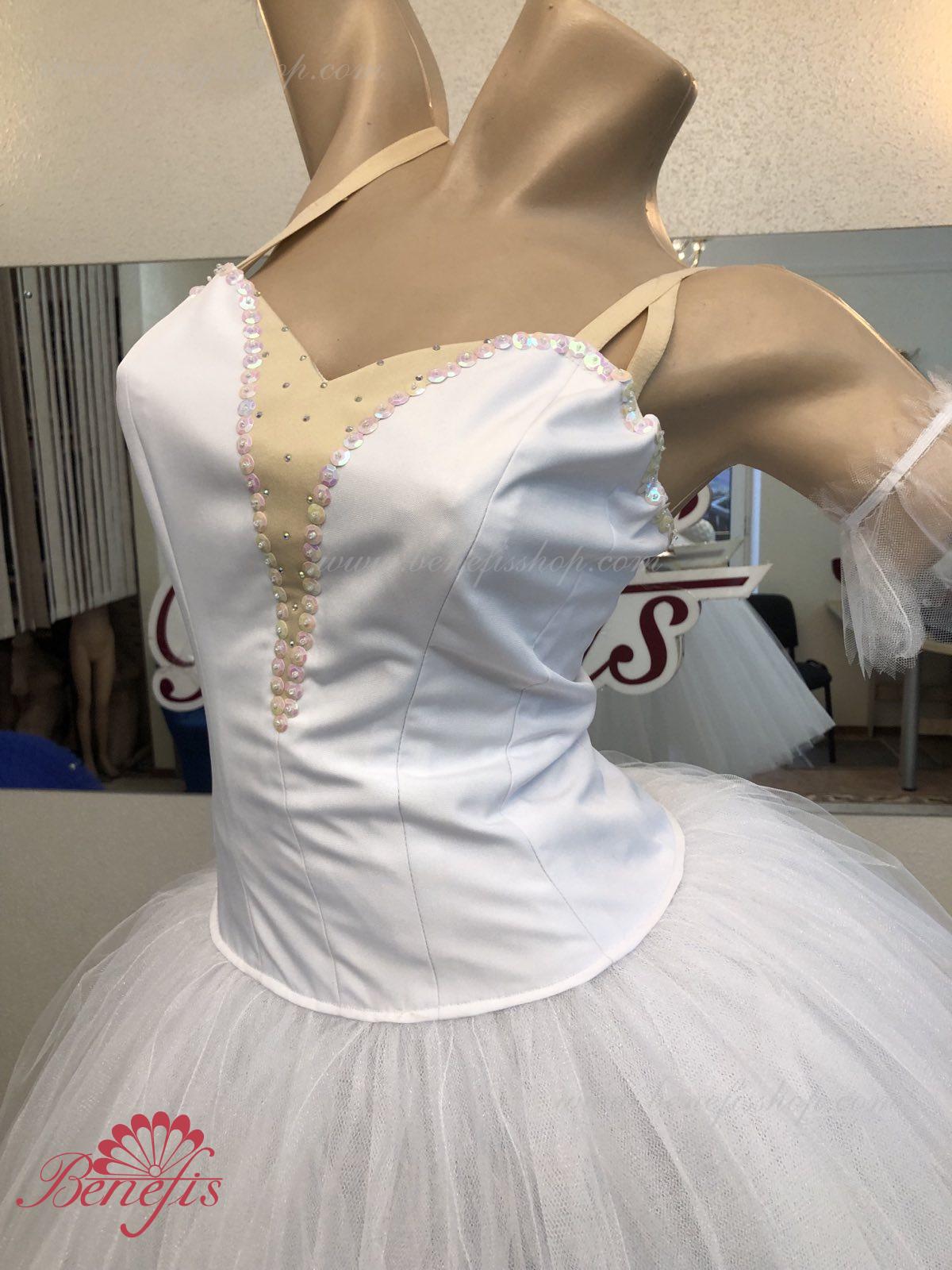 Costum de scena profesionist. Este confectionat in baza fustei de balet profesioniste romantice de baza #T0003 (vezi compartimentul „Fuste de balet de baza”). Pe piept este un plastron de culoarea pielii. Chingele sunt de culoarea pielii.Costumul se realizeaza din tesaturi albe ca zapada. Corsetul este confectionat din tesatura densa semi-stretch cu platca lungita care se termina cu virf in forma lui “v”. Fusta din fatin foarte usor este foarte larga si in lungime ajunge pana la glesnele dansatoarei.Corsetul se strange cu siret.Costumul poate fi utilizat si pentru baletul „Silfida”, “Chopeniana”. La dorinta cumparatorului, se fabrica o pereche de aripi mici.