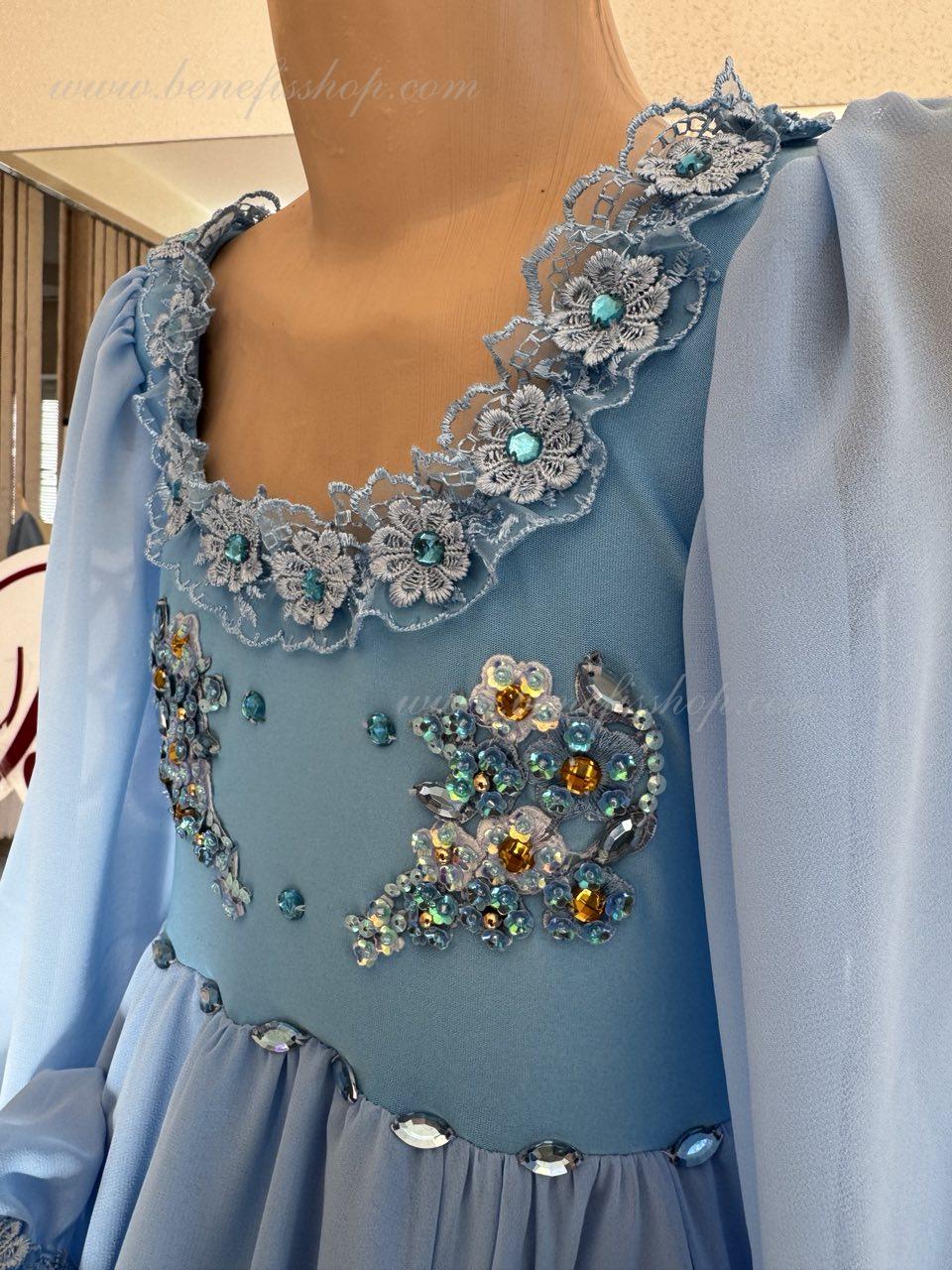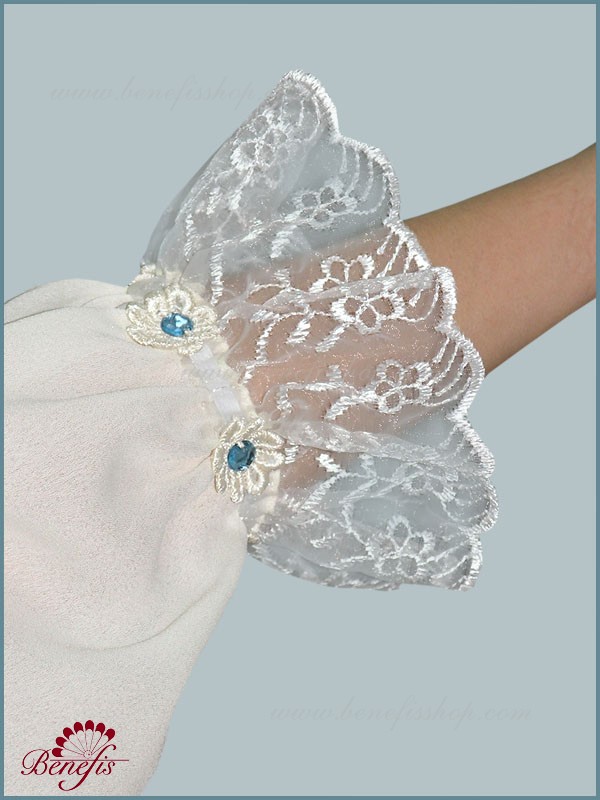 Manșetele și decolteul de pe piept sunt decorate cu dantelă și strasuri.