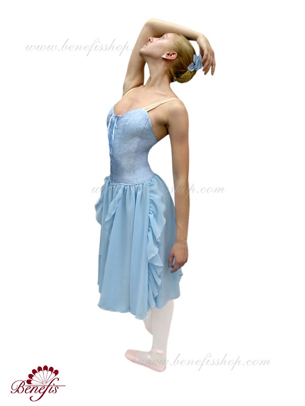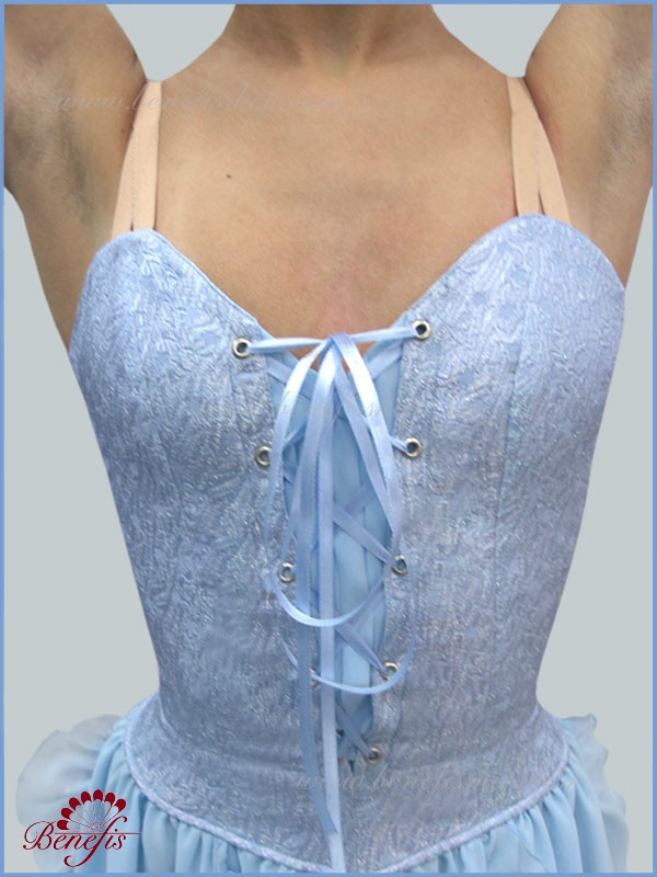 Acest costum profesional de balet cu o silueta gingasa consista din corset, chilotei elastici si o fusta larga cu clini.