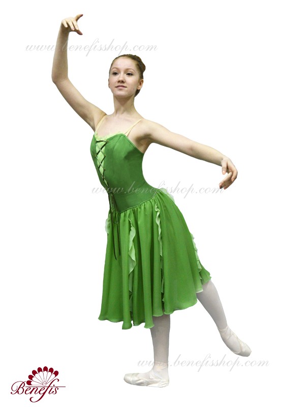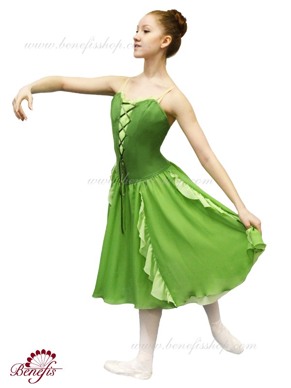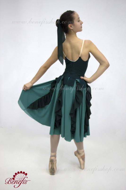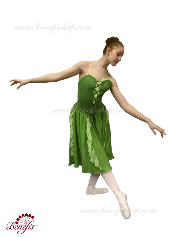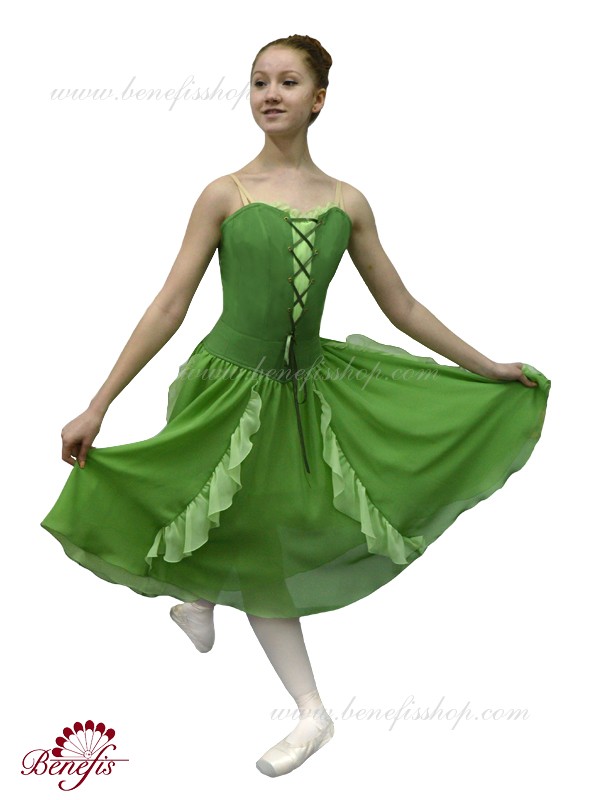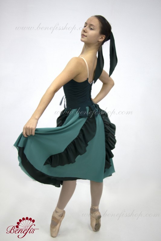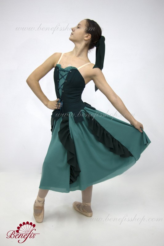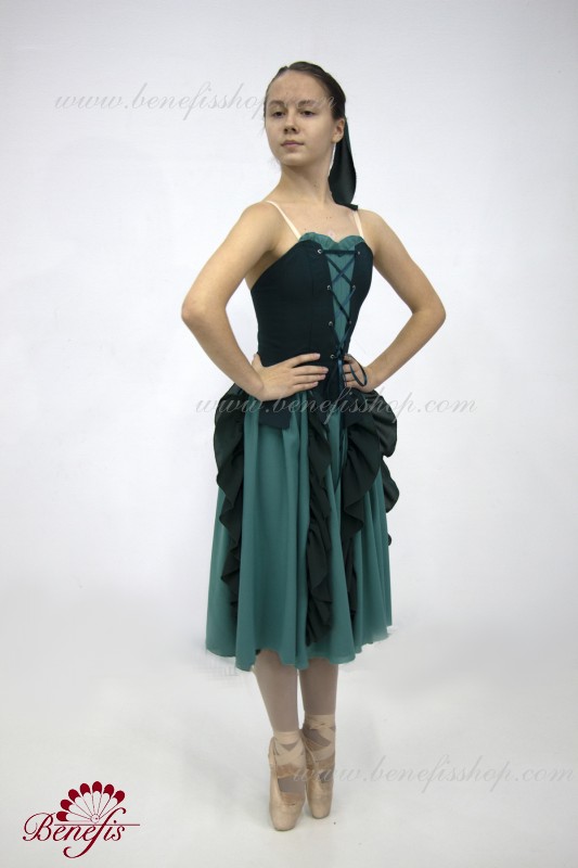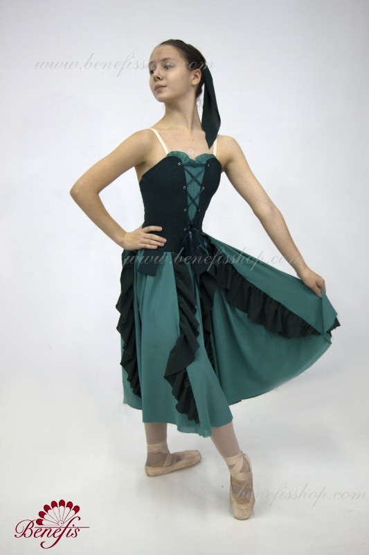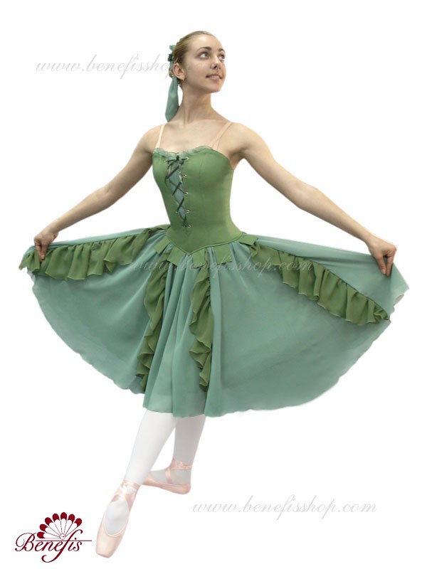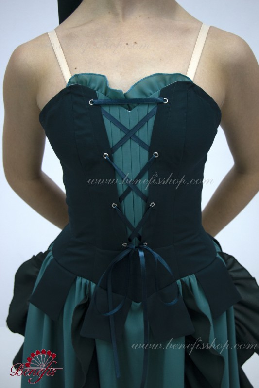Acest costum profesional de balet cu o silueta gingasa consista din corset, chilotei elastici si o fusta larga cu clini.