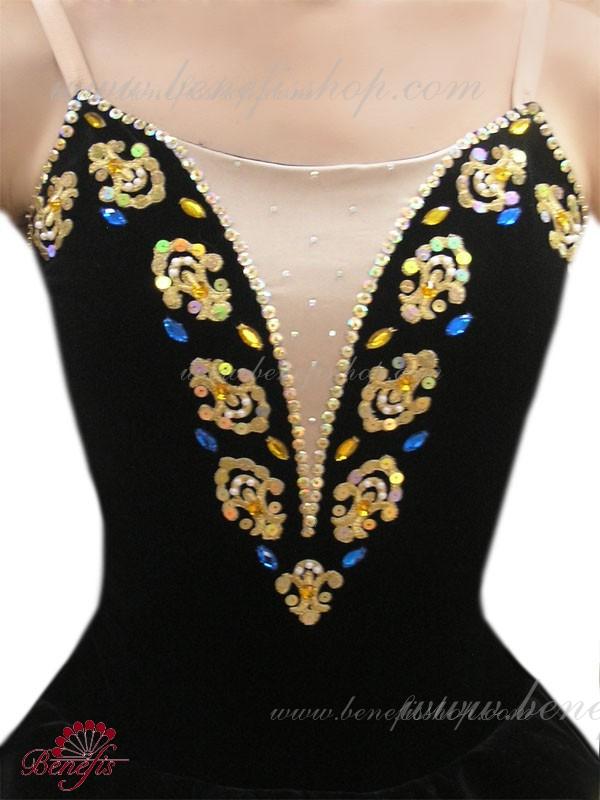 Acest costum de scenă profesional este realizat pe baza unui costum de baie din catifea elastică cu un peplum atașat sub formă de forme triunghiulare lungi și scurte.