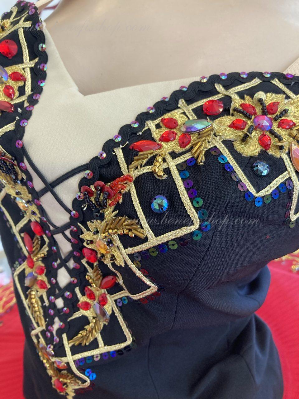 O caracteristică interesantă a decorului acestui costum este un desen grafic realizat din panglică de aur. Aplicații aurii, margele, margele de sticlă, strasuri aurii, roșii și negre, o mulțime de paiete holografice sunt folosite ca elemente decorative pe corset și anvelopă.