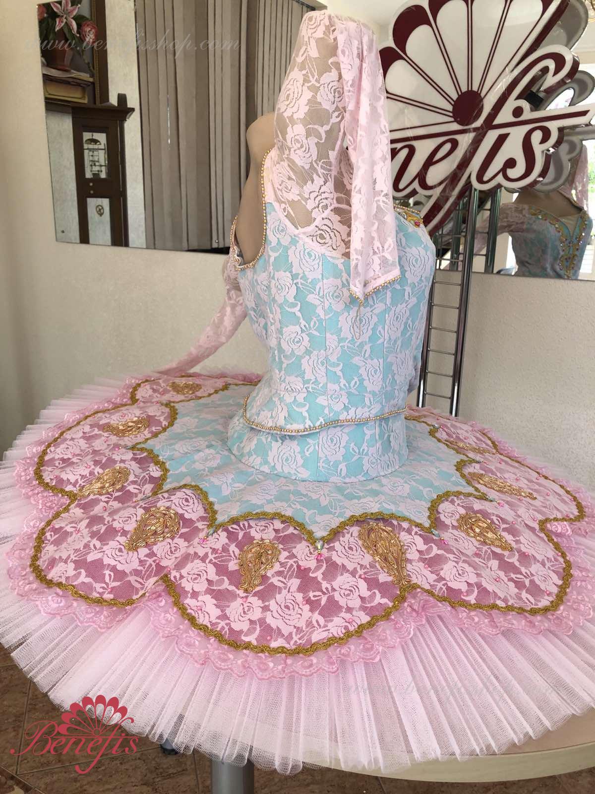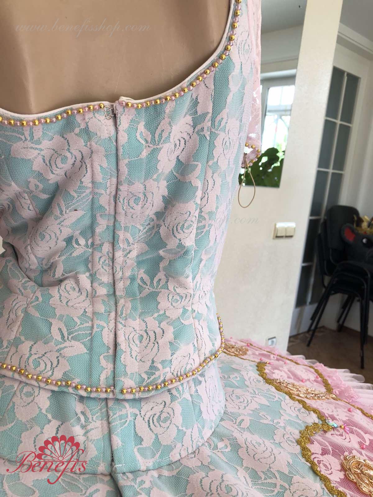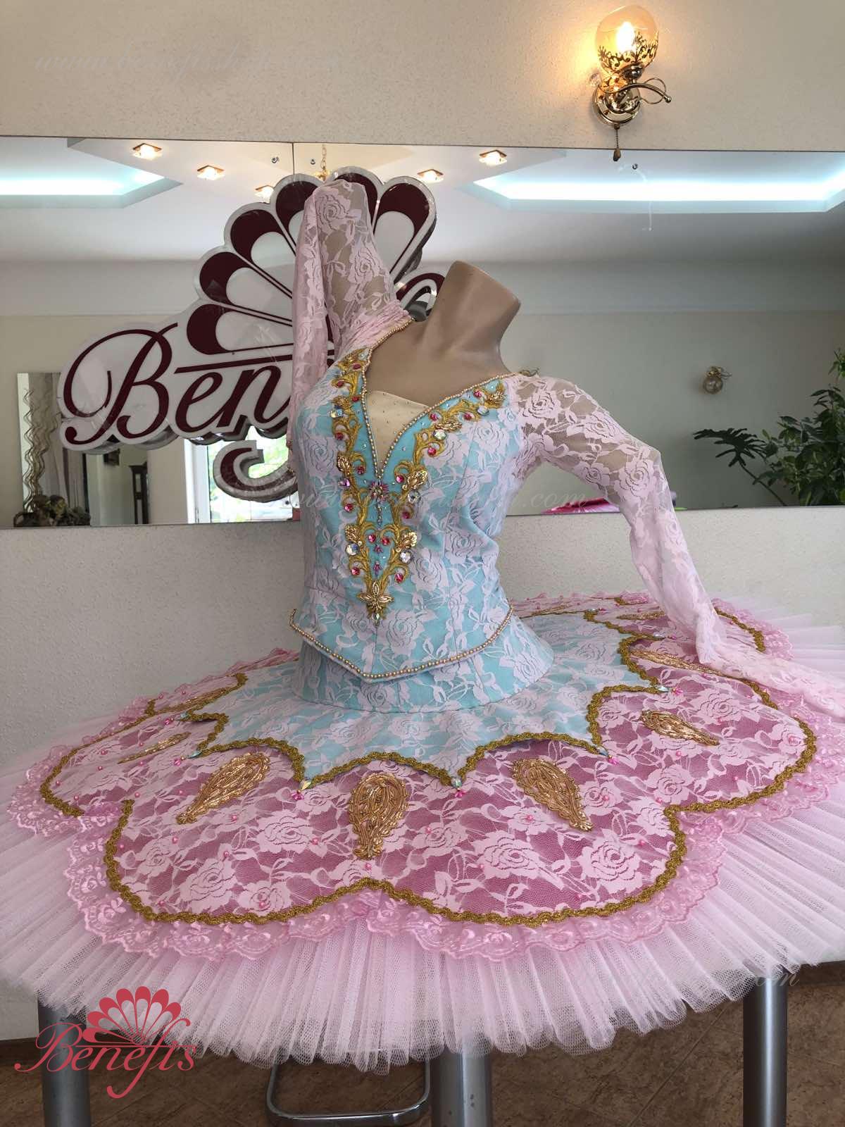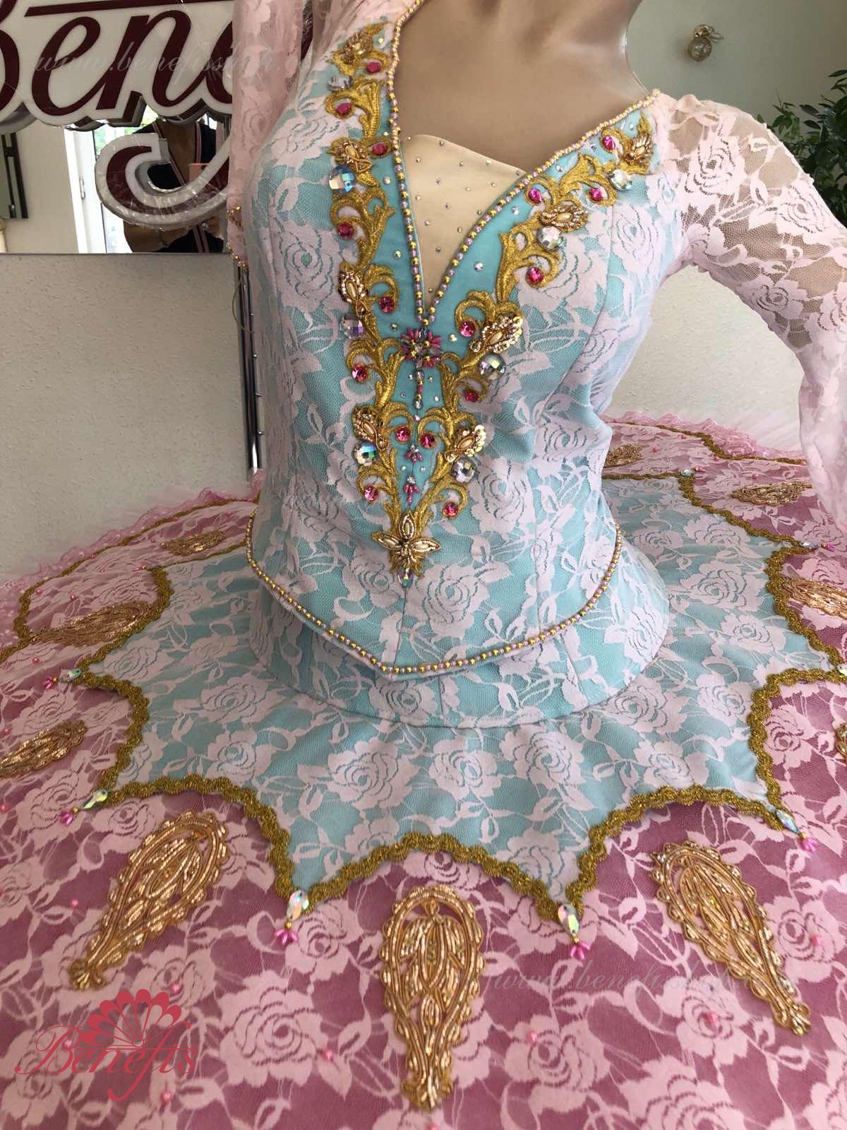 Este un costum de scena profesionist, care se face pe baza fustei de balet profesioniste # T0013. Corsetul este confectionat din tesatura semi-stretch si cu guipure dubla cu tocuri in forma de V in fata. Corsetul este fixat pe spate cu 2 rânduri de cârlige. Manșoanele sunt fabricate din guipure elastice. Fusta este realizata pe baza fustei de balet profesioniste T0001 cu margini coborate. Costumul este decorat cu aplicații, panglică, margele, dantelă, pietre și margele.