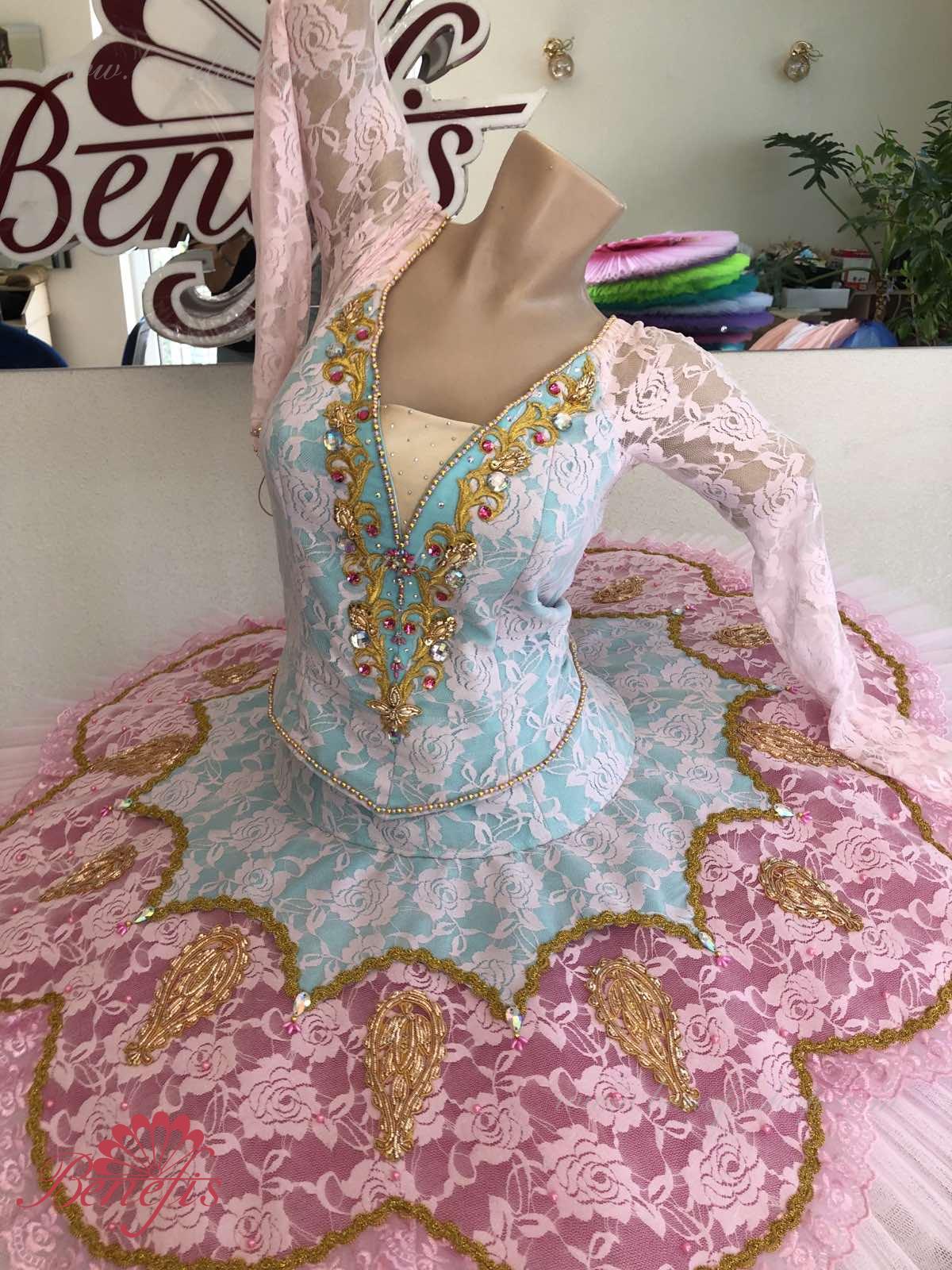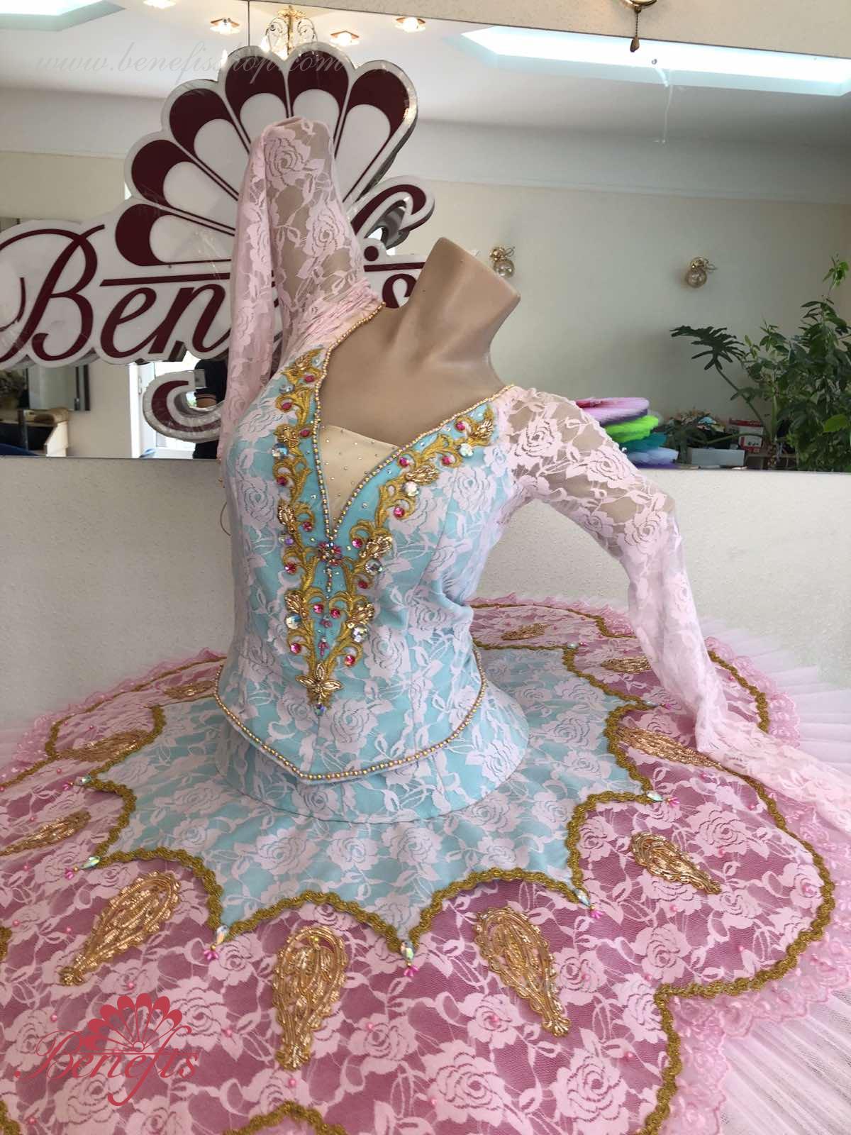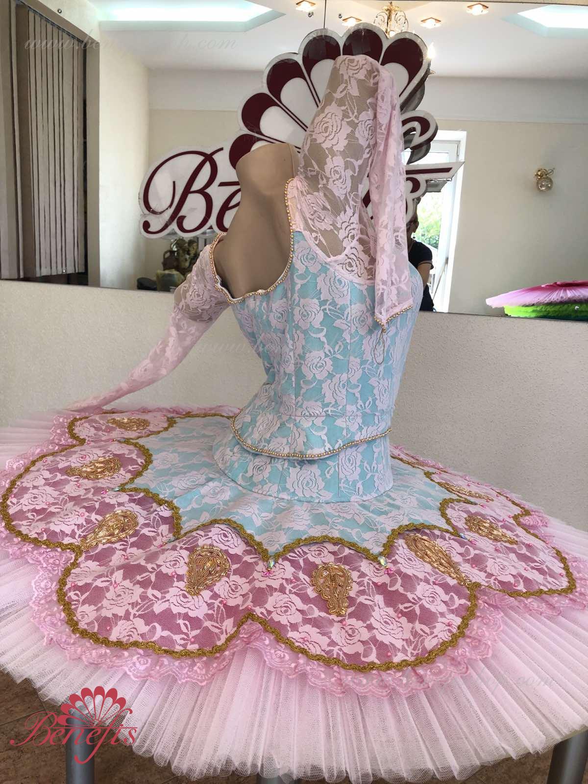 Este un costum de scena profesionist, care se face pe baza fustei de balet profesioniste # T0013. Corsetul este confectionat din tesatura semi-stretch si cu guipure dubla cu tocuri in forma de V in fata. Corsetul este fixat pe spate cu 2 rânduri de cârlige. Manșoanele sunt fabricate din guipure elastice. Fusta este realizata pe baza fustei de balet profesioniste T0001 cu margini coborate. Costumul este decorat cu aplicații, panglică, margele, dantelă, pietre și margele.