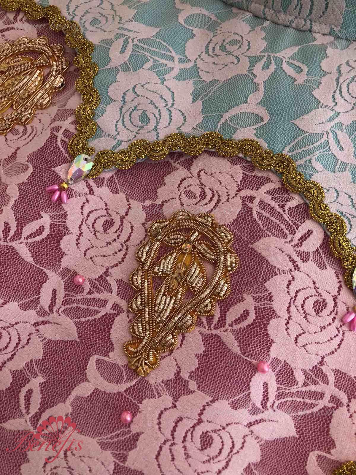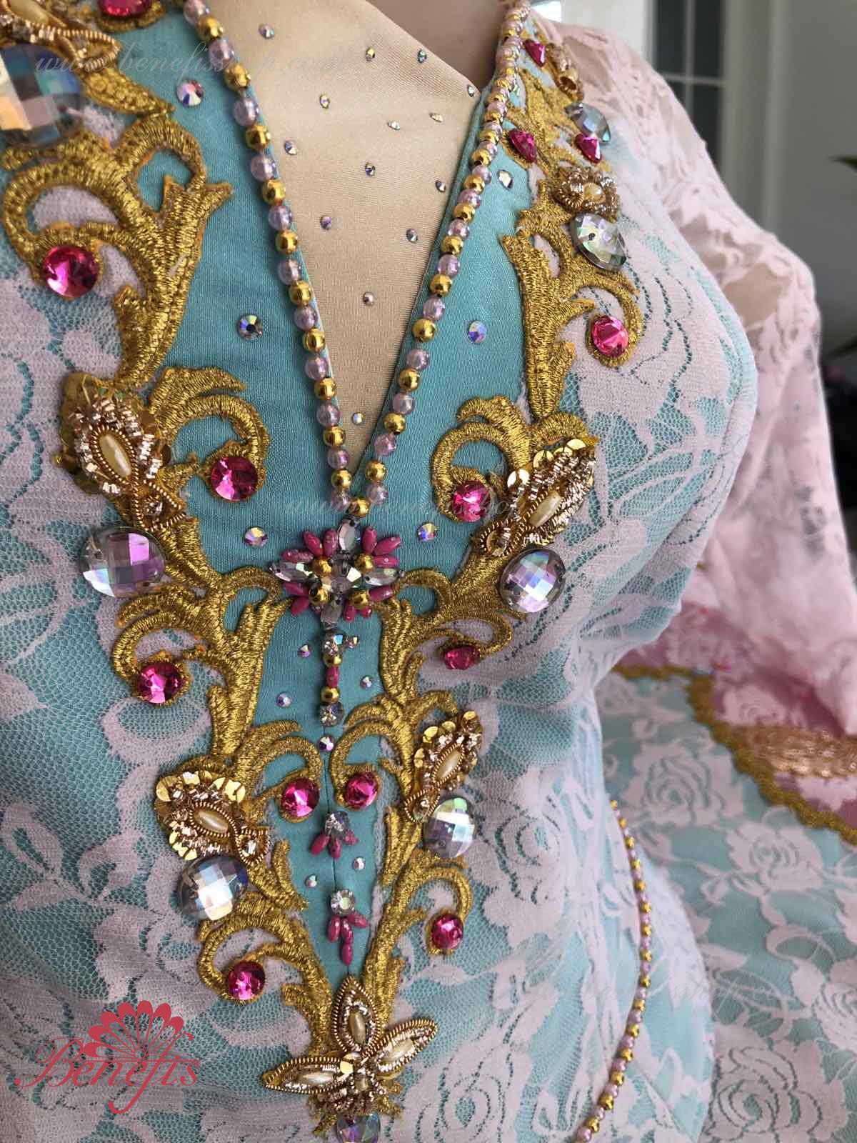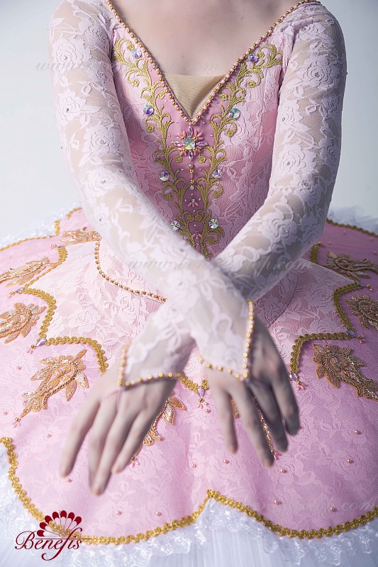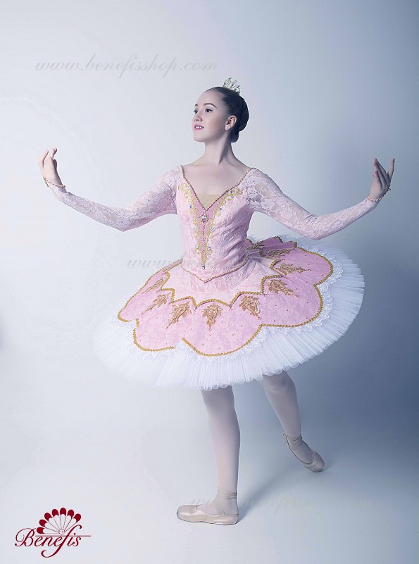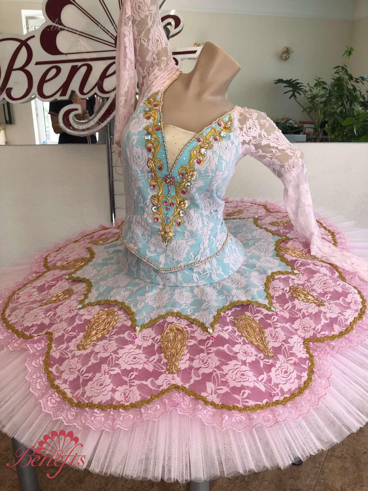 Este un costum de scena profesionist, care se face pe baza fustei de balet profesioniste # T0013. Corsetul este confectionat din tesatura semi-stretch si cu guipure dubla cu tocuri in forma de V in fata. Corsetul este fixat pe spate cu 2 rânduri de cârlige. Manșoanele sunt fabricate din guipure elastice. Fusta este realizata pe baza fustei de balet profesioniste T0001 cu margini coborate. Costumul este decorat cu aplicații, panglică, margele, dantelă, pietre și margele.