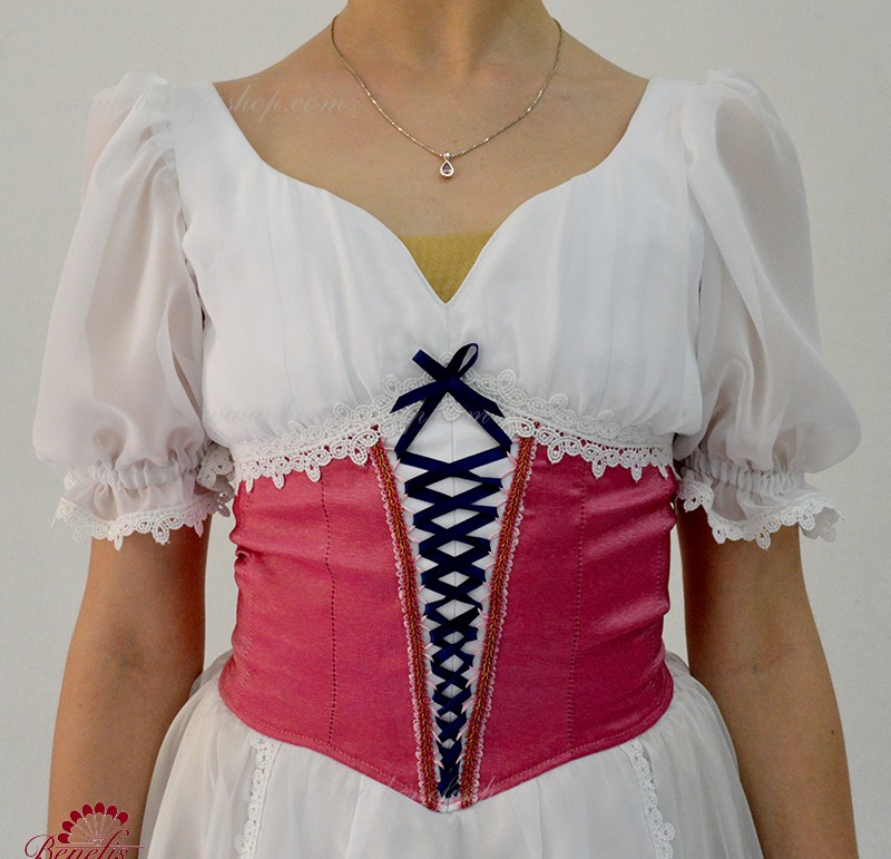 Costumul este format din corset dens din tesatura semi-stretch în două culori. Partea superioară a corsetului este dublat cu sifon usor cu mineci felinare.