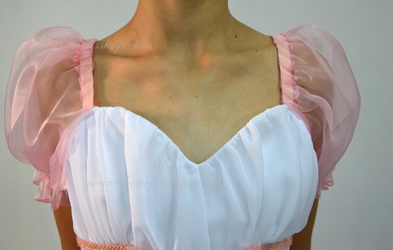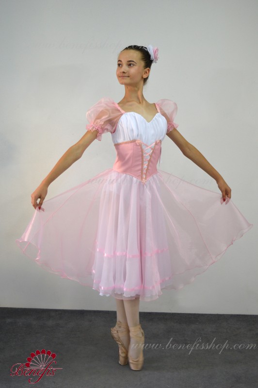 Acest costum profesional de balet de scenă este realizat din țesătură densă în două culori. Partea superioară a corsetului este duplicată cu șifon cu șireturi decorative în față. Închiderea din spate are două rânduri de cârlige. Fusta este formată din 2 straturi. Fusta superioară este decorată cu două panglici din satin în partea de jos.