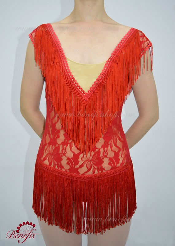 Acest model este realizat pe baza unui costum de baie din țesătură elastică, duplicat cu guipure și franjuri.