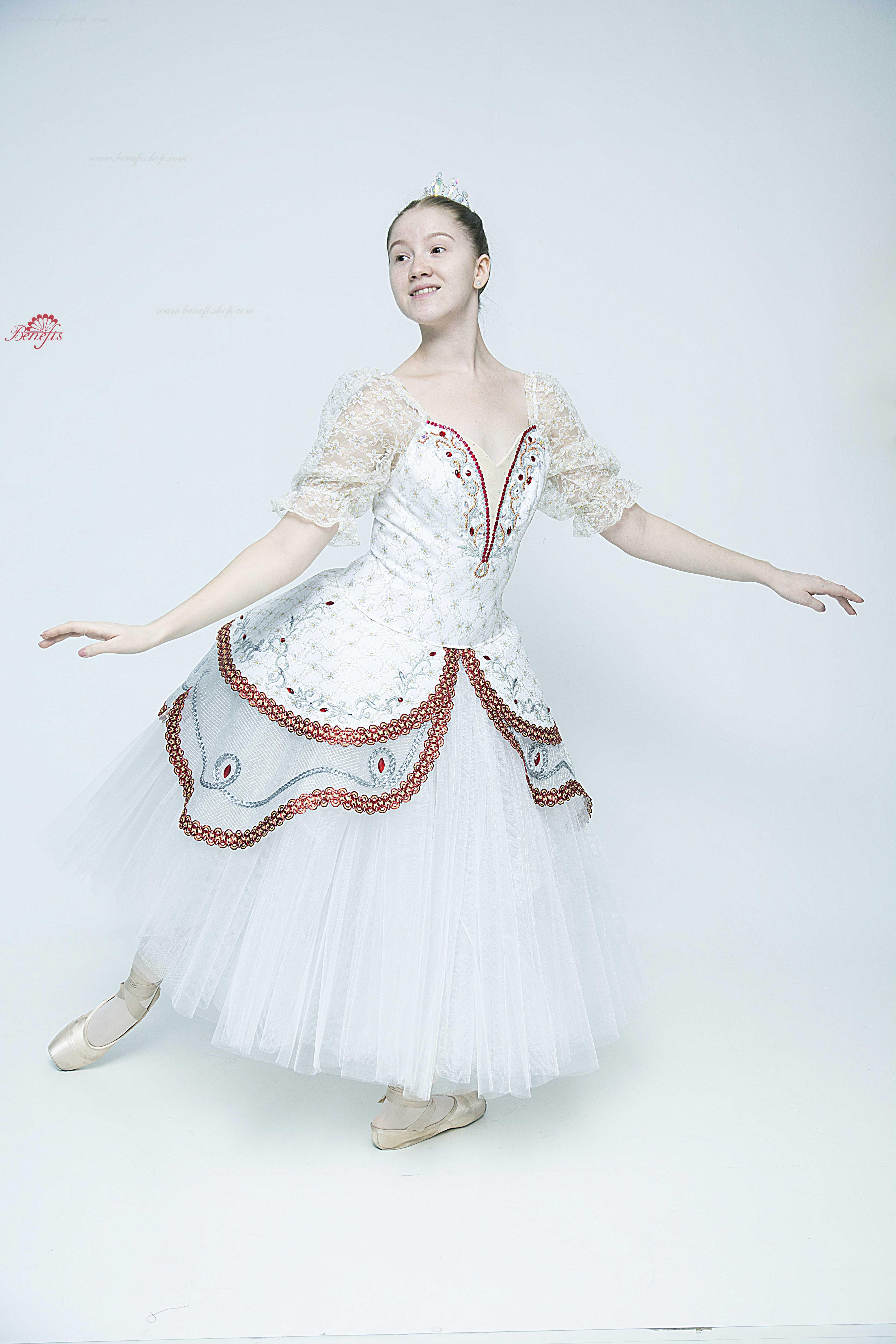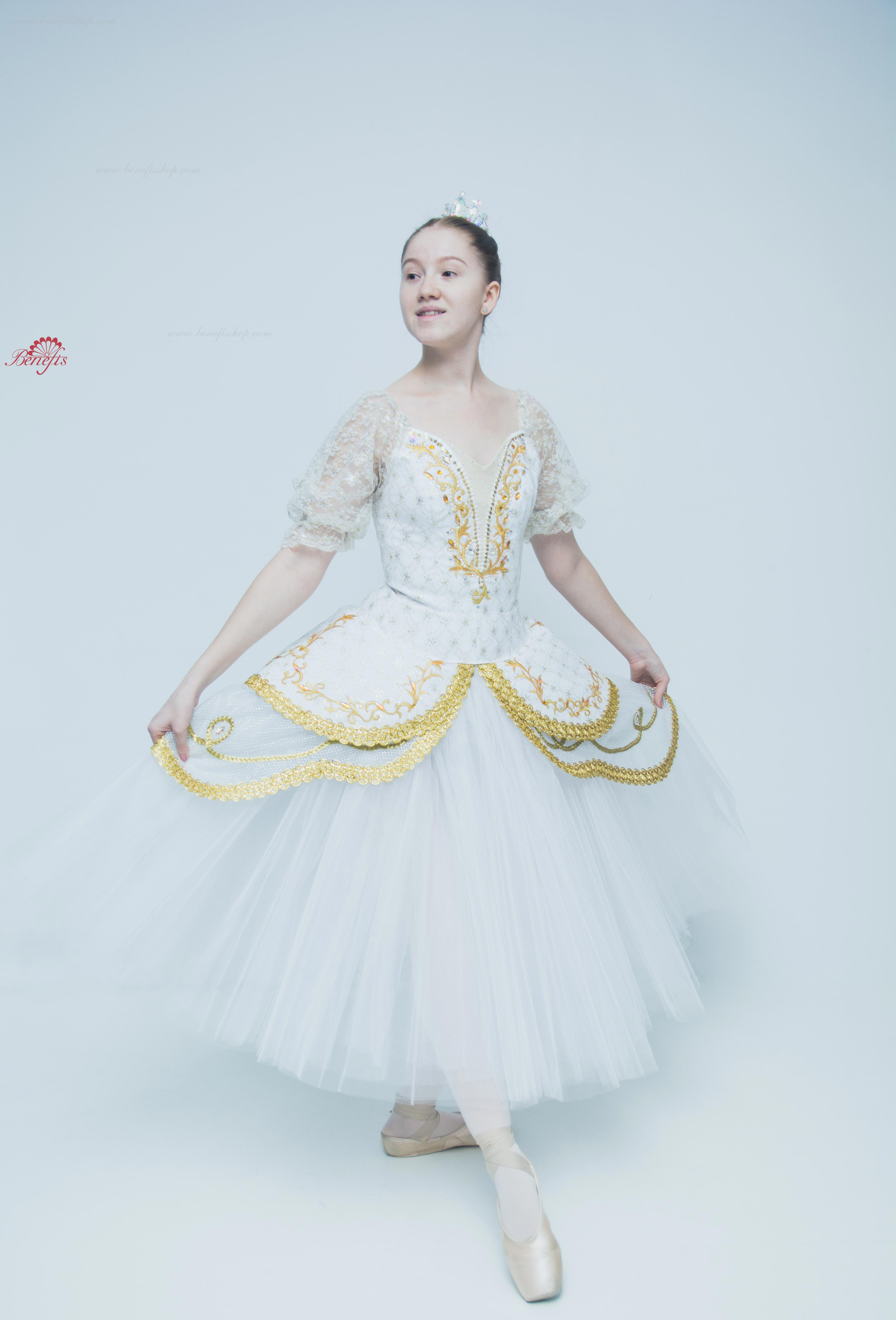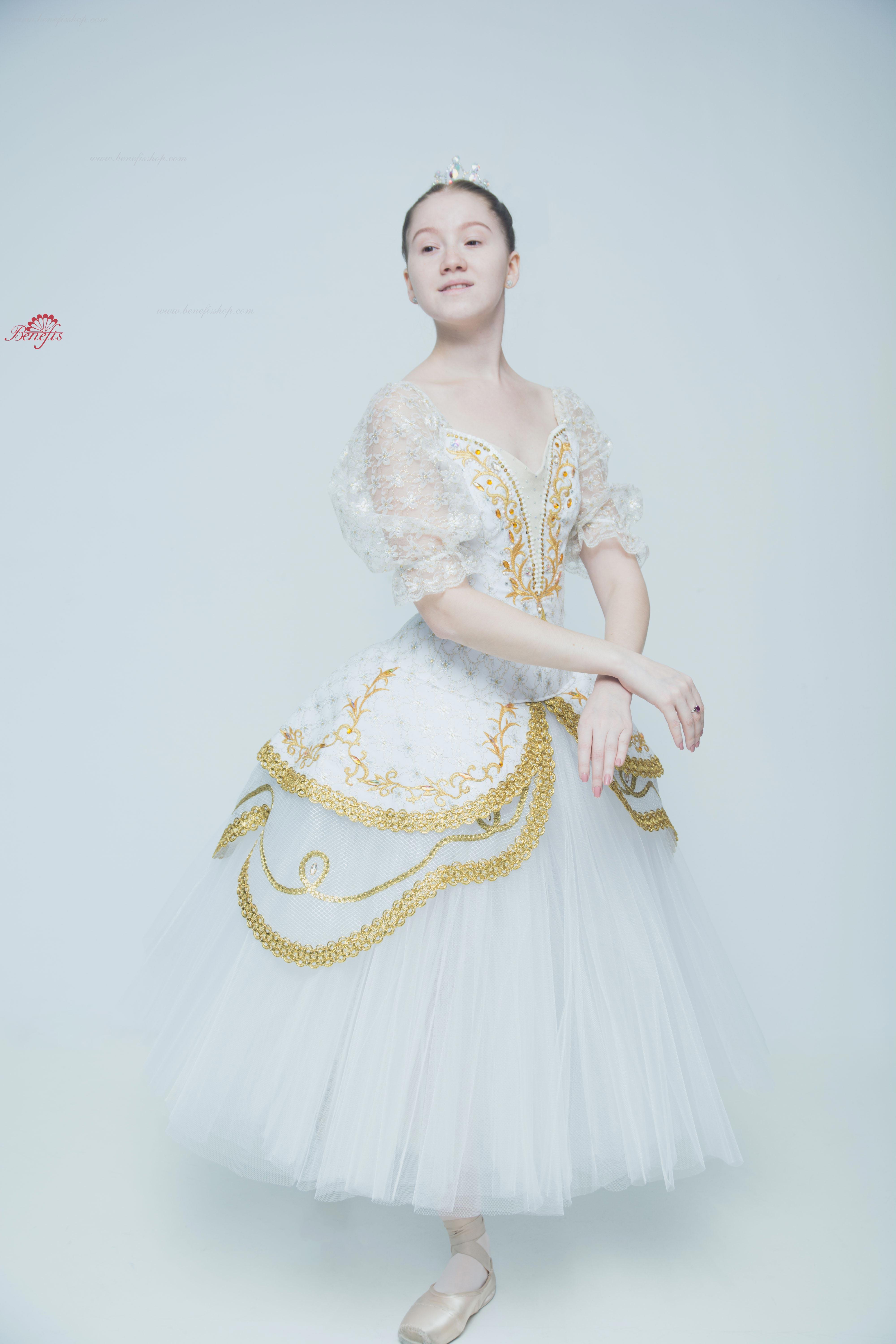 Acest costum profesional de scenă se bazează pe fusta de bază profesională T 0003. Corsetul este confecționat din țesătură semi-elastică duplicată cu guipure cu inserție de culoare bej pe piept, mânecile felinarului sunt din guipure.