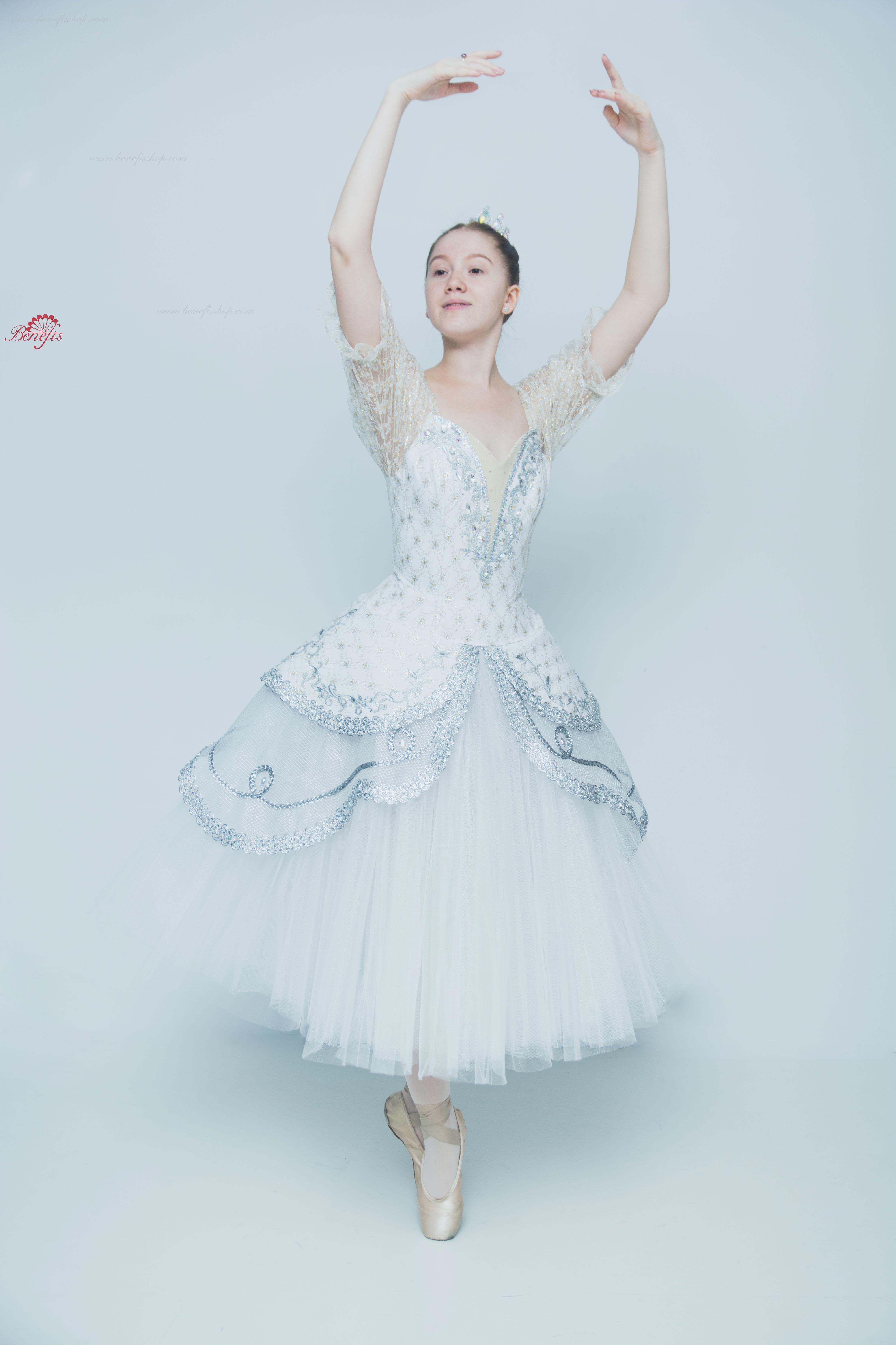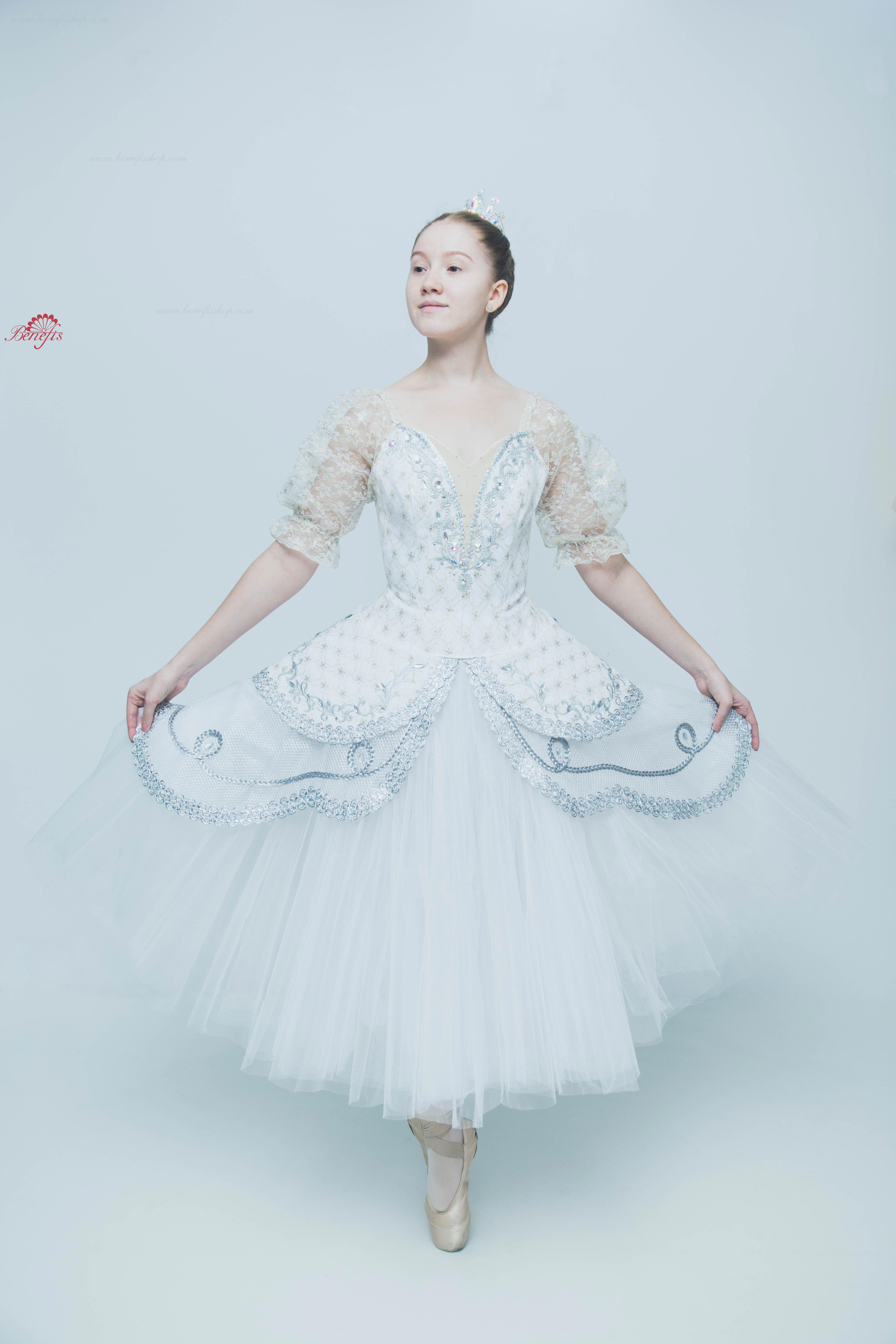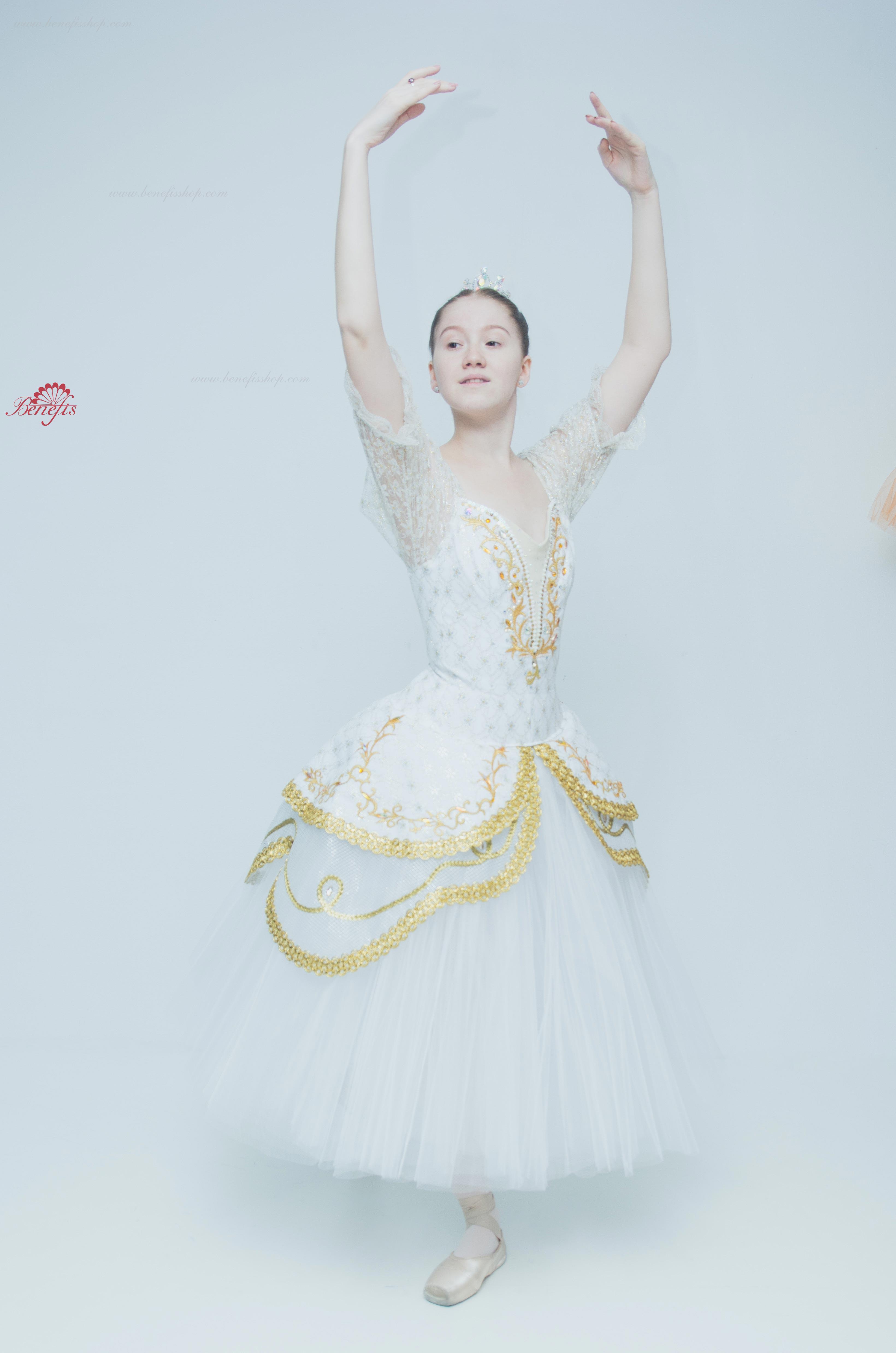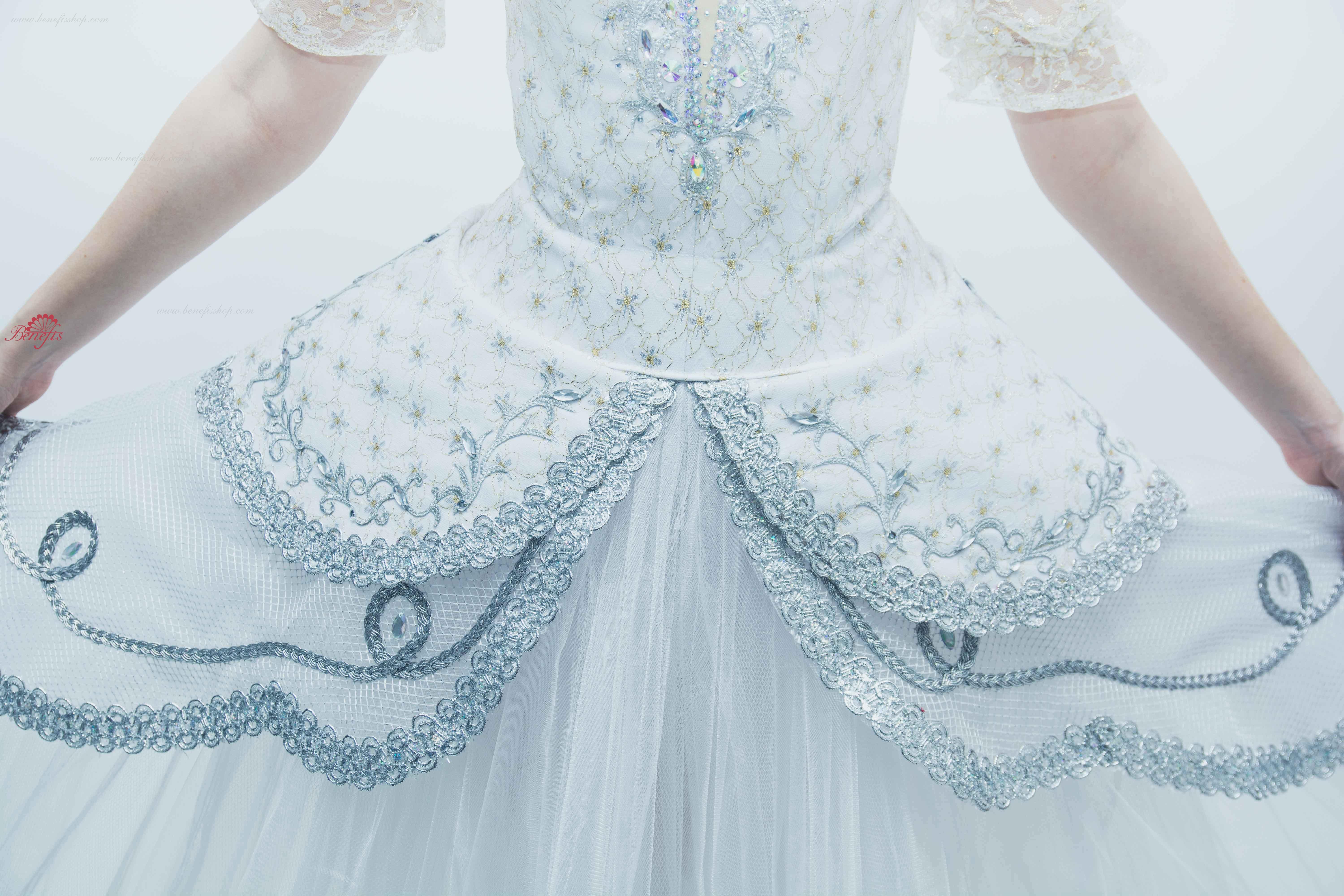 Acest costum profesional de scenă se bazează pe fusta de bază profesională T 0003. Corsetul este confecționat din țesătură semi-elastică duplicată cu guipure cu inserție de culoare bej pe piept, mânecile felinarului sunt din guipure.
