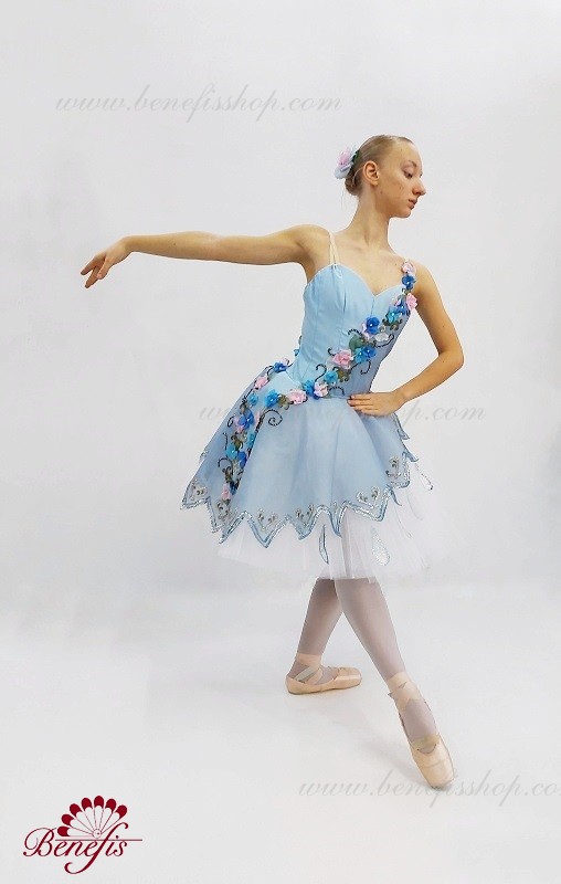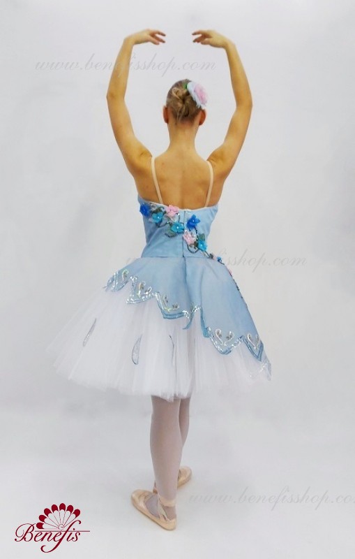 Acest costum de balet profesional este realizat pe baza unui tutu de bază profesional # T 0003( vezi secțiunea"fuste de balet de bază și de repetiție").Corset fără pelerină + inserție din tul. Acesta fusta de bază romantica aerisit este formata din șase straturi de tul moale și dur, realizate dintr-o varietate de pene. Toate straturile sunt plantate pe chiloți de tul. Chiloții sunt conectați la un jug de tul (7 cm) atașat la o centură elastică.