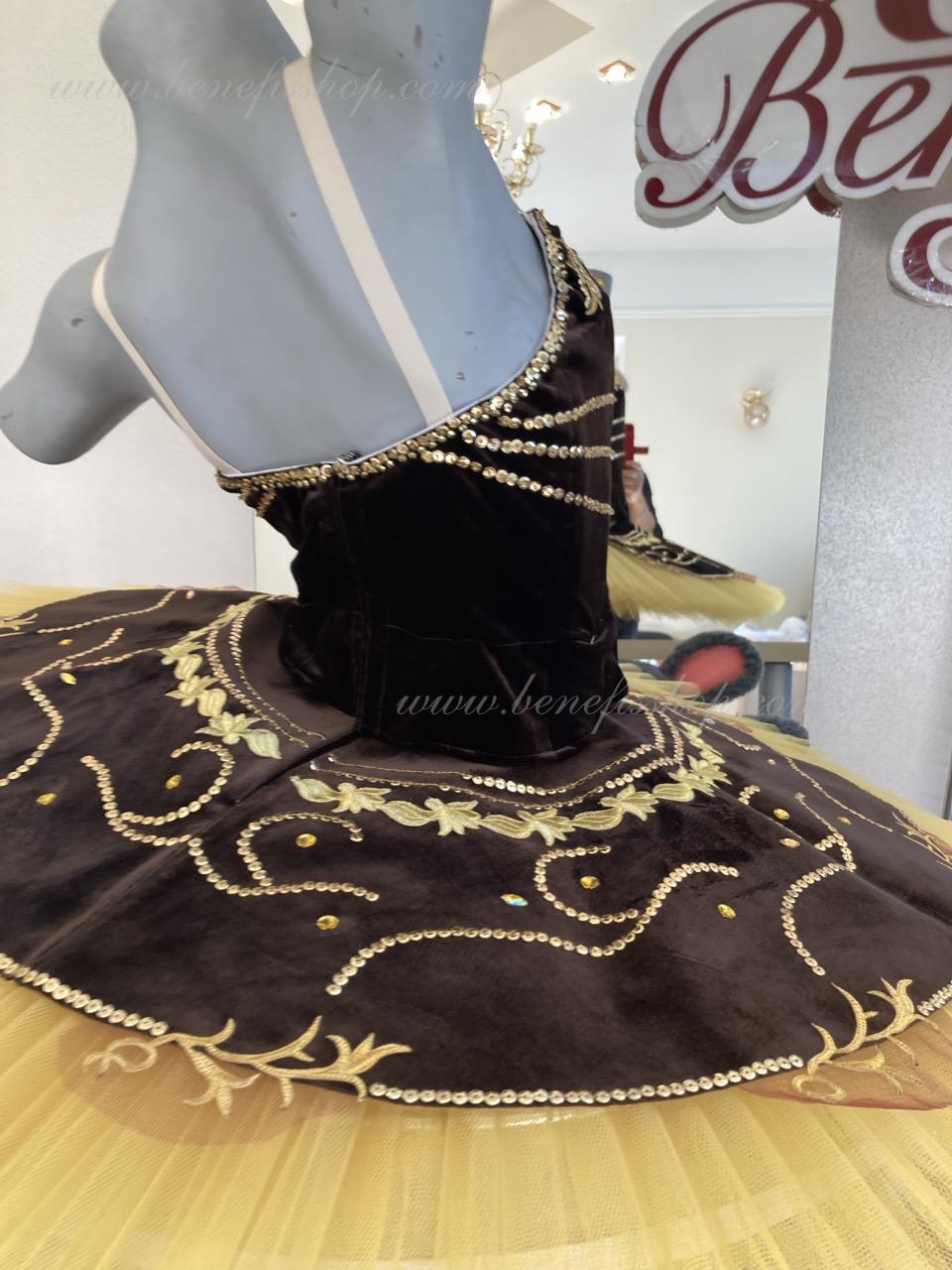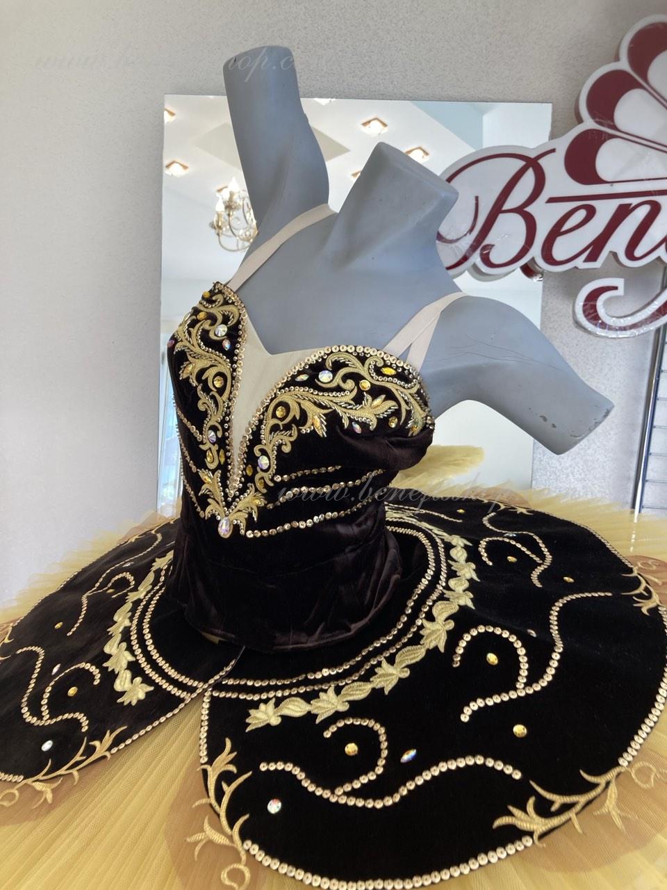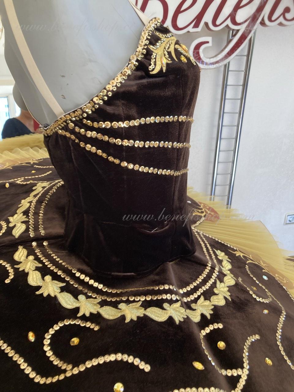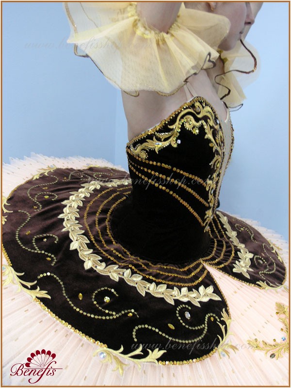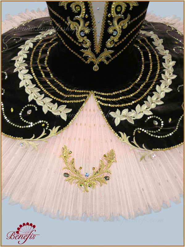 Costum de scena profesionist. Este confectionat in baza fustei de balet profesioniste #T0001B (vezi compartimentul „Fuste de balet de baza”).Corsetul și anvelopa sunt confecționate din material semielastic.