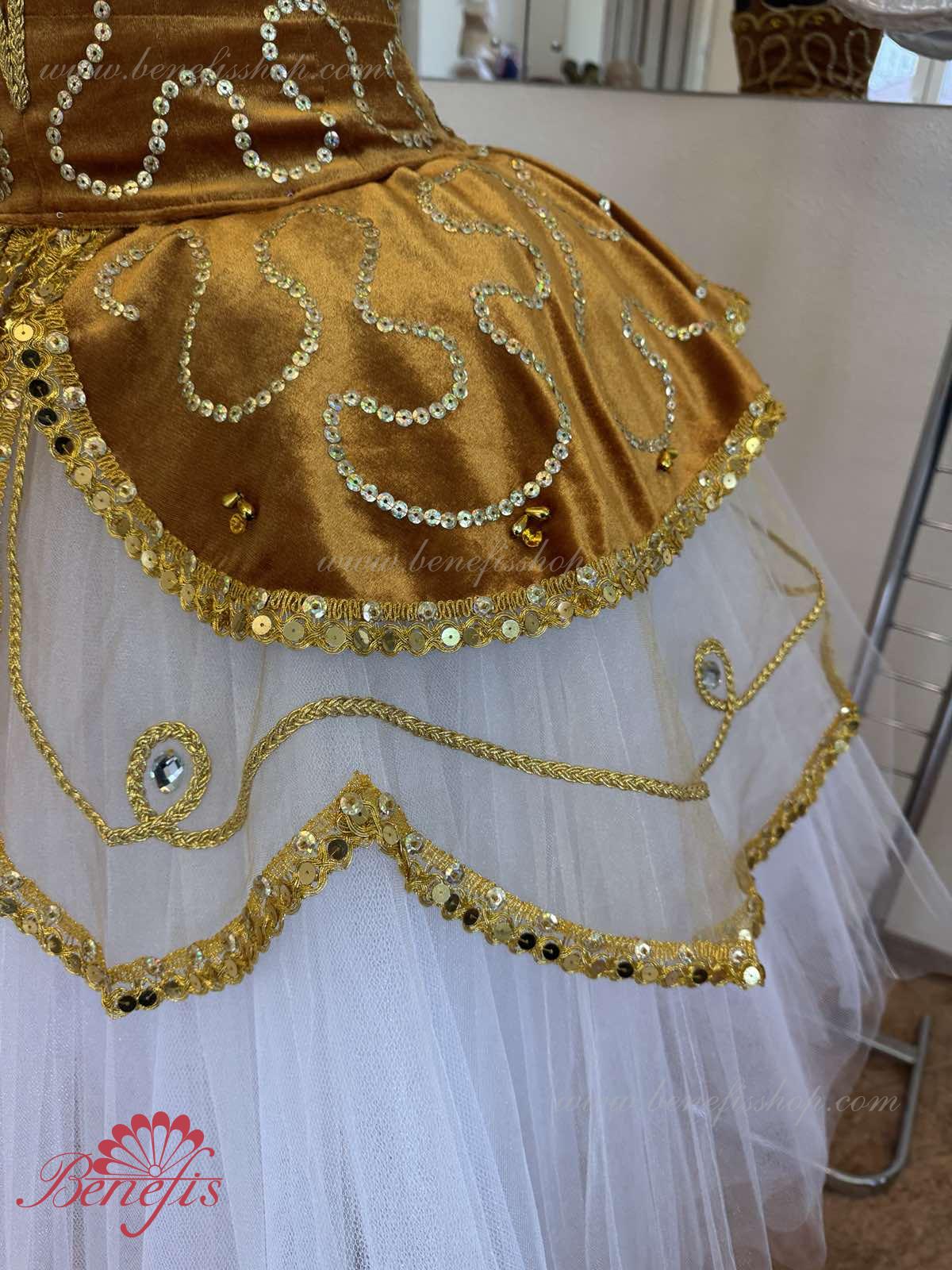 Costumul se potriveste perfect pentru variatii Pas de Trois din piesa de balet „Lacul Lebedelor” si poate fi la fel utilizat ca costumul Reginei si Cenuseresei.