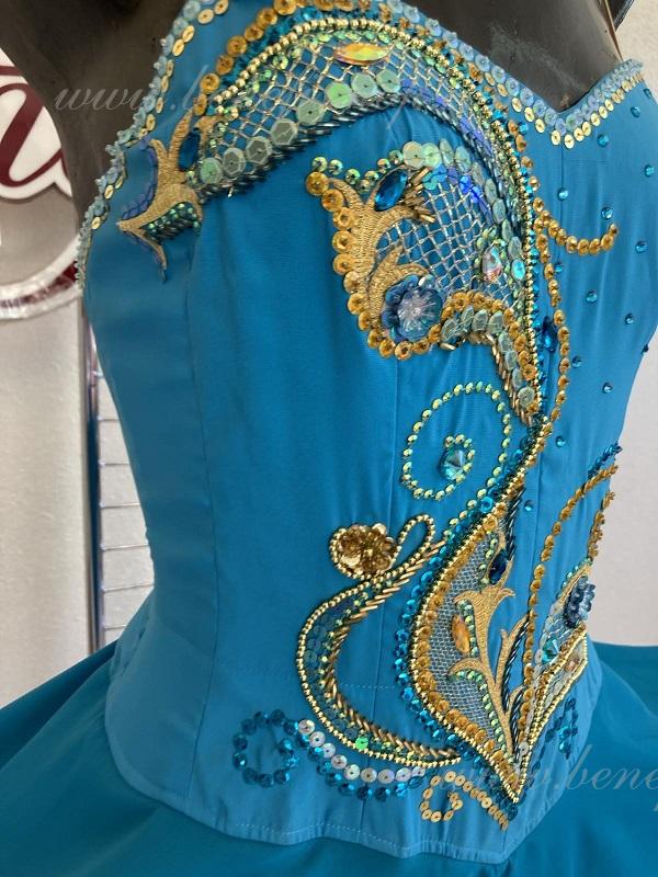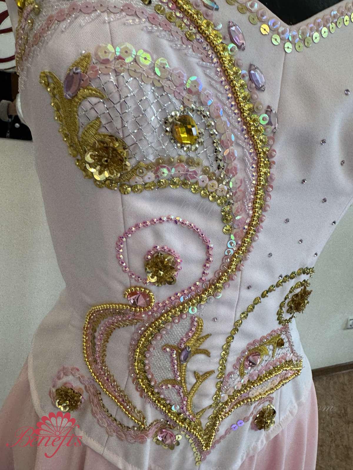 Corsetul este bogat decorat cu aplicații, decorat cu împletitură, strasuri, paiete și mărgele și fixat cu cârlige la spate. O mulțime de paiete strălucitoare sunt folosite pentru a decora fusta.