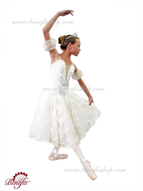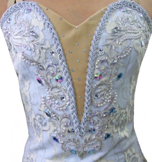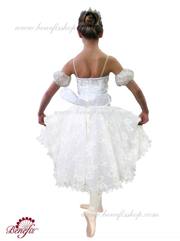 Detalii: costum.Corsetul este confectionat din tesatura densa semi-stretch,duplicat de guipure. Pe corset sunt prezente doua rinduri de chirlige pentru regularea comoda si un snur intern pentru stringerea corsetului la nivelul pieptului.Pe piept se intrevede o insertie de culoarea pielii. Chingele sunt de culoarea pielii.Fusta este din 3 sloiuri de tul, stratul superior este din guipure. Mânecile sunt felinare și aripi.
