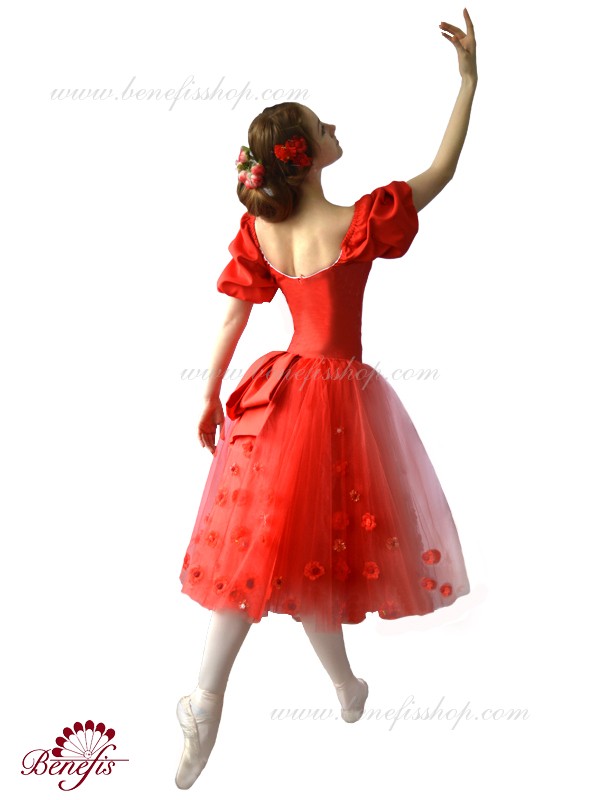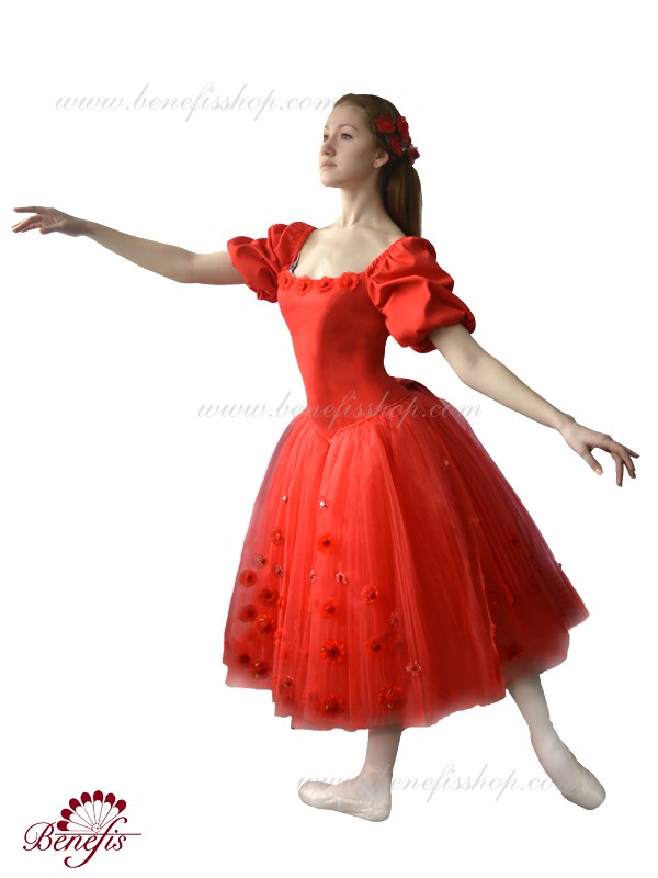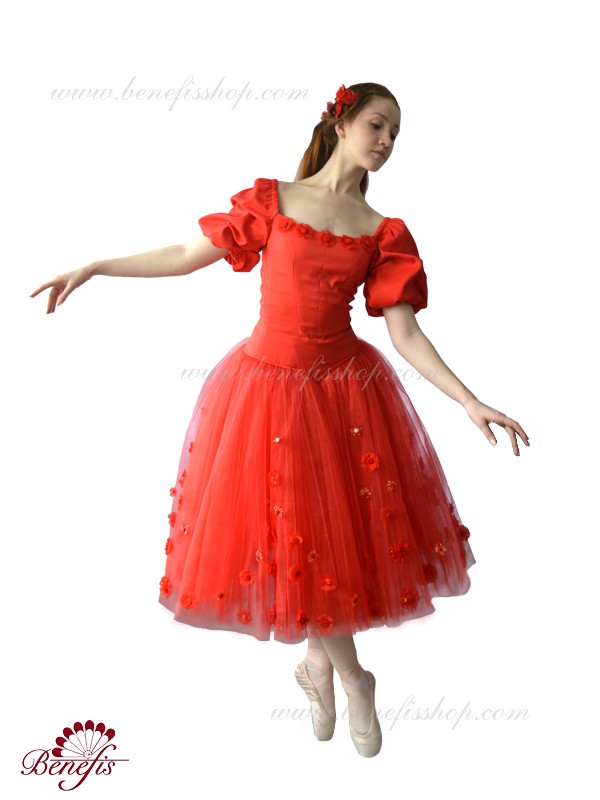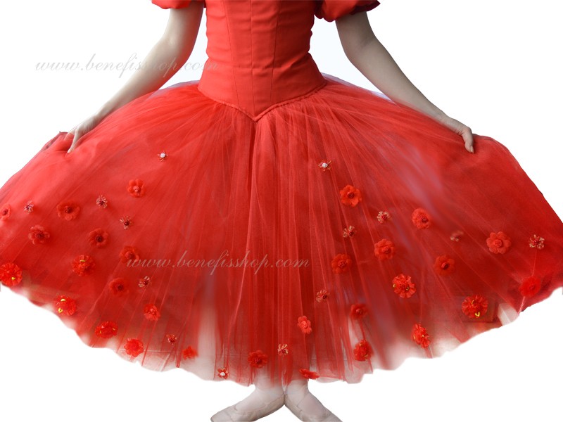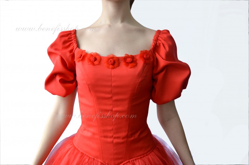 Acest costum de balet este confectoionat pe baza modelului T0003. Corsetul este confectionat din tesatura densa semi-stretch. Pe corset sunt prezente doua rinduri de carlige pentru regularea comoda si un snur intern pentru imbaierarea corsetului la nivelul pieptului. Manecele in forma de lampioane sunt atasate de corset. In calitate de decor sunt folosite flori artificiale.