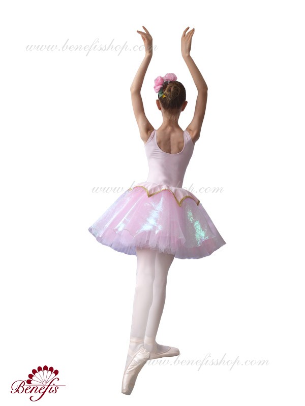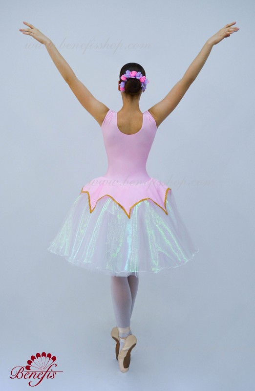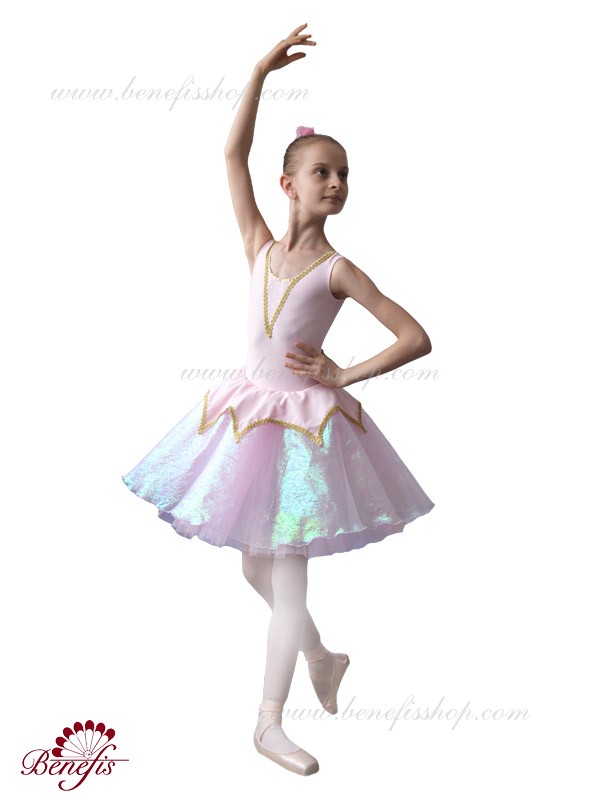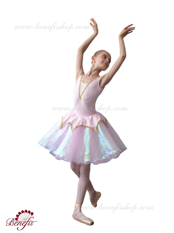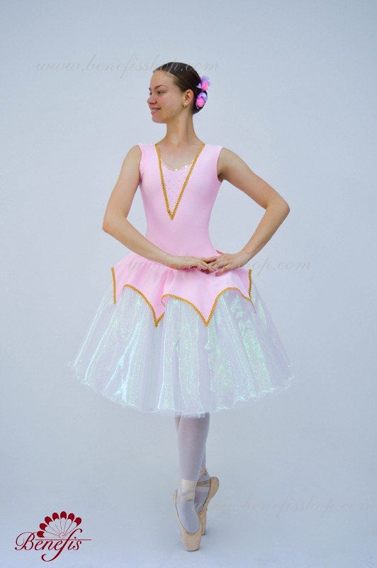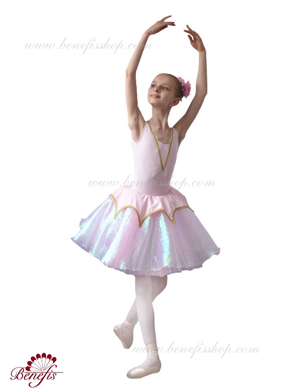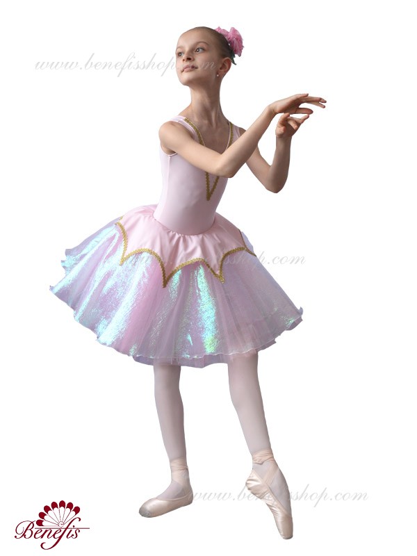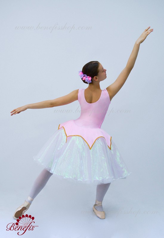 Costumul de baie este fabricat din supplex. Pe partea din față a costumului de baie este un decor de panglică în formă de V. Fusta - consta din 3 straturi de tul. Stratul superior este fabricat din organza cu pulverizare. Deasupra fustei unei cochete a supplexului. Produsul utilizează decor, panglică și pietre.