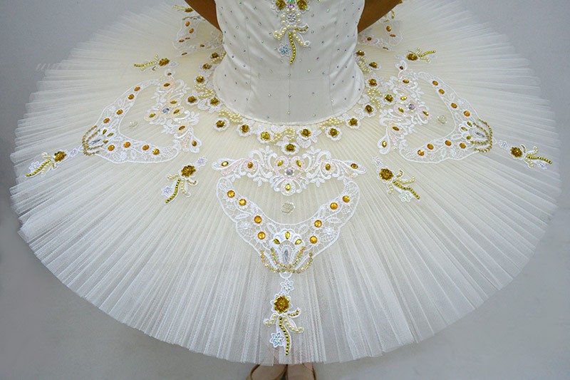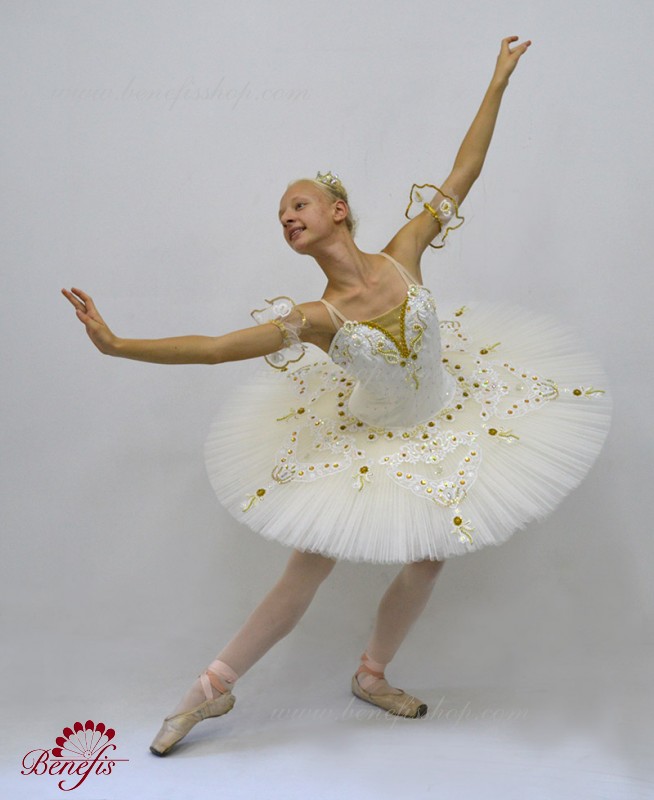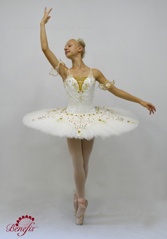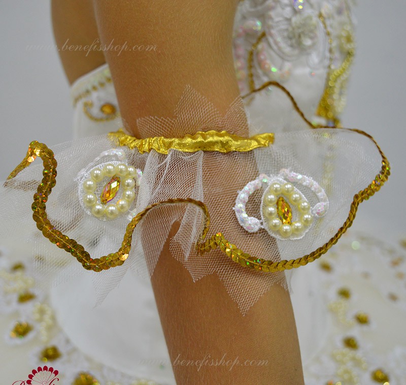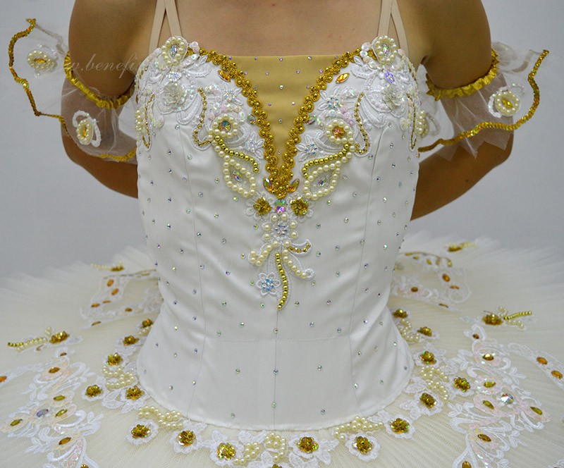 Costum de scena profesionist realizat pe baza fustei de balet de baza T0001B. Corsetul este confectionat pe baza corsetului de baza T0009. Decorul este realizat din aplicatii si ghipura si este de asemenea decorat cu pietre, margele, paiete si margele.
