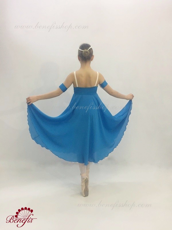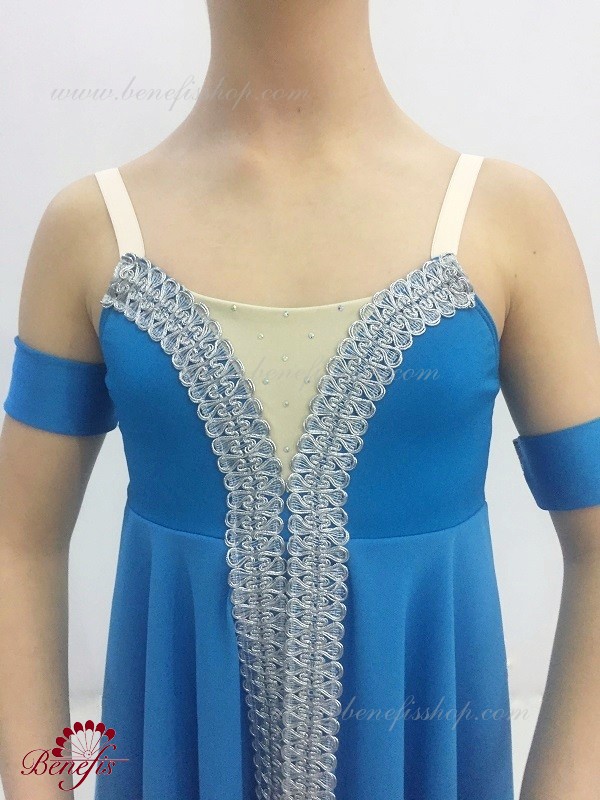Acest costum profesionist de balet este realizat pe baza unei fuste de viscoză cu o potrivire. Un costum de baie cu căptușeală și vârf A0001b. Costumul de baie poate fi confecționat din țesătură biflex (100% lycra) sau țesătură elastică din bumbac (85% bumbac, 15% lycra). Paiete și împletitură au fost folosite ca decor de costum.