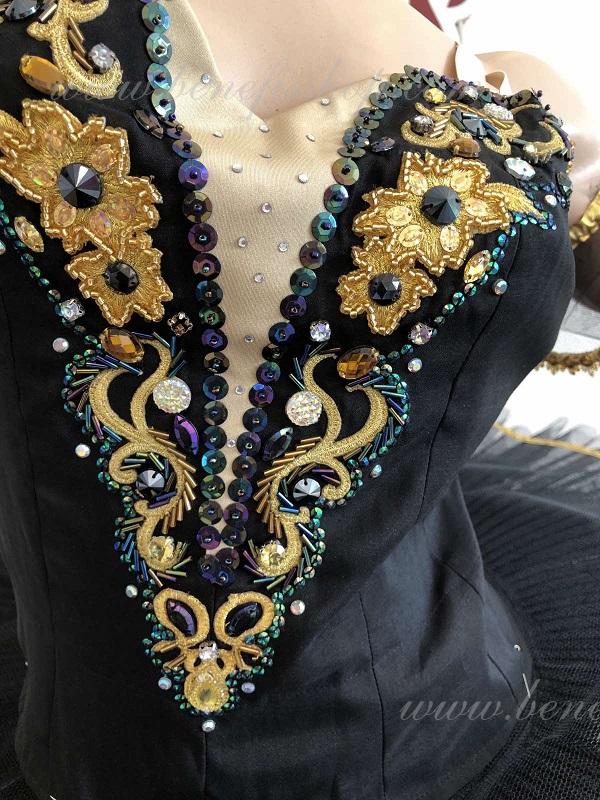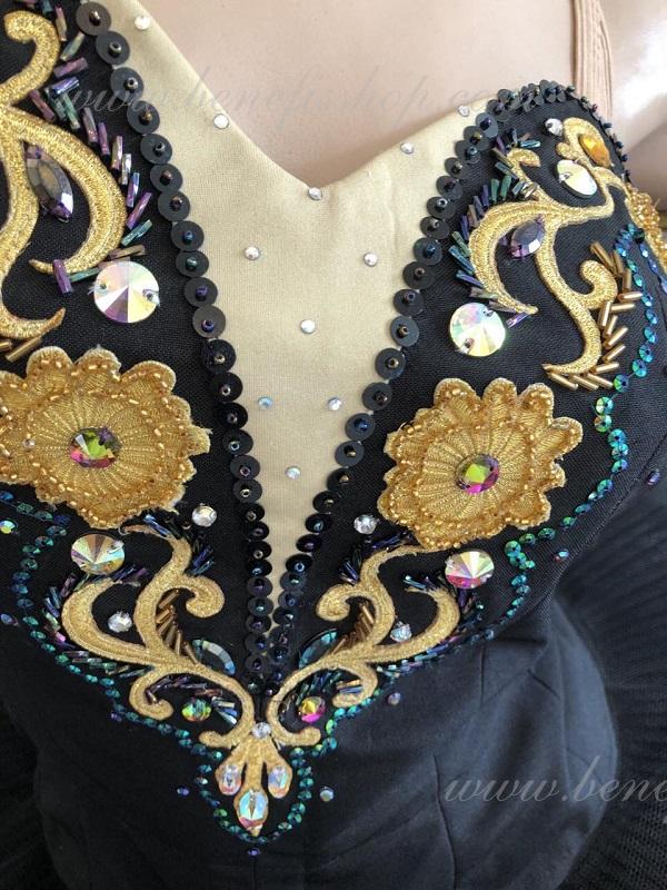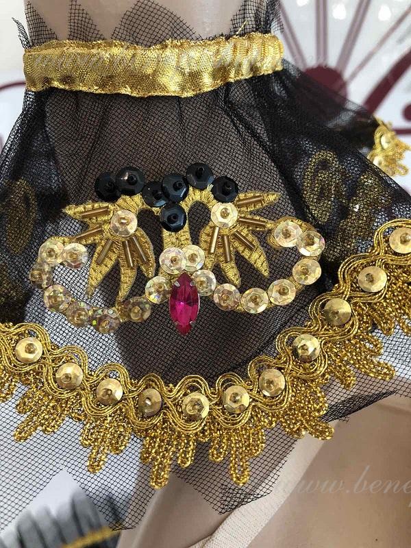 In calitate de decor, sunt folosite aplicatii de aur, margele marunte de sticla, strase aurii si negre, un numar mare de paiete cu holograma, panglica aurie.