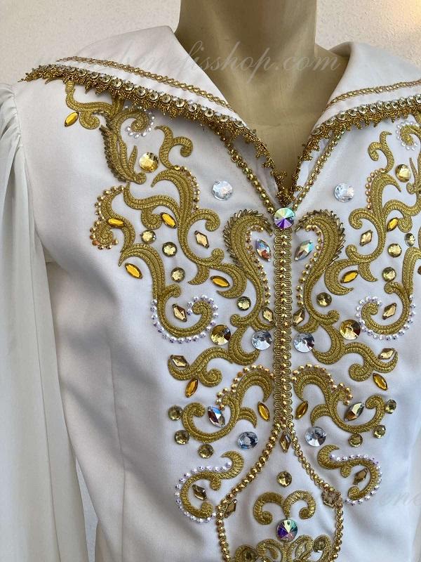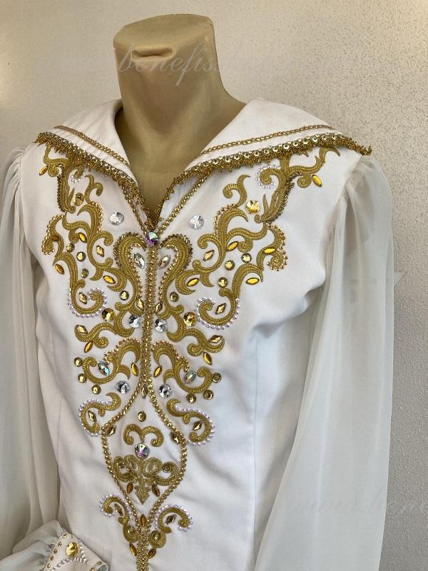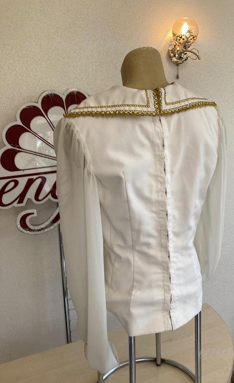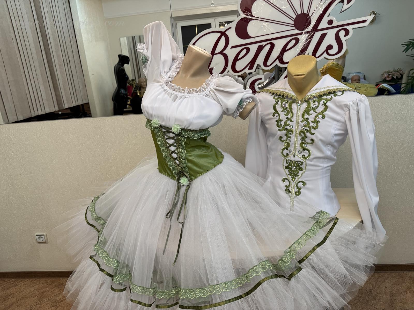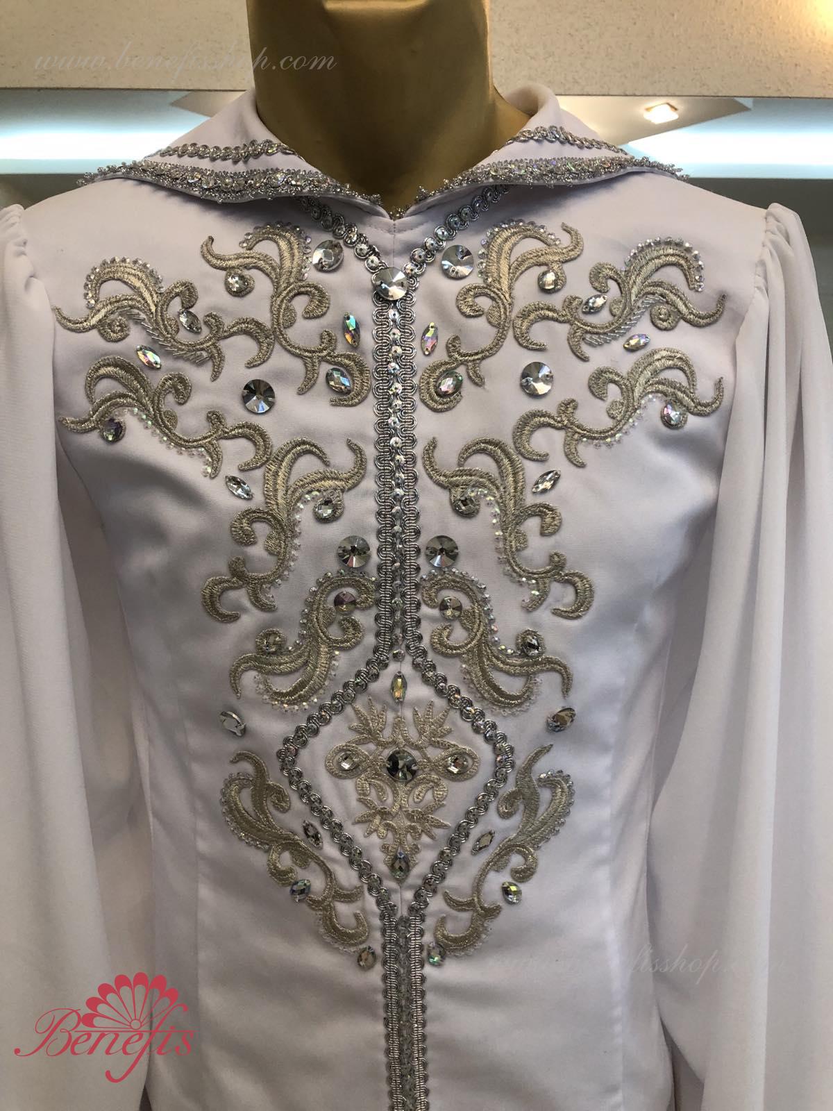 Costumul de barbat este fabricar dintr-o tesatura densa cu mineci de sifon si guler rasfrint. Se incheie in spate pe cirlige. Decorul bogat pe intreaga lungime a jacketului este compus din nenumarate applicatii, strase, paiete. Gulerul rasfrint subliniaza aspectul elegant al costumului. Mansetele din sifon ale minecilor sunt decorate cu paiete si strase si se incheie cu nituri. Acest costum este folosit la parti lirice si variatii clasice de balet.