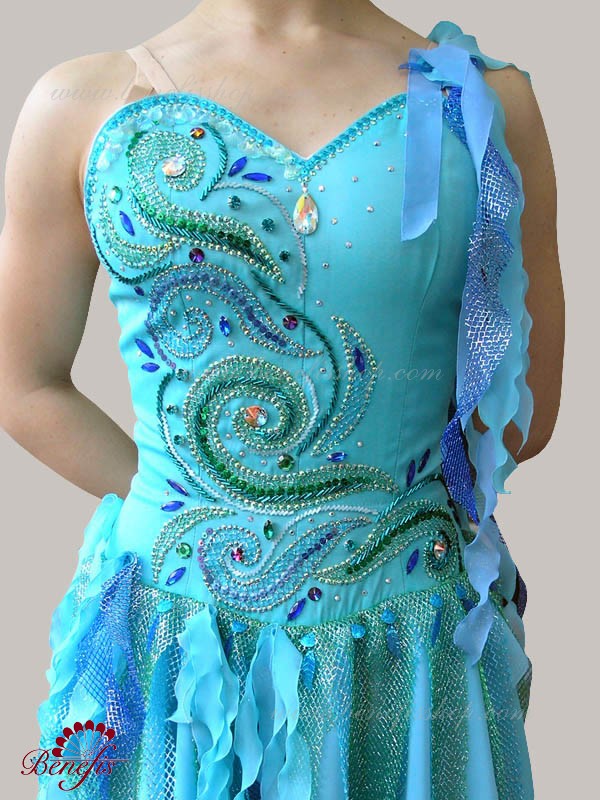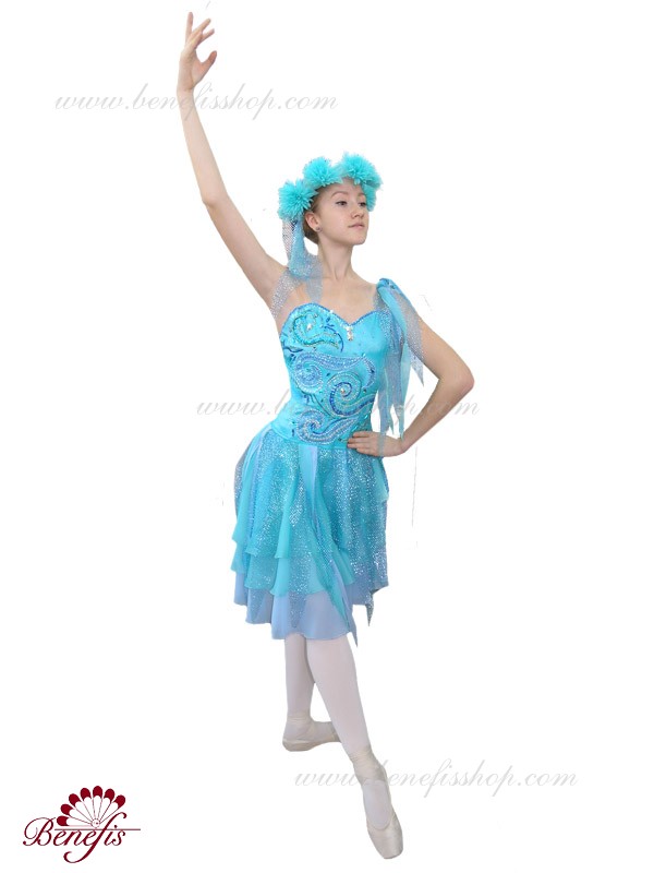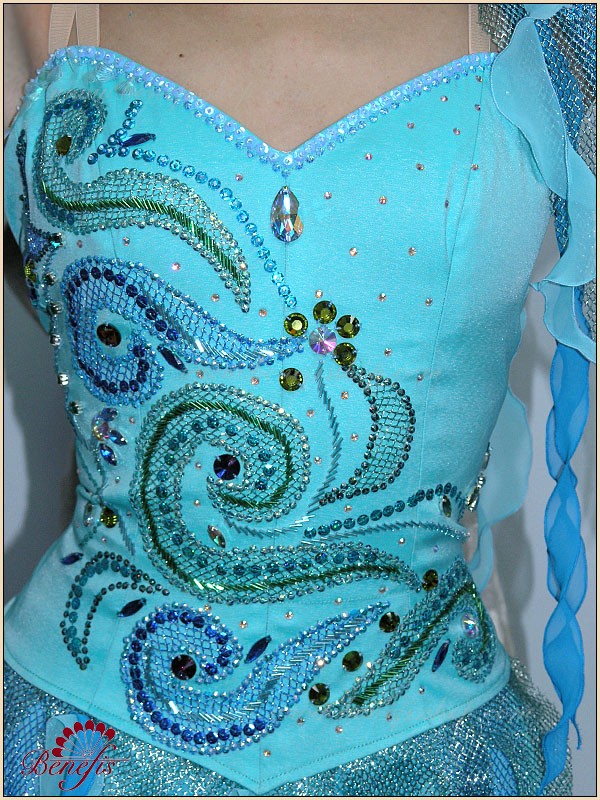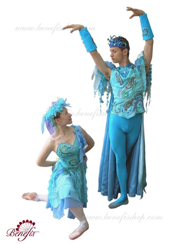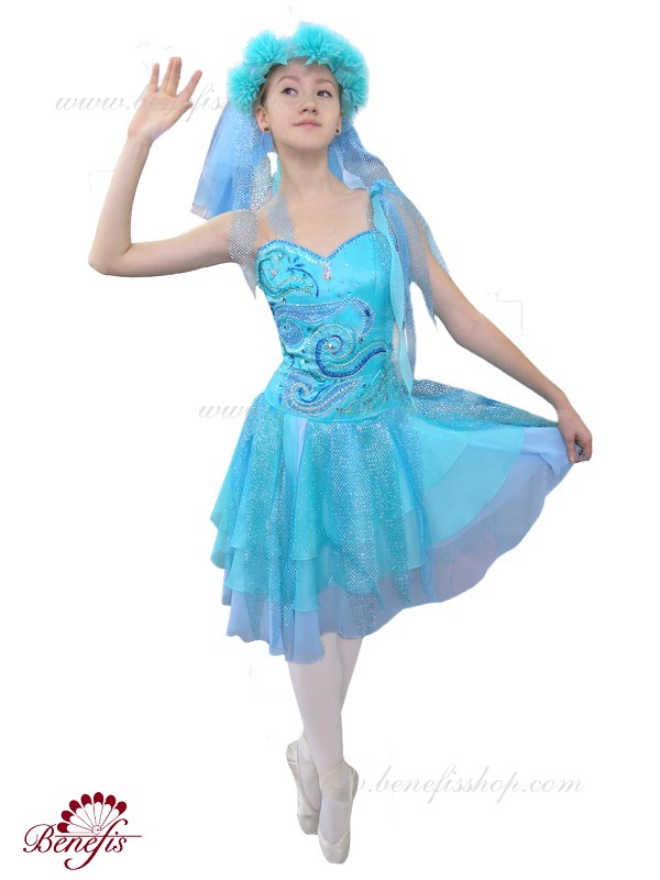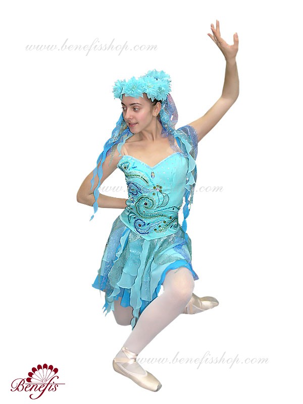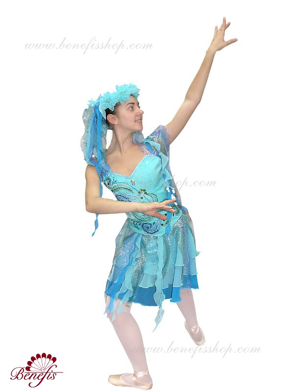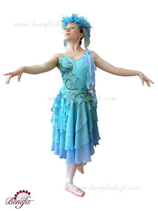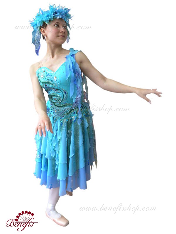 Corsetul este este indeplinit dintr-o tesatura densa si se incheie pe cirlige pe spate. Decorul bogat al corsetului cusut pe diagonala, este compus dintr-o multime de paiete, strase, precum si din panglica si applicatii din tesatura – plasa. Pe un umar, sunt cusute panglici din plasa si din sifon, frumos ciselate, ce aduc aminte de alge marine. Decorul corsetului si fustei dupa culoarea si stilul sau se aseamana cu lumea submarina. Fusta de sifon in citeva straturi este infrumusetata cu panglici din sifon si tesatura – plasa. Obada este indeplinita in forma de coroana din flori artificiale si panglici de tesatura-plasa. Costumul este folosit in baletul “Napoli” sau ca costum pentru scena.
