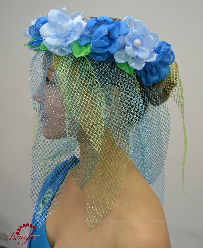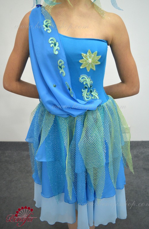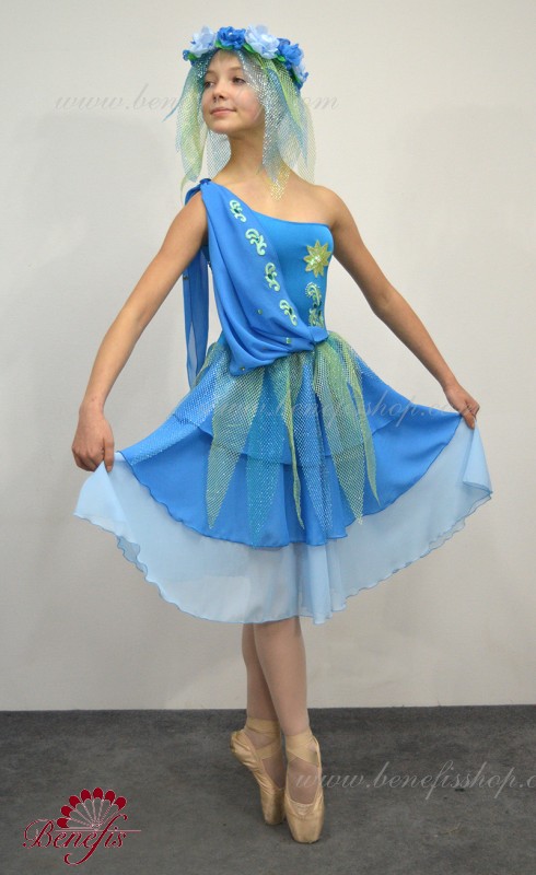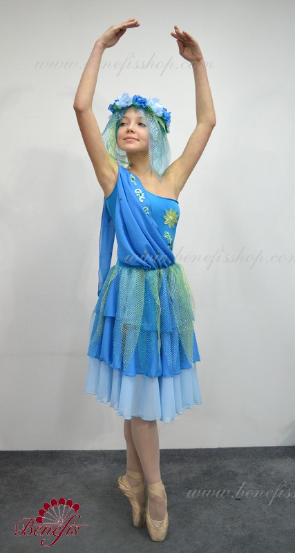 Rochia este indeplinita in baza de tricou din supplex cu un umar. Decorul bogat al corsetului este compus dintr-o multime de paiete, strase, precum si din panglica si applicatii. Esarfa larga, decorata cu aplicatii, paiete, strase, ofera costumului un aspect elegant. Ea este atasata de umar cu un nasture frumos impodobit. Decorul corsetului si fustei dupa culoarea si stilul sau se aseamana cu lumea submarina. Fusta de sifon in citeva straturi este infrumusetata cu panglici din sifon si tesatura – plasa. Obada este indeplinita in forma de coroana din flori artificiale si panglici de tesatura-plasa. Costumul este folosit in baletul “Napoli” sau ca costum pentru scena.