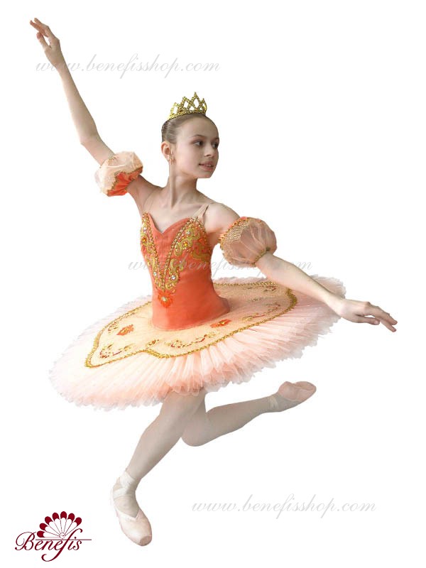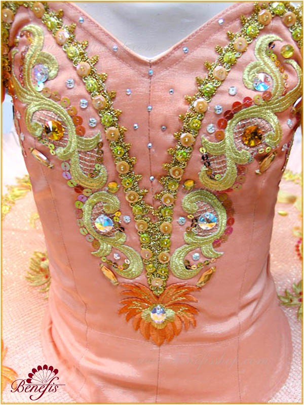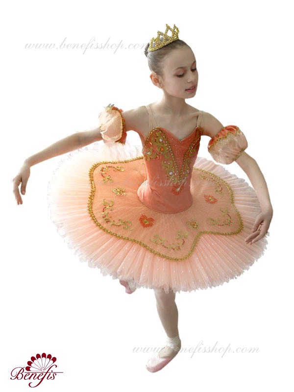 Costumul profesional pentru scena este executat in baza fustei de balet de baza profesionala #T 0001B (vezi sectiunea “Fusta de balet de baza”). Corsetul este confectionat din materie densa semi-stretch. Bretelele sunt de culoarea pielii. Pentru costumul dat sunt intrebuintate bijuterii ce se aseamana cu culorile costumului. In calitate de decor se intrebuinteaza: paiete, strase si margele marunte. Costumul este prezentat printr-o infrumusetare abundenta cu strase, panglica aurie si argintie, paiete si margele marunte. Minecarii sunt infrumusetati cu o panglica aurie sau argintie. Costumul dat poate fi folosit ca costum pentru scena.