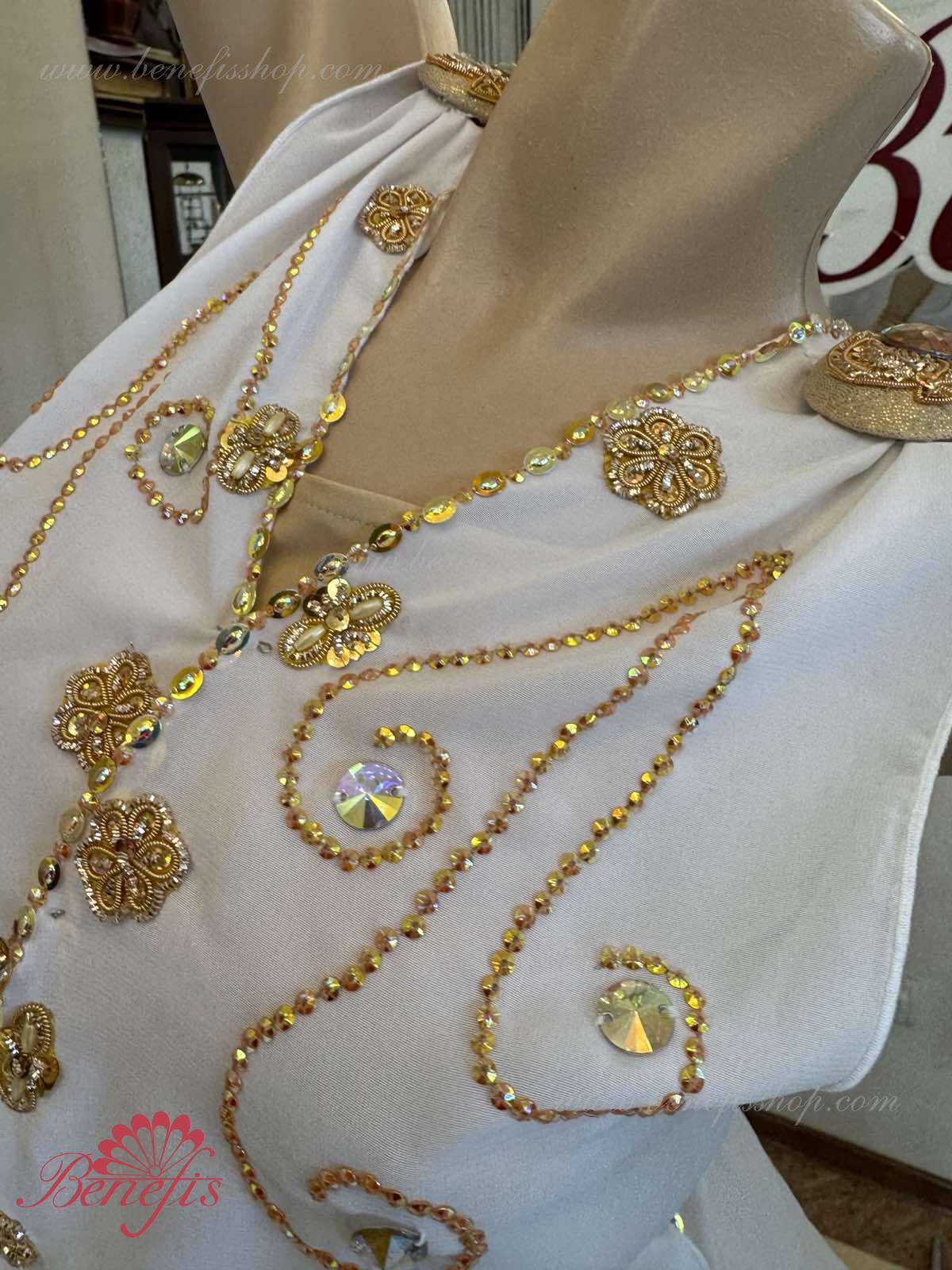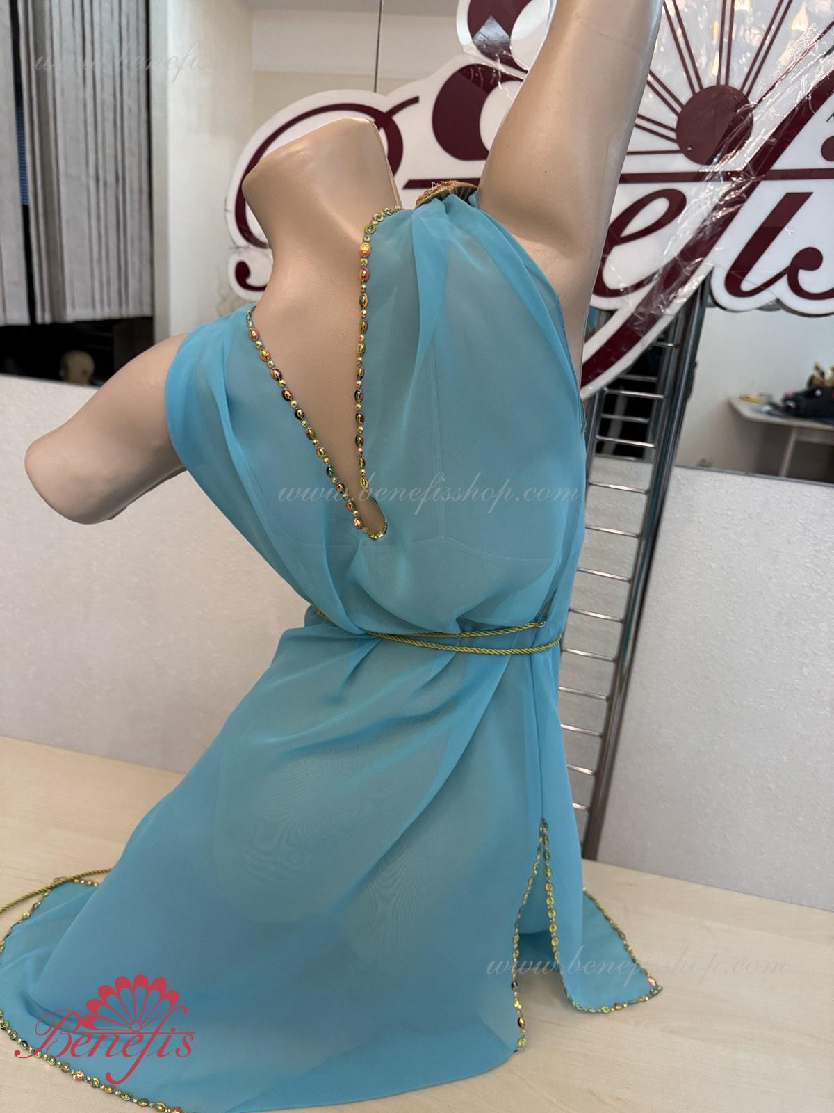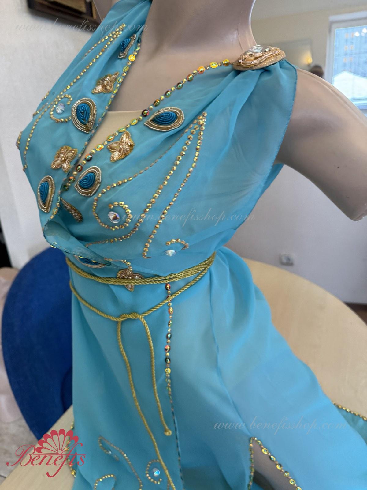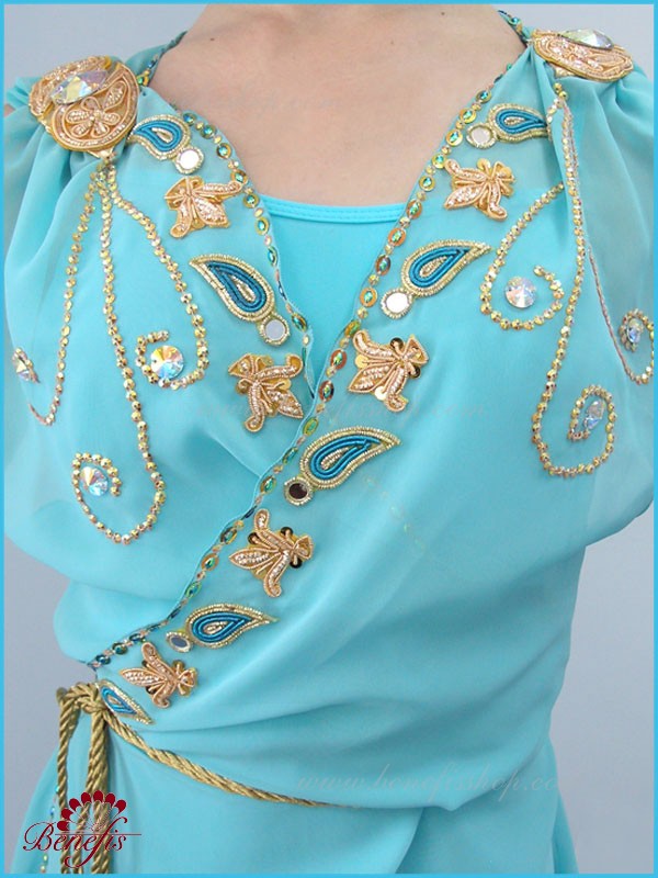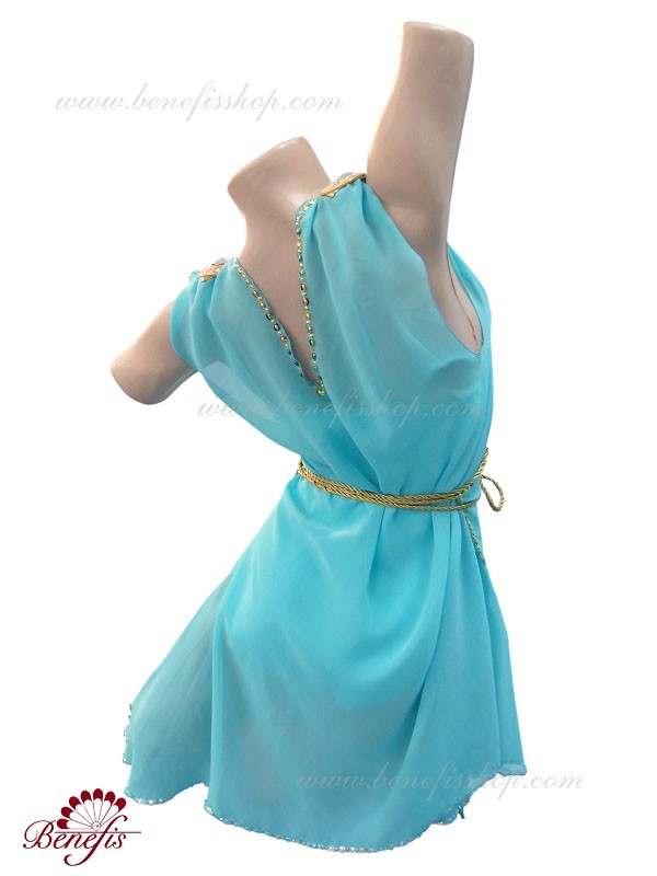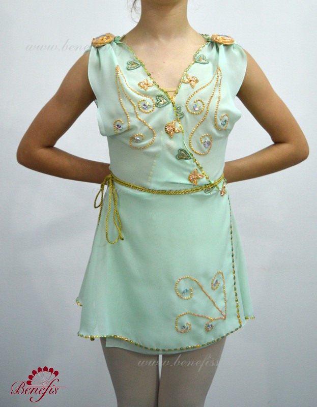 Costumul dat consta dintr-o rochie scurta – fabricata din tunica si tricou, modelul A 0001. La indeplinirea costumului dat se foloseste chifon ce usor isi revarsa culoarea si care reda costumului putin volum. Costumul este bogat ornamentat cu diverse aplicatii, strase, paiete si margele marunte. Costumul se leaga la talie cu un siret auriu.