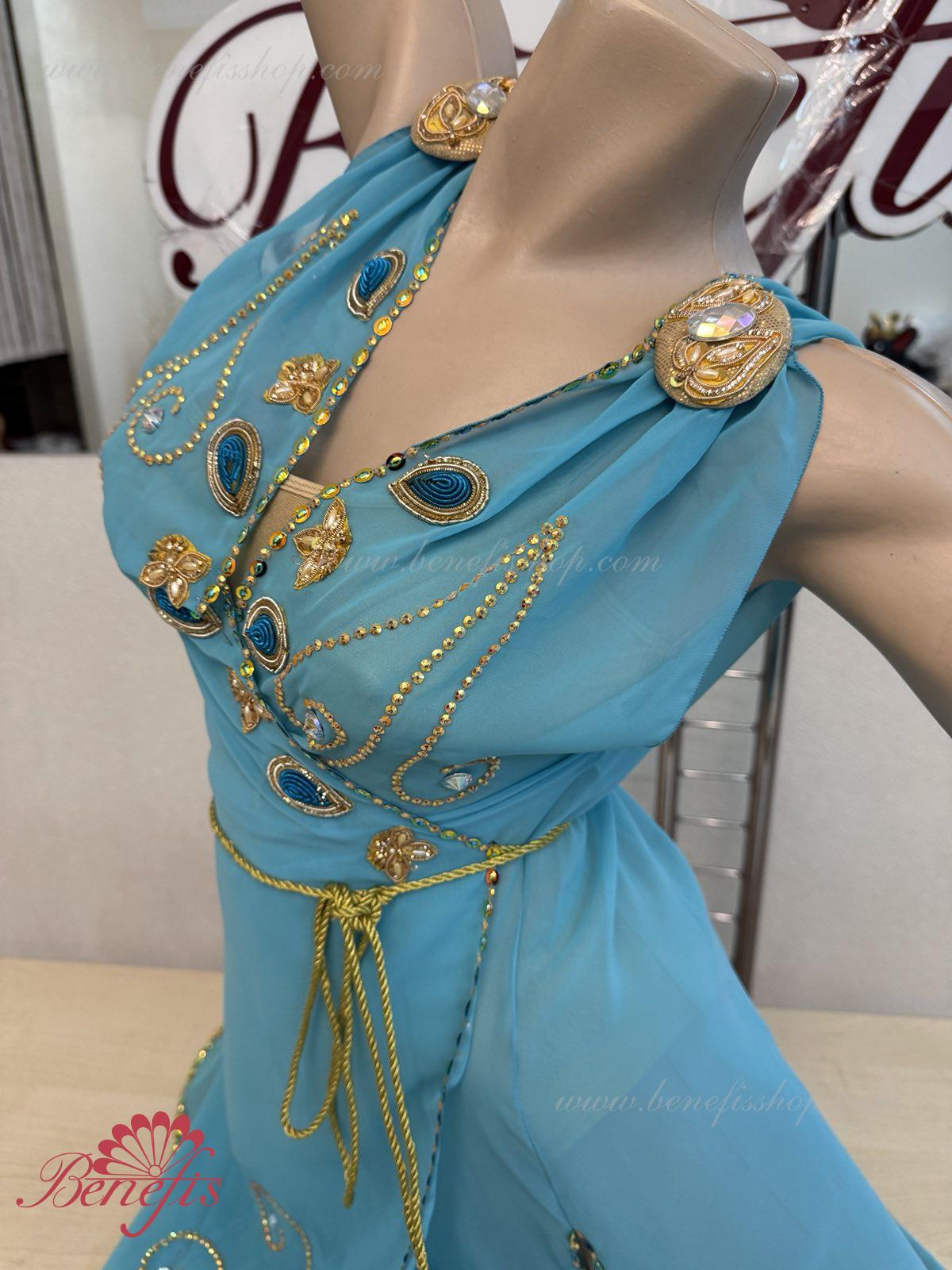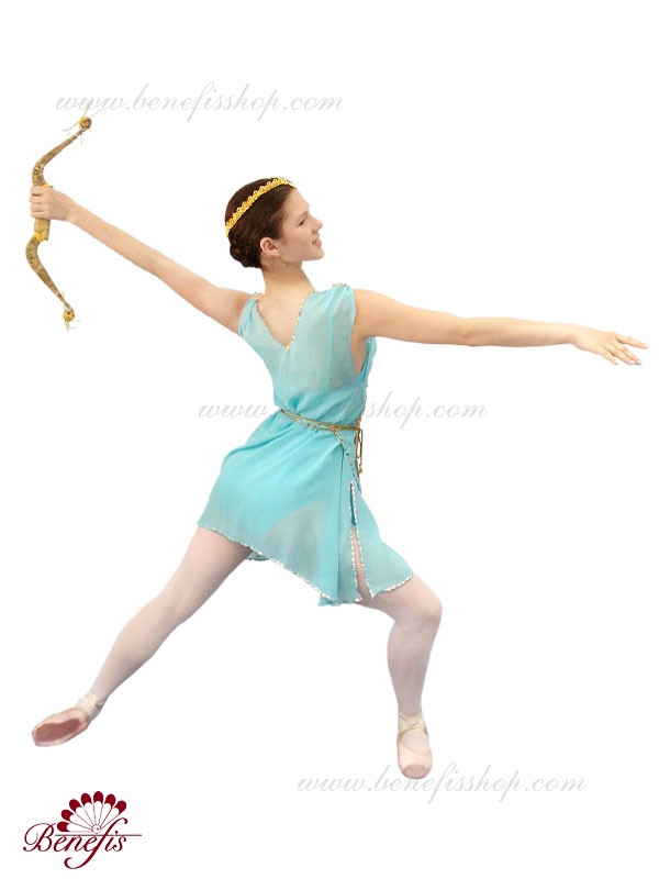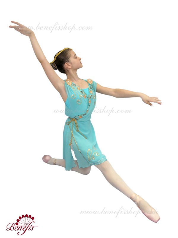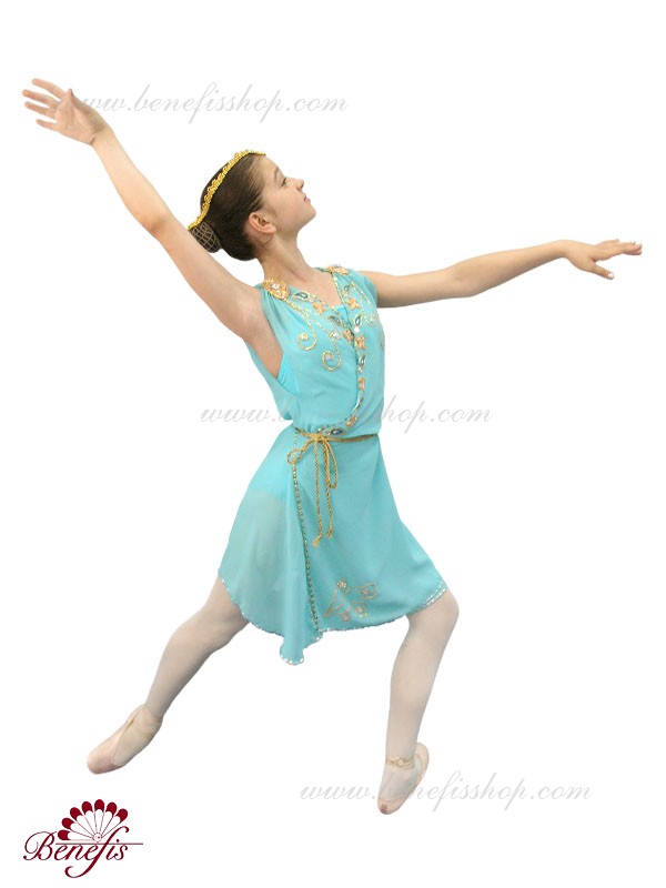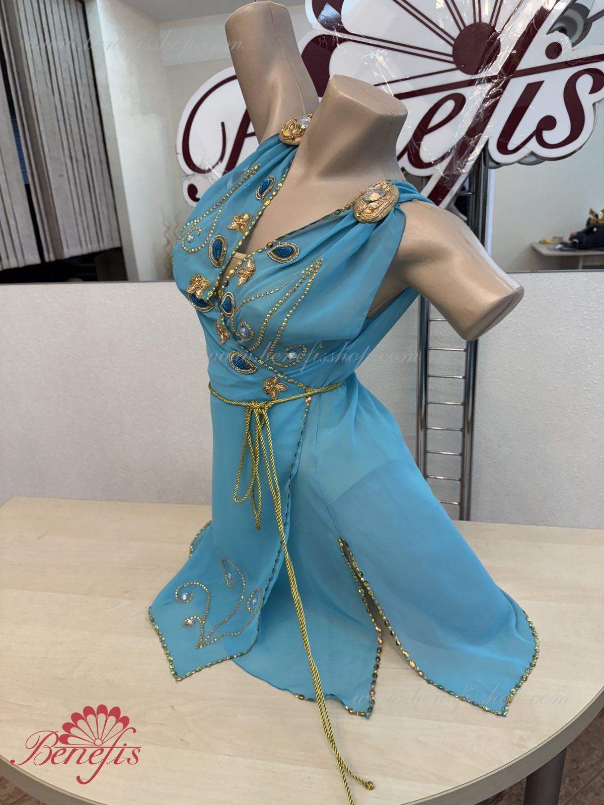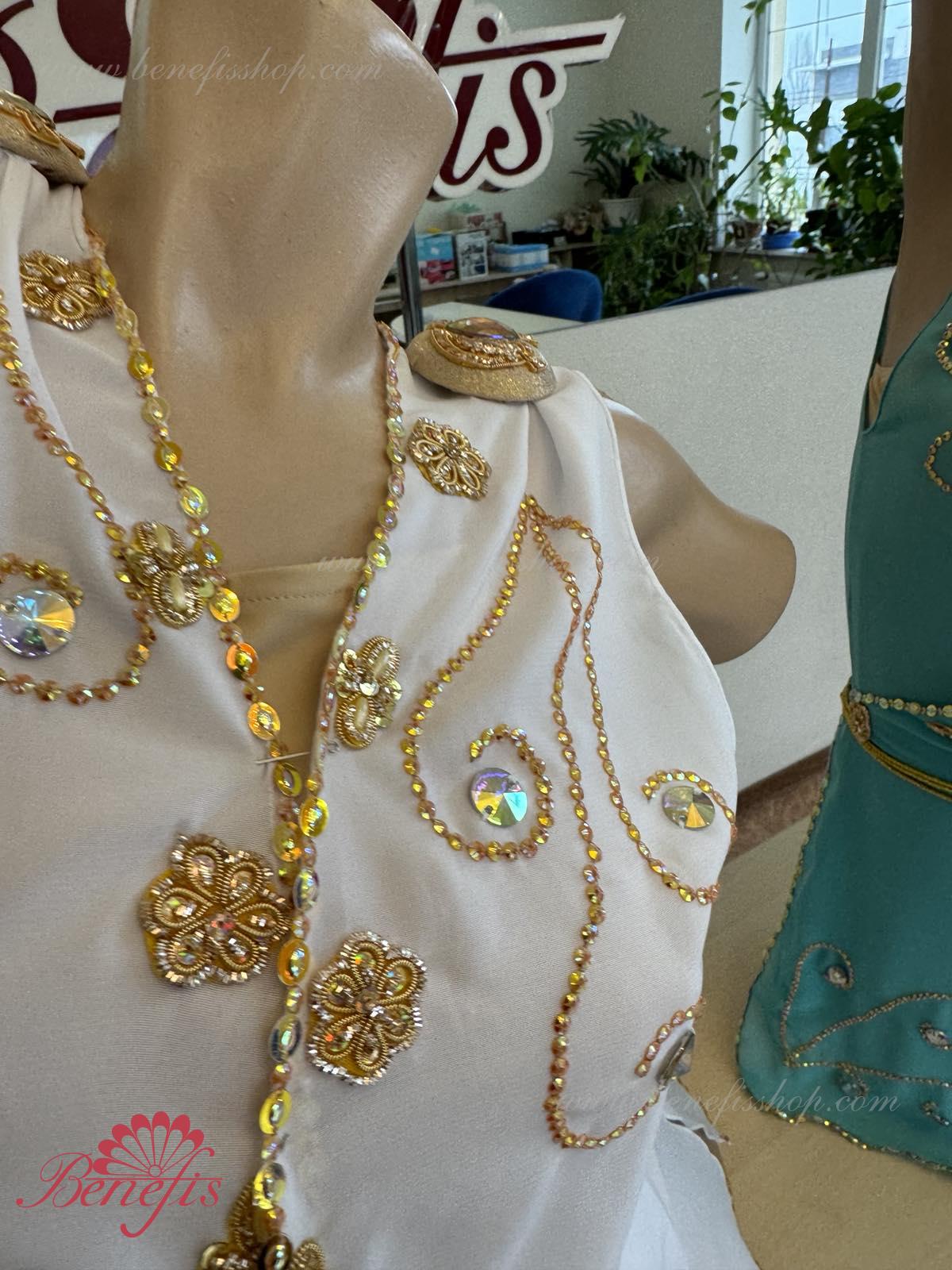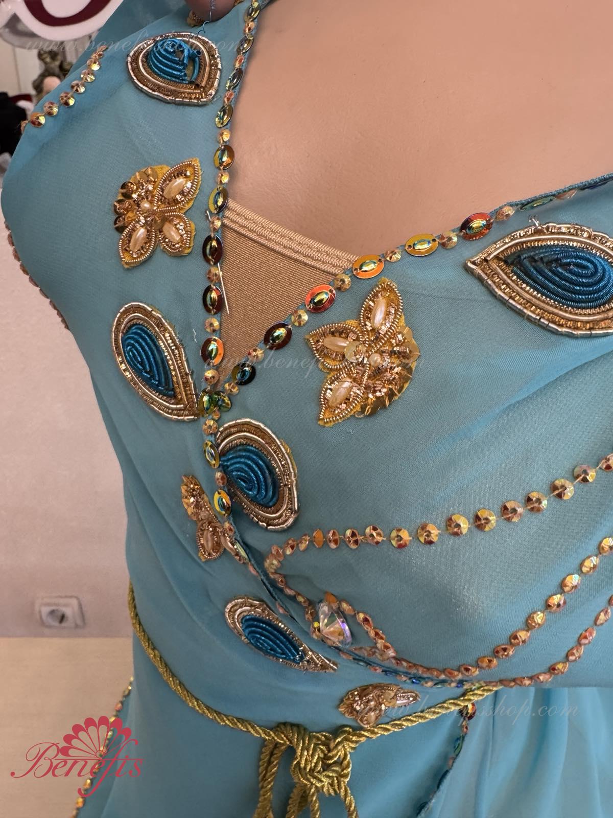 Costumul dat consta dintr-o rochie scurta – fabricata din tunica si tricou, modelul A 0001. La indeplinirea costumului dat se foloseste chifon ce usor isi revarsa culoarea si care reda costumului putin volum. Costumul este bogat ornamentat cu diverse aplicatii, strase, paiete si margele marunte. Costumul se leaga la talie cu un siret auriu.