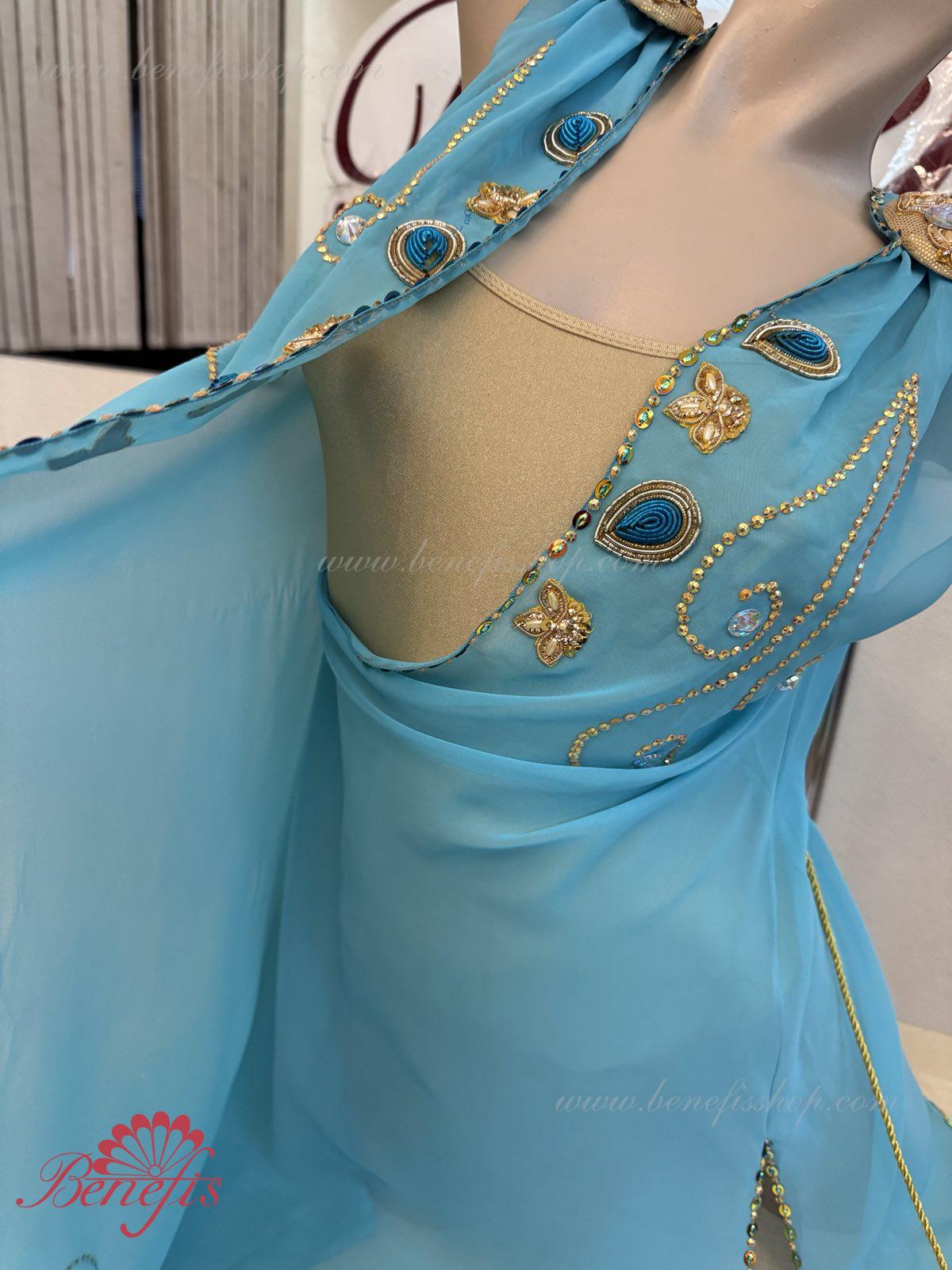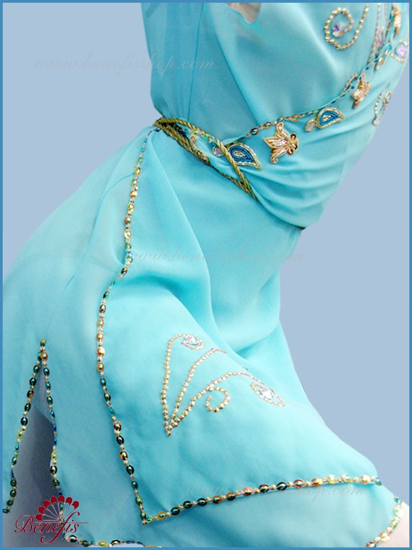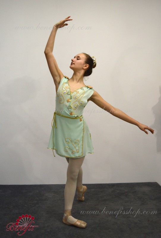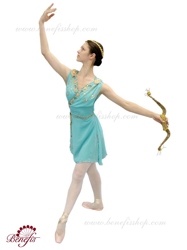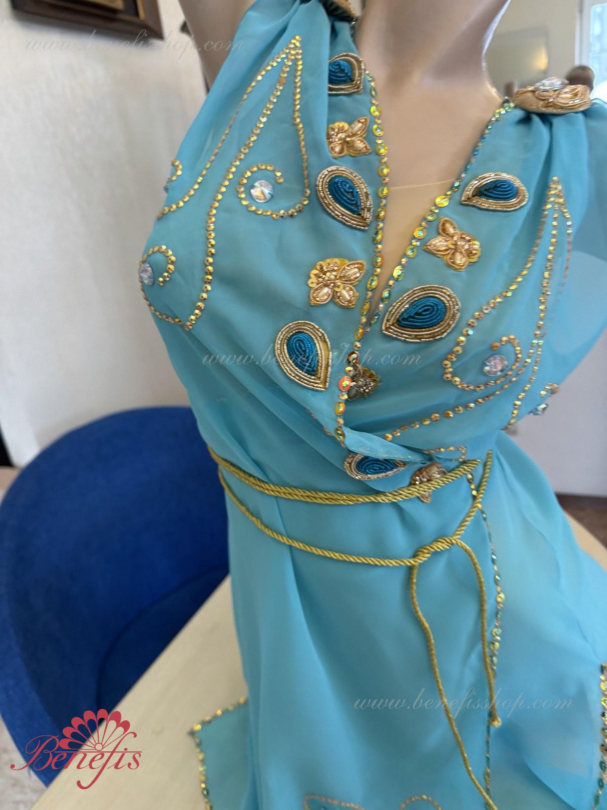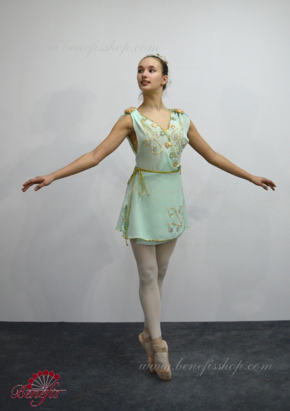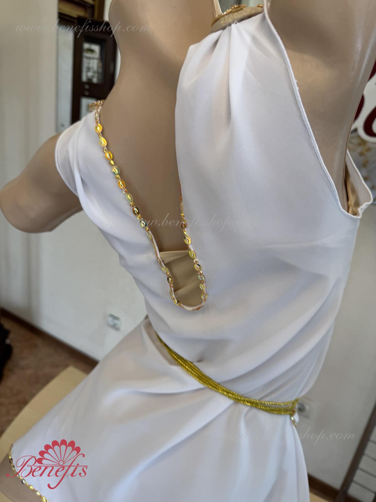 Costumul dat consta dintr-o rochie scurta – fabricata din tunica si tricou, modelul A 0001. La indeplinirea costumului dat se foloseste chifon ce usor isi revarsa culoarea si care reda costumului putin volum. Costumul este bogat ornamentat cu diverse aplicatii, strase, paiete si margele marunte. Costumul se leaga la talie cu un siret auriu.