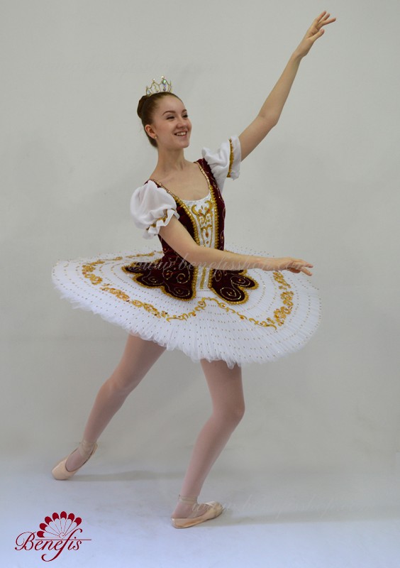 Costumul professional este indeplinit in stil francez, cu fusta putin lasata. Corsetul si stratul superior al fustei este fabricat dintr-o tesatura densa semi-elastica. Insertia de pe corset este indeplinita dintr-o tesatura monocromatica si este bogat impodobita cu applicatii, strase, paiete si margele marunte. Pe corset sunt prezente cirlige ( la dorinta consumatorului in doua rinduri) si un snur intern pentru imbaierarea corsetului la nivelul pieptului. Aplicatiile ajurate in forma de legatura antica ofera costumului un aspect de gala. Manopera este prezenta in infrumusetarea abundenta cu strase, paiete, margele marunte si de sticla, panglica. Acest costum poate fi utilizat in baletele “Sarbatoarea florilor in Cinzano ”, “Frumoasa Adormita” , numarul de concert Grand pas Classique.