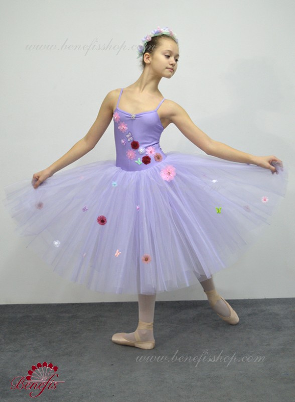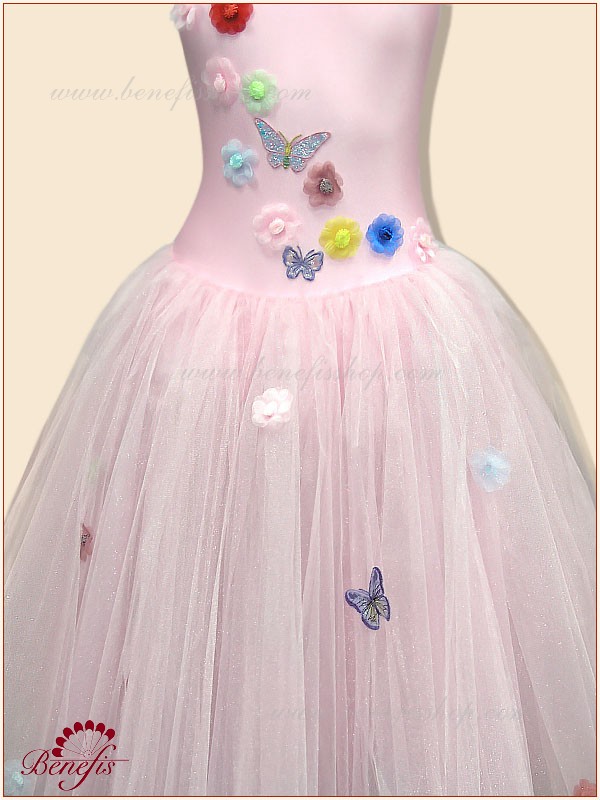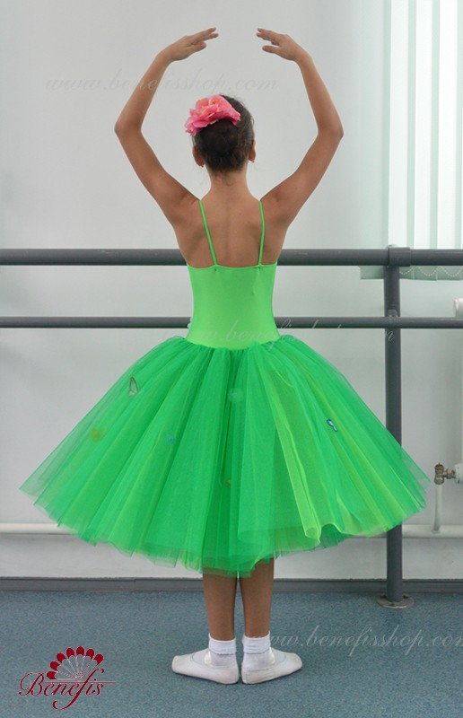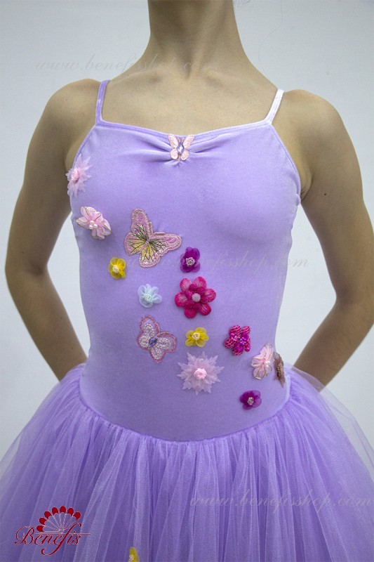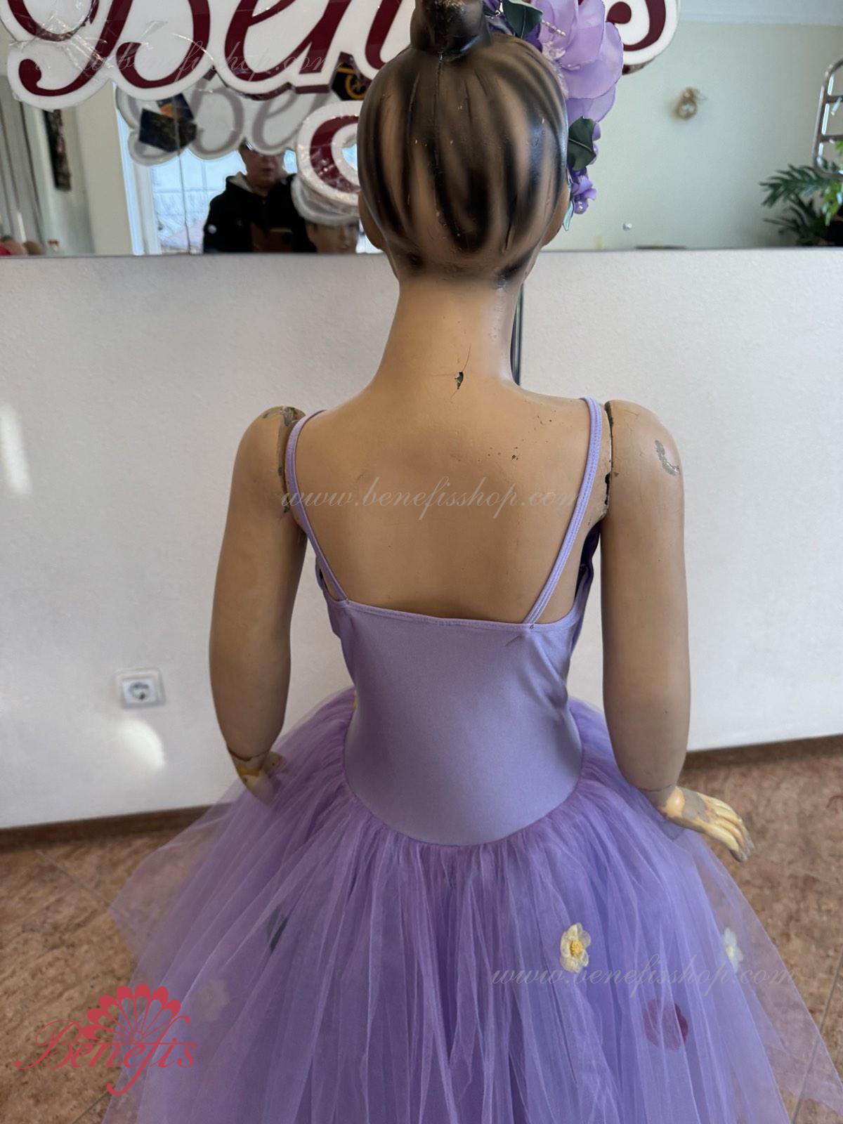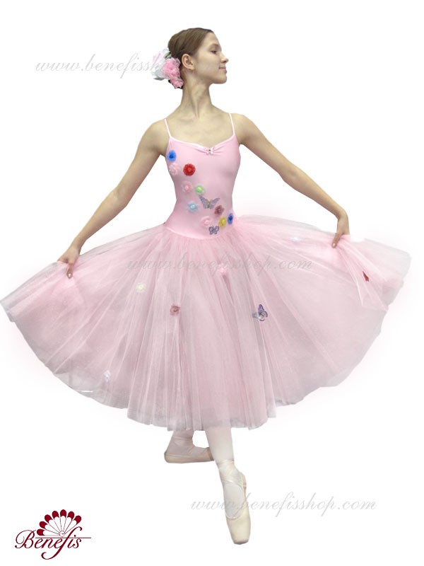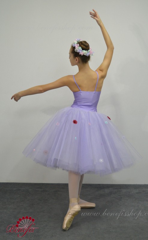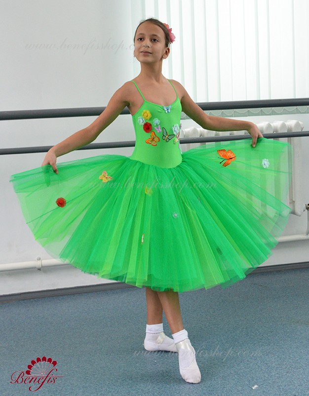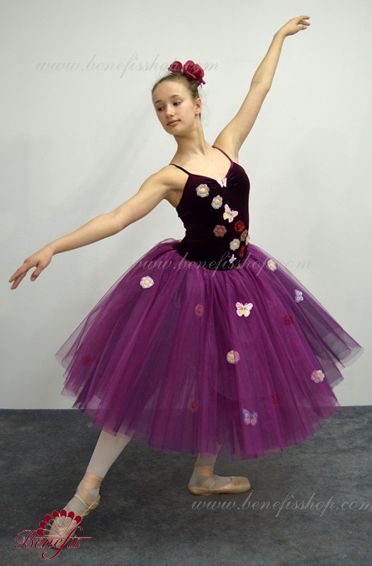 Acest costum profesional de balet este confectionat in baza unui tricou elastic (model T 0008) si unei fuste largi din patru straturi legere.