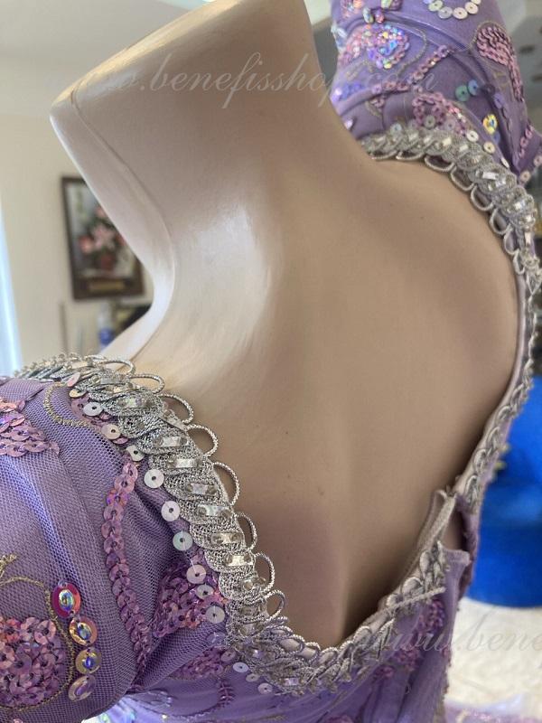 Corsetul și anvelopa sunt duplicate cu ghipur subțire și împodobite cu panglică elegantă. Corsetul sub piept se termină cu o margine de margele și margele de sticlă, care strălucesc cu nuanțe de aur și argint în timpul dansului.