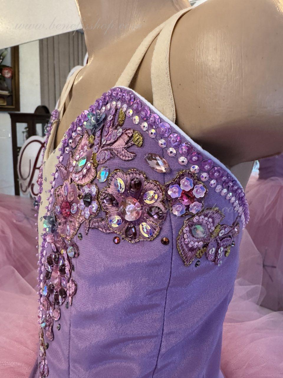 Corsetul este infrumusetat cu diverse aplicatii, strase si paiete.