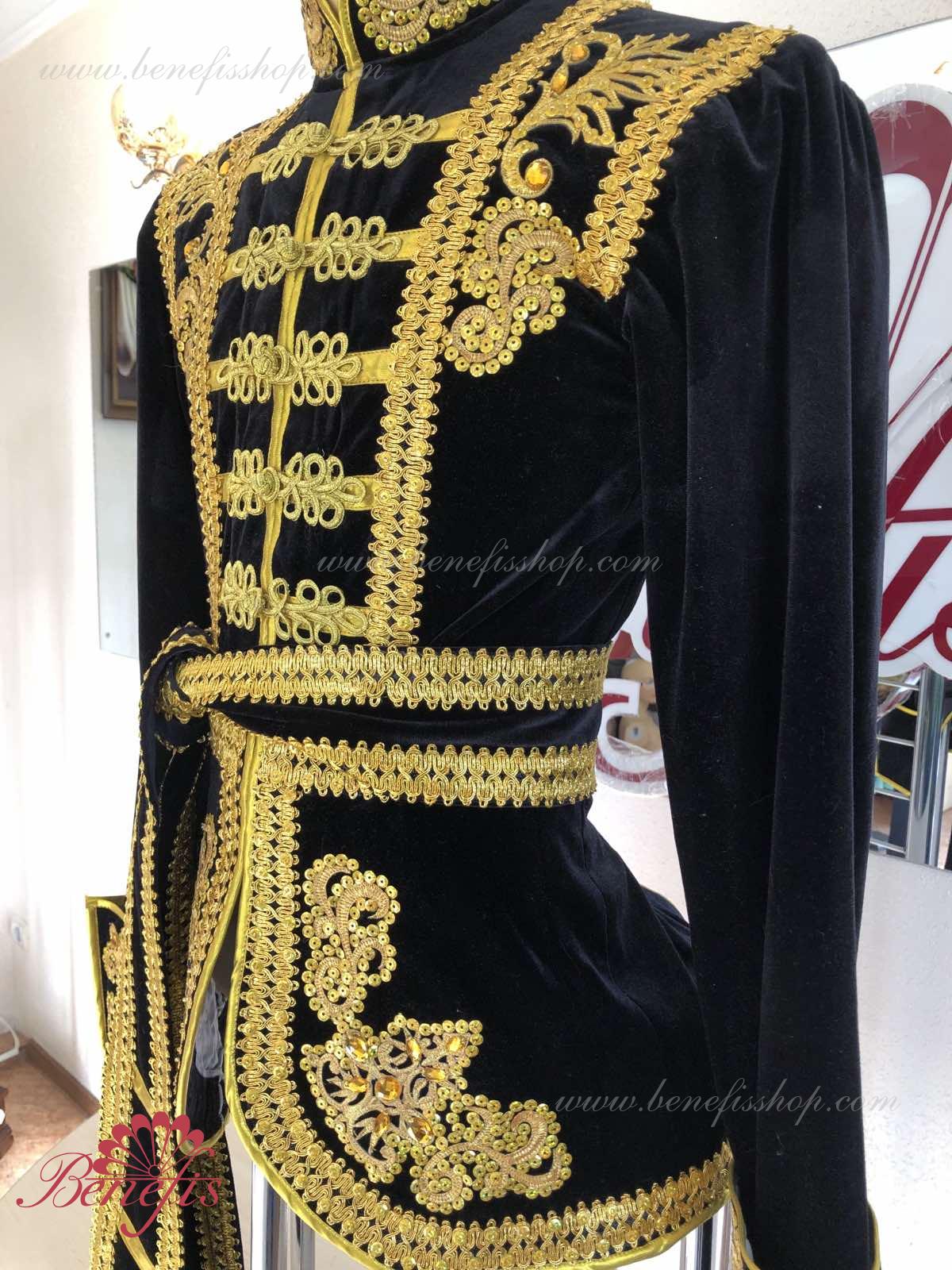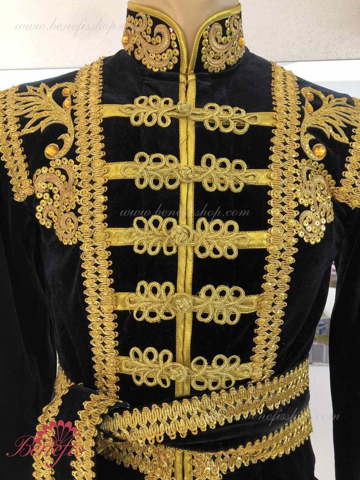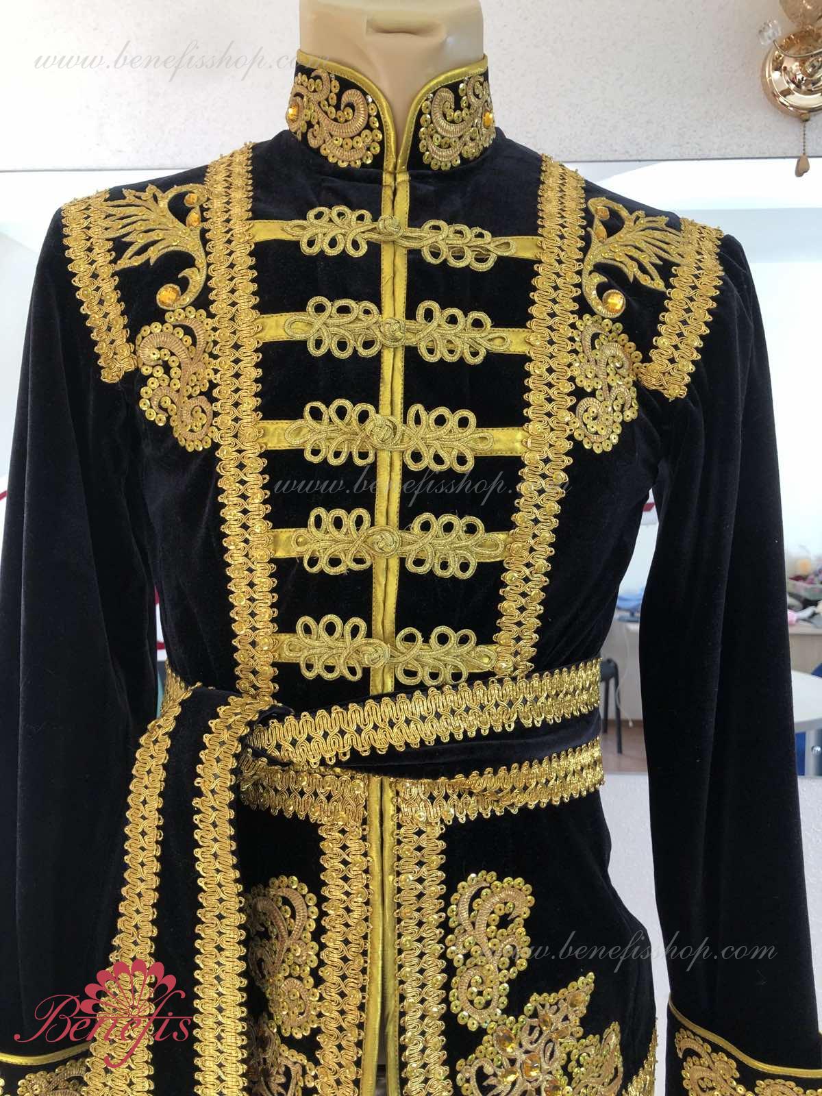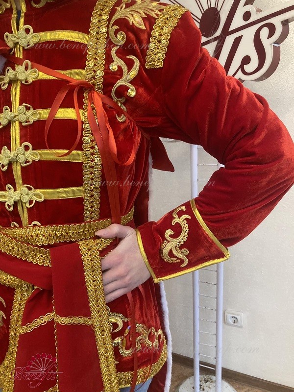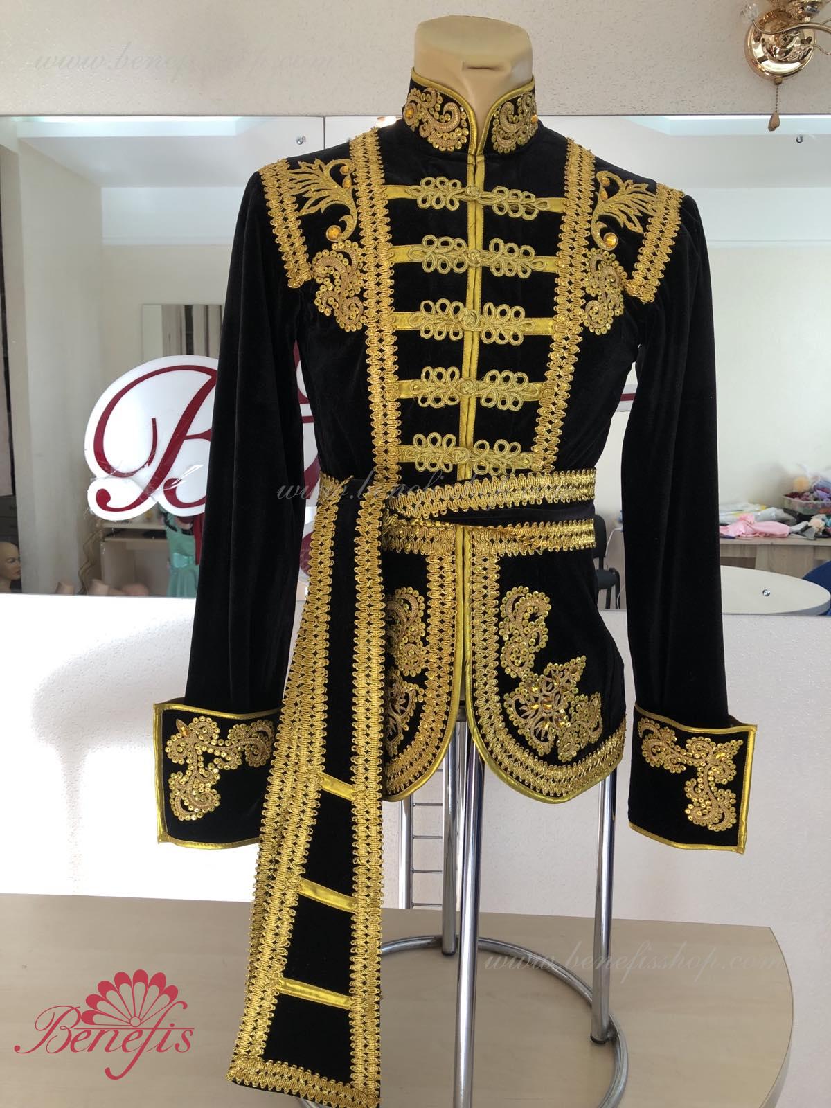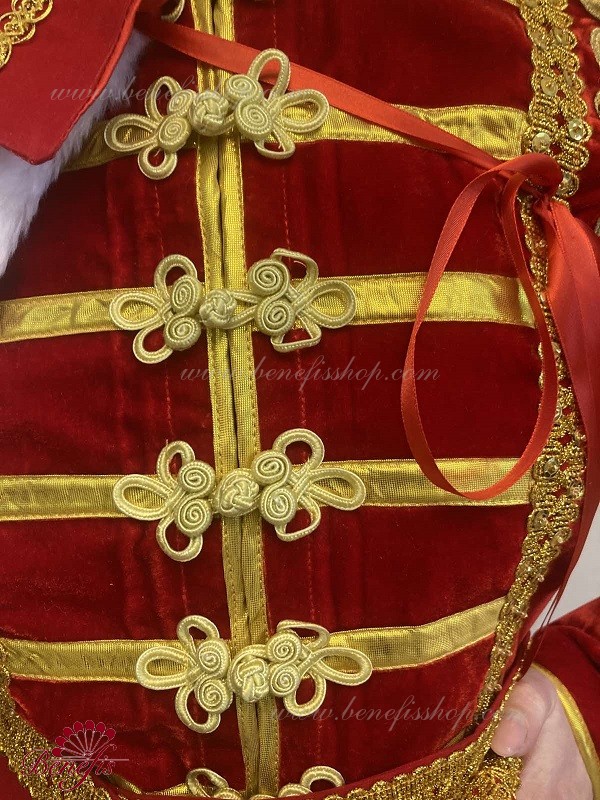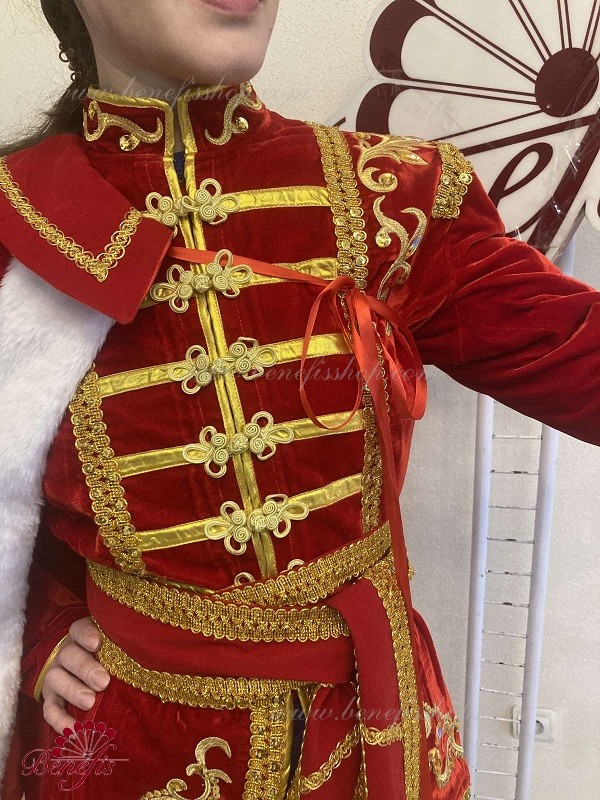 Costumul este bogat brodat cu decor auriu, ce este compus din panglica lata, applicatii, paiete. Panglica rosie de satin subliniaza liniile stricte ale costumului.