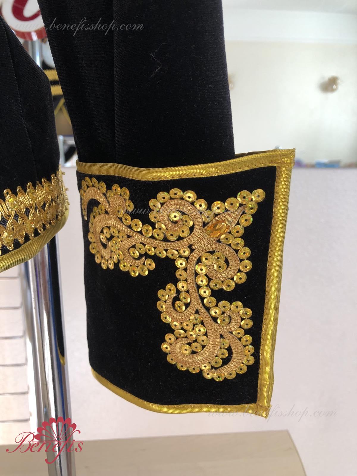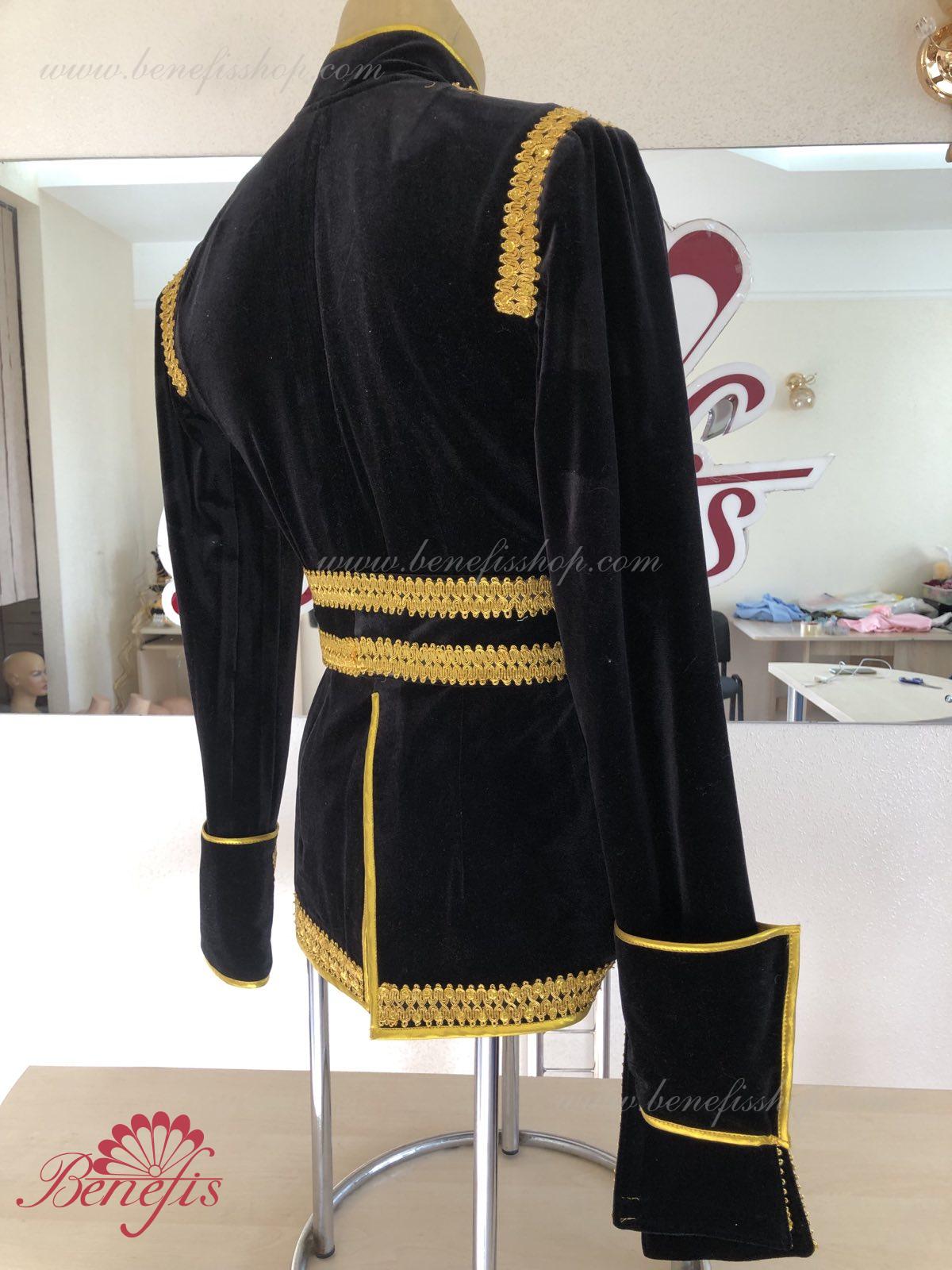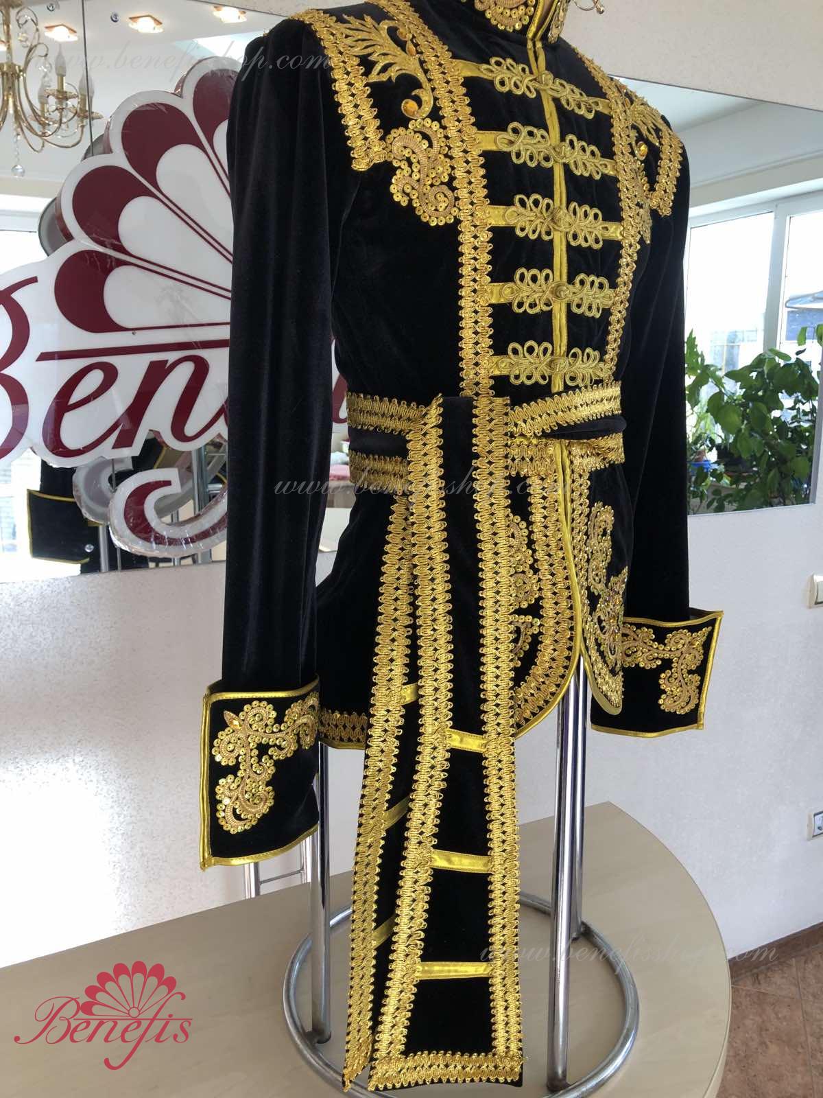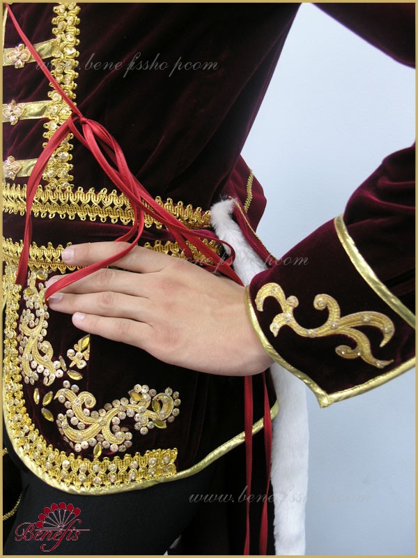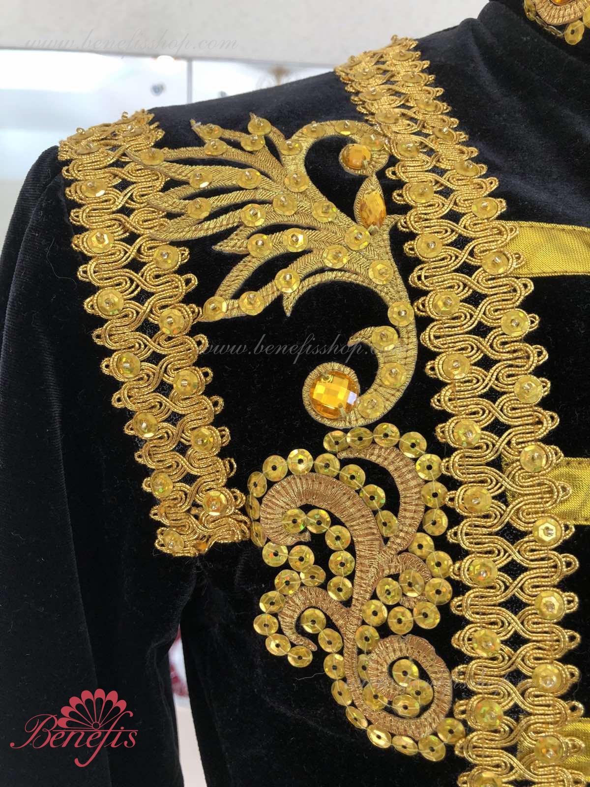 Costumul este bogat brodat cu decor auriu, ce este compus din panglica lata, applicatii, paiete. Panglica rosie de satin subliniaza liniile stricte ale costumului.