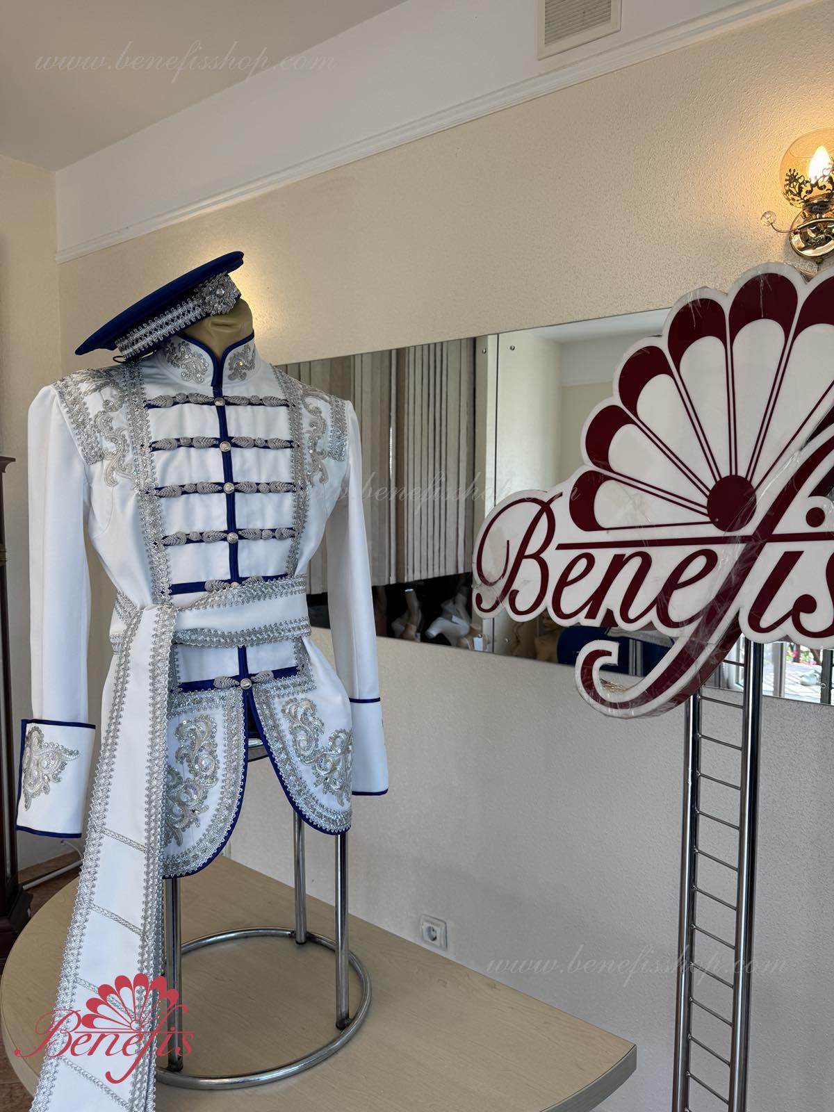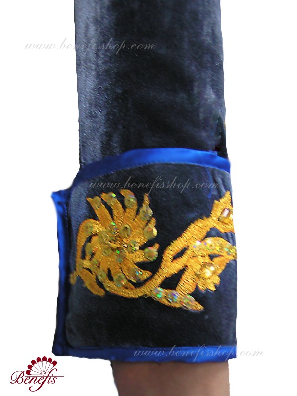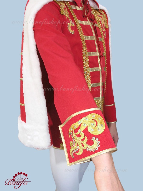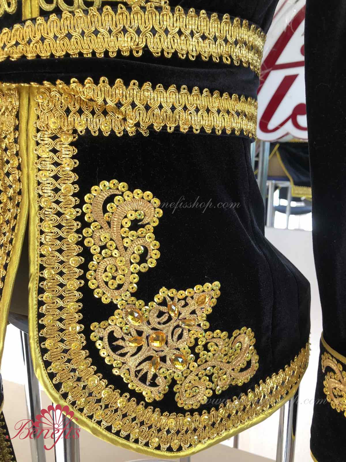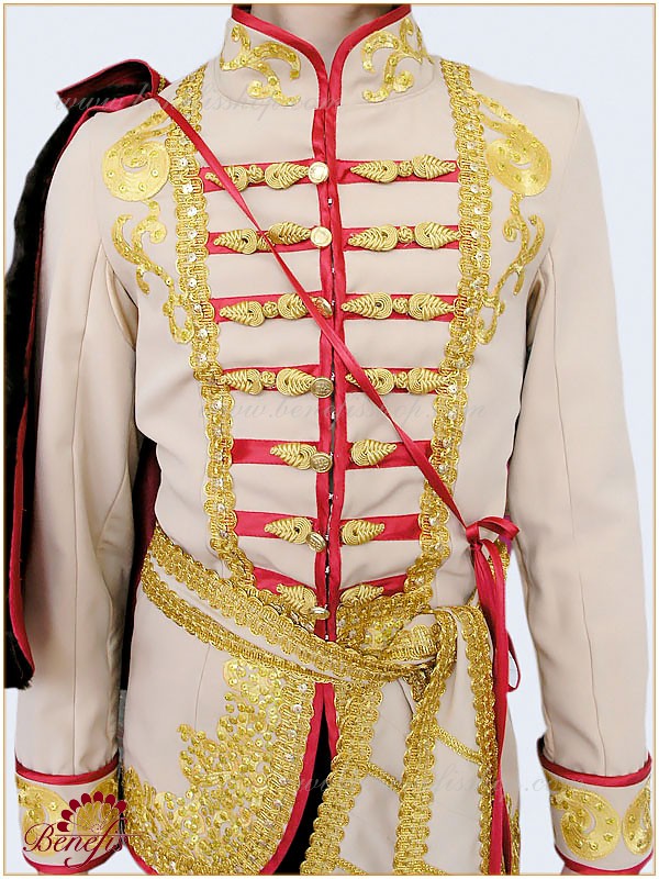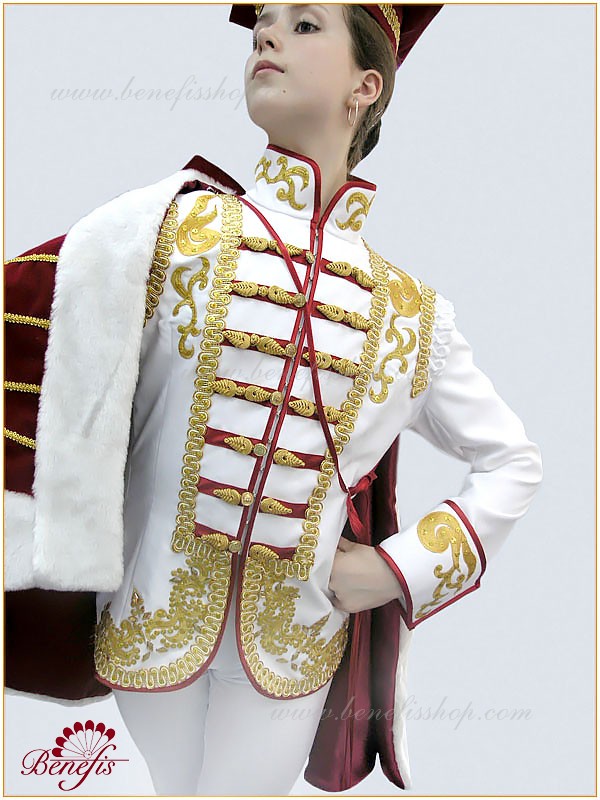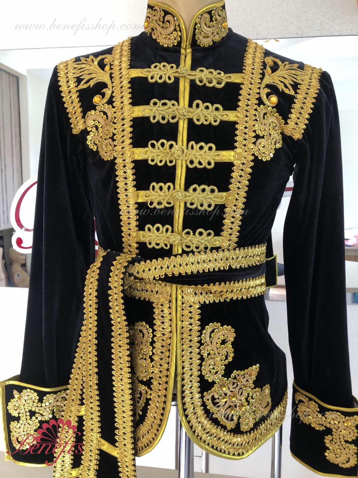 Costumul este bogat brodat cu decor auriu, ce este compus din panglica lata, applicatii, paiete. Panglica rosie de satin subliniaza liniile stricte ale costumului.