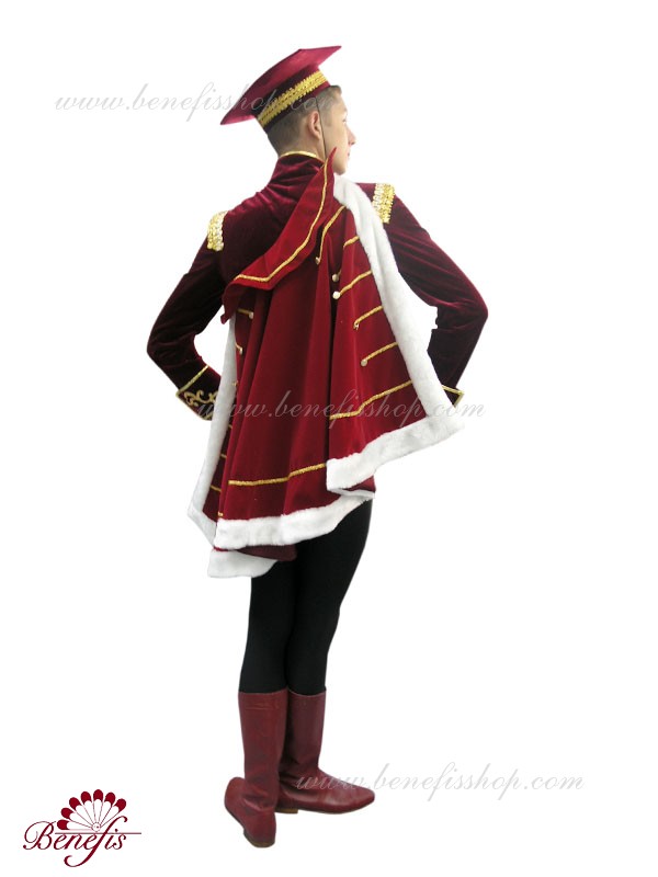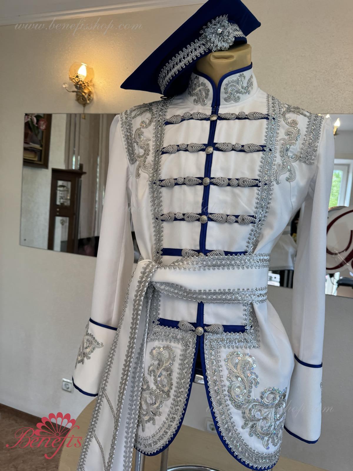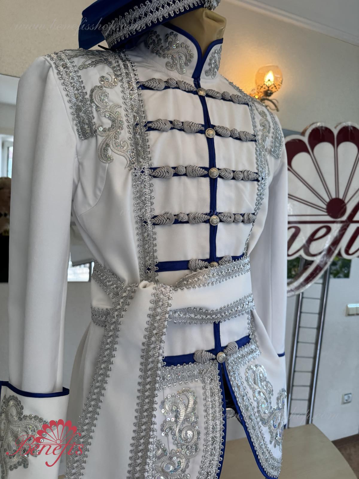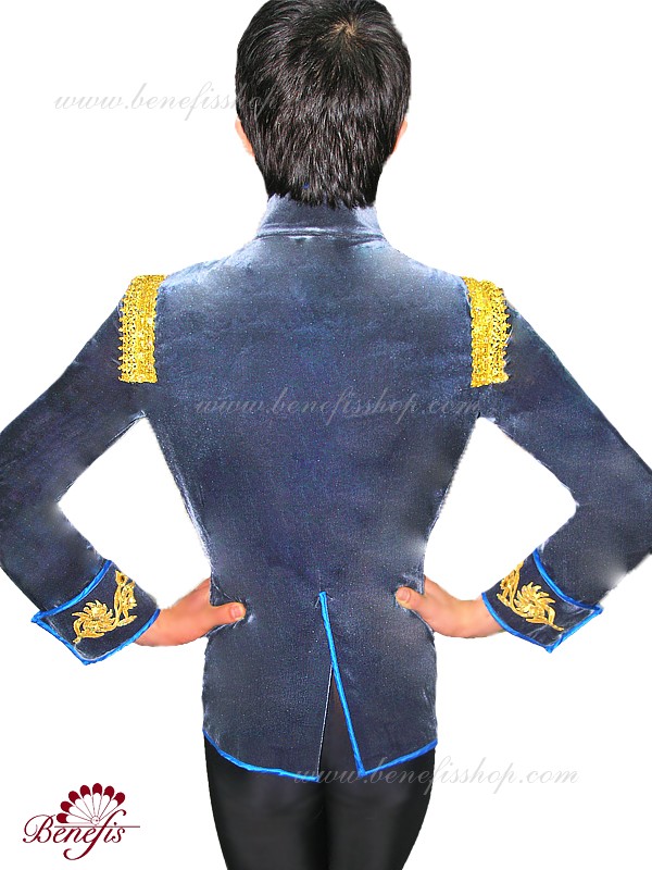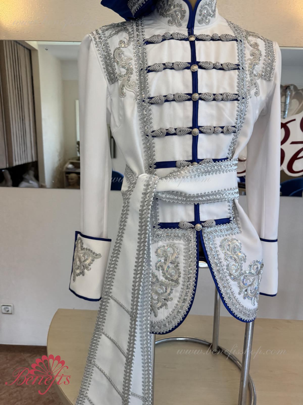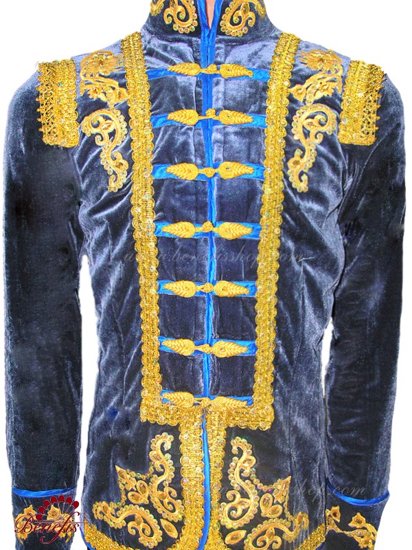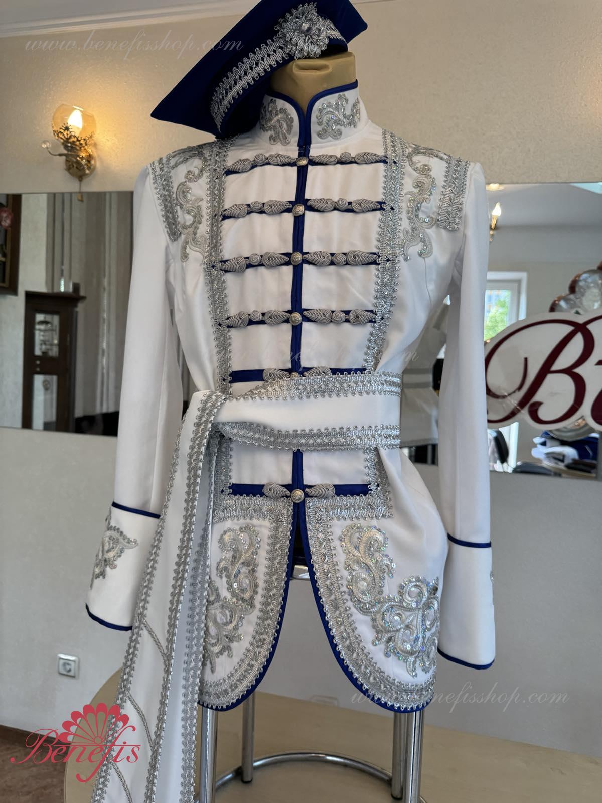 Costumul este bogat brodat cu decor auriu, ce este compus din panglica lata, applicatii, paiete. Panglica rosie de satin subliniaza liniile stricte ale costumului.