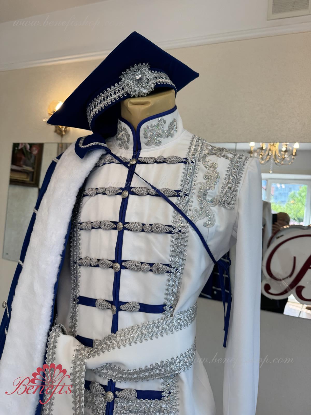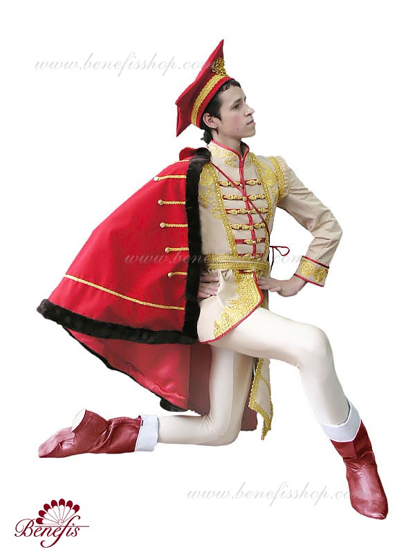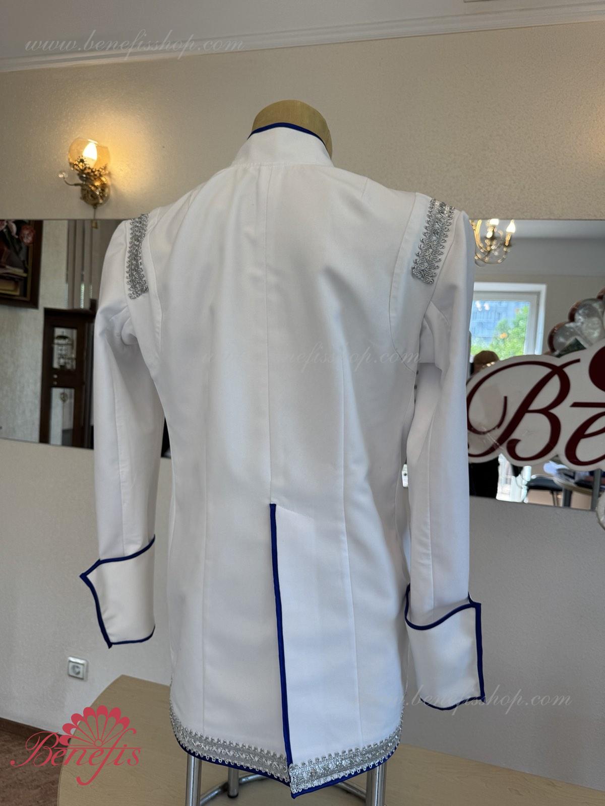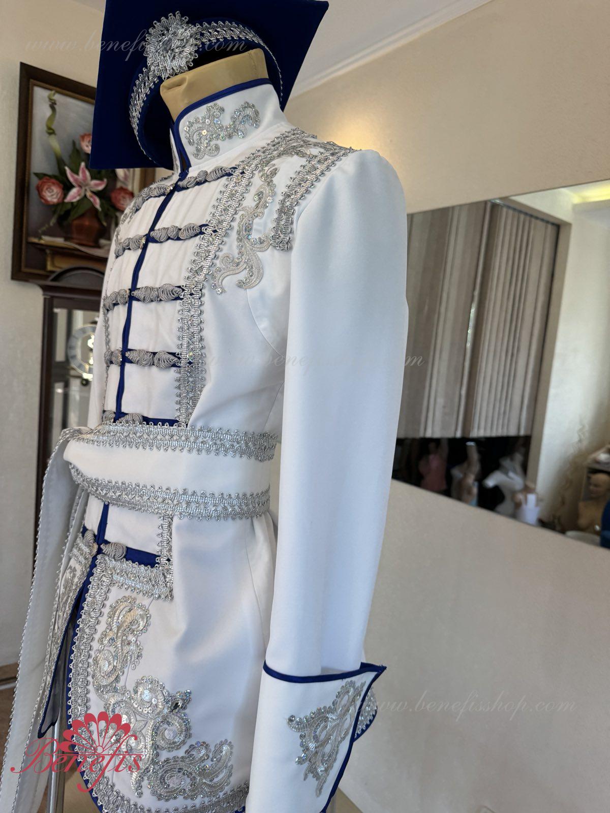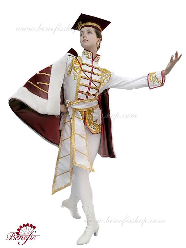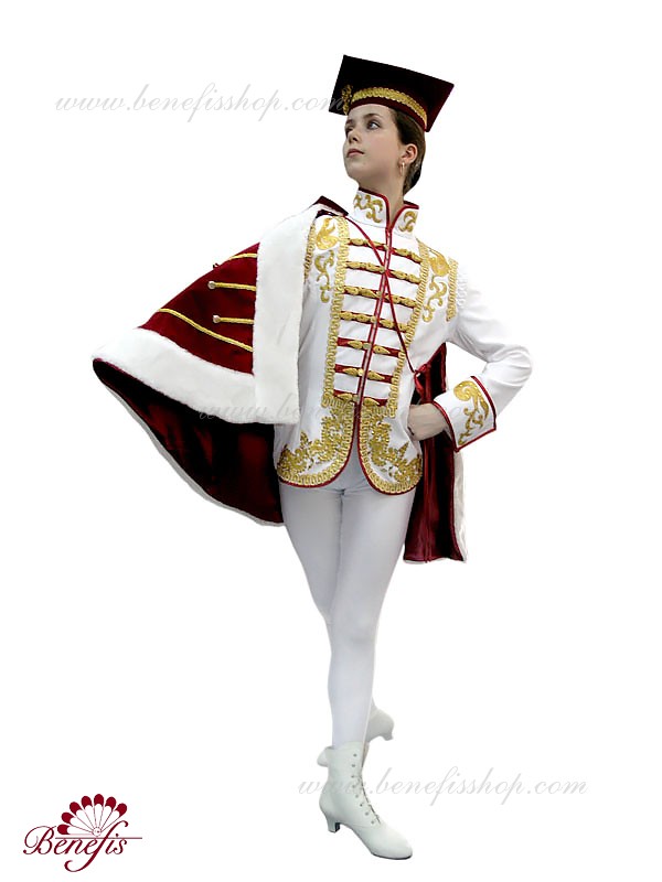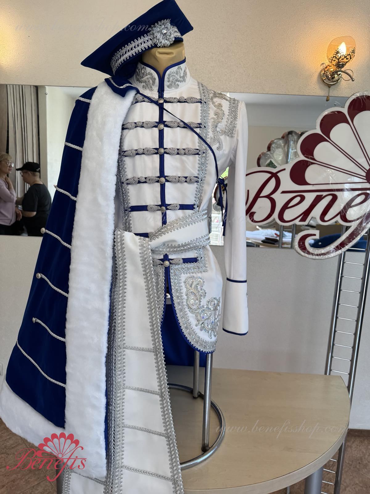 Costumul este bogat brodat cu decor auriu, ce este compus din panglica lata, applicatii, paiete. Panglica rosie de satin subliniaza liniile stricte ale costumului.