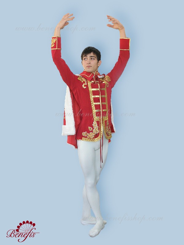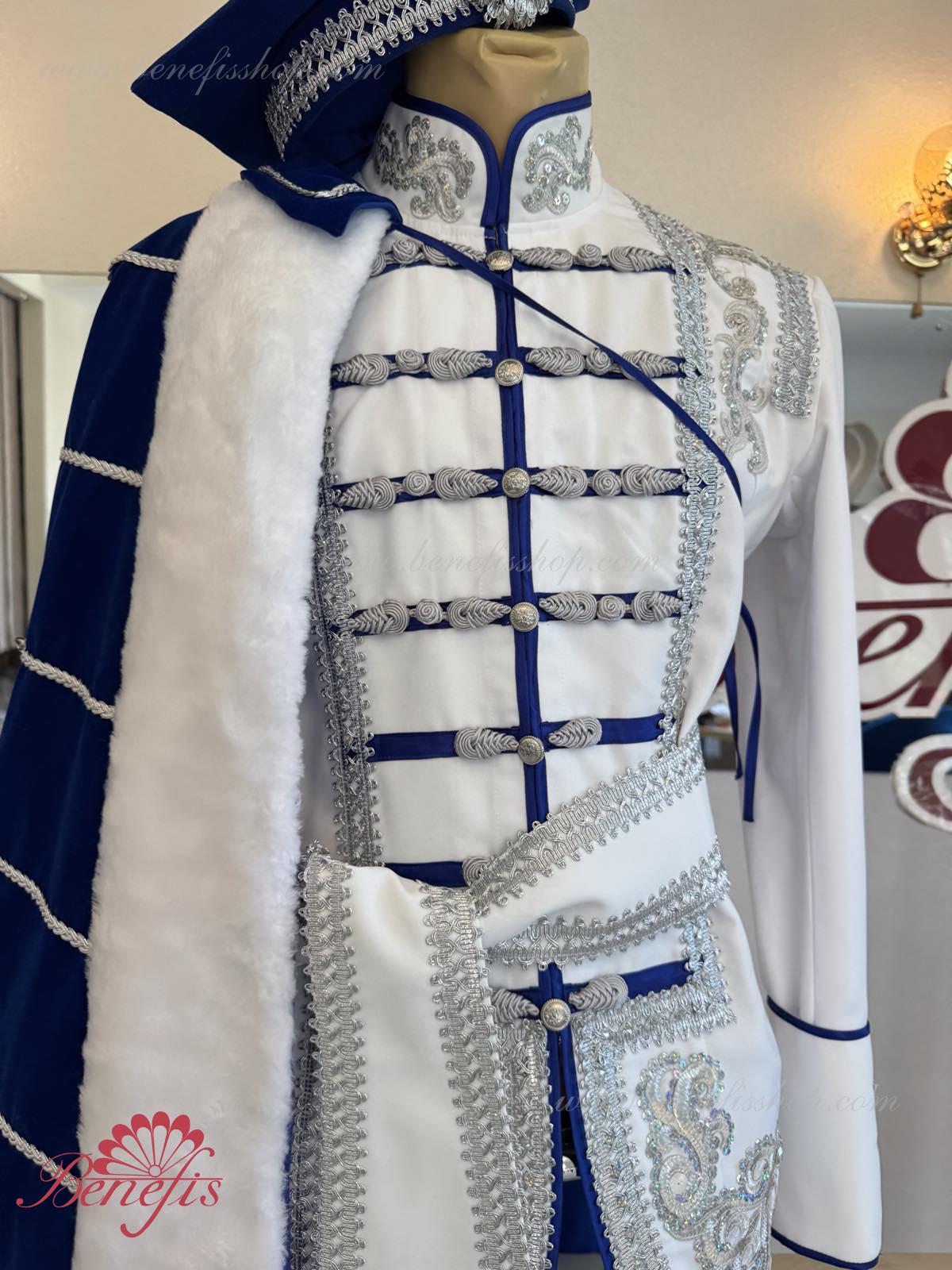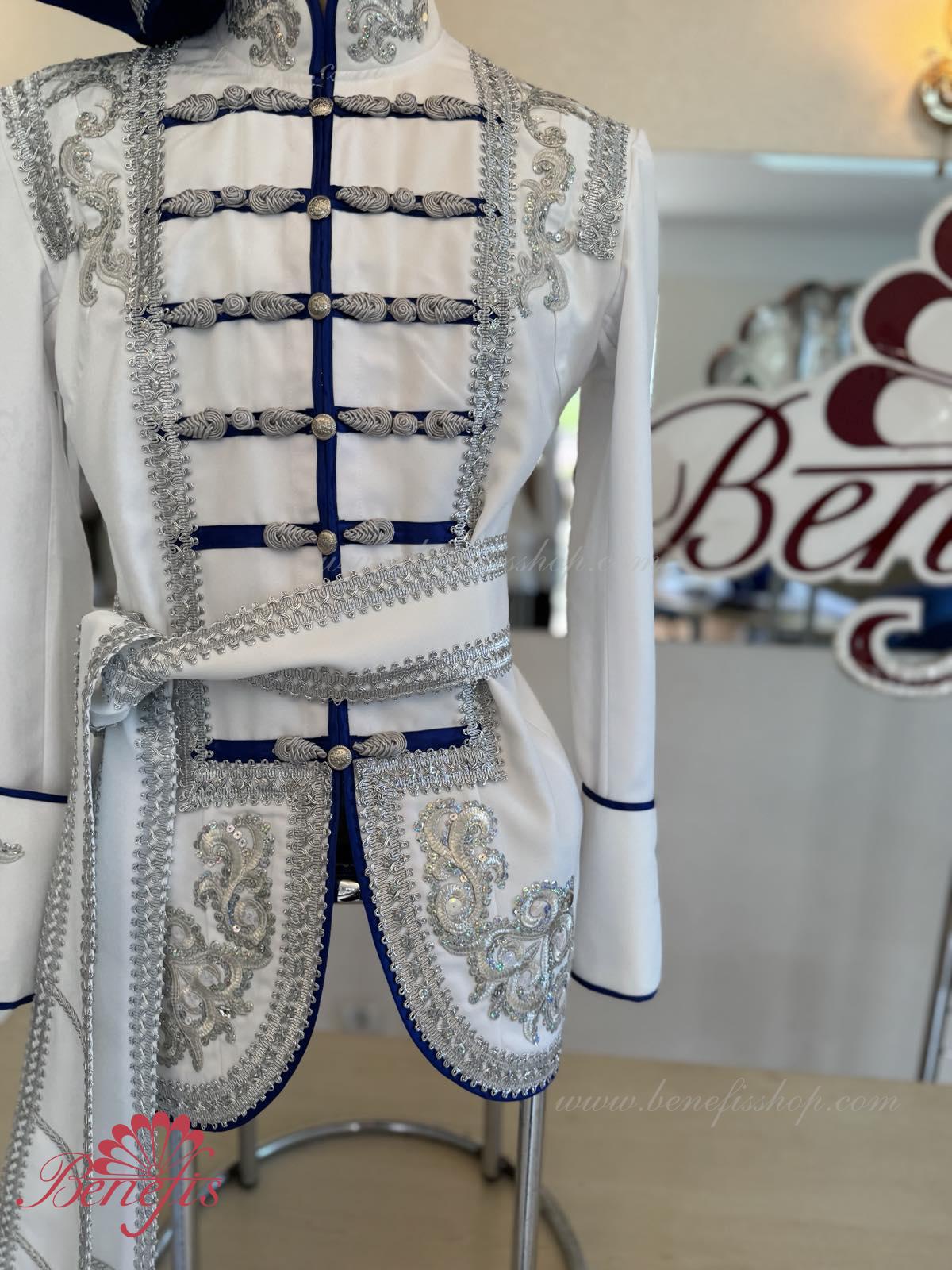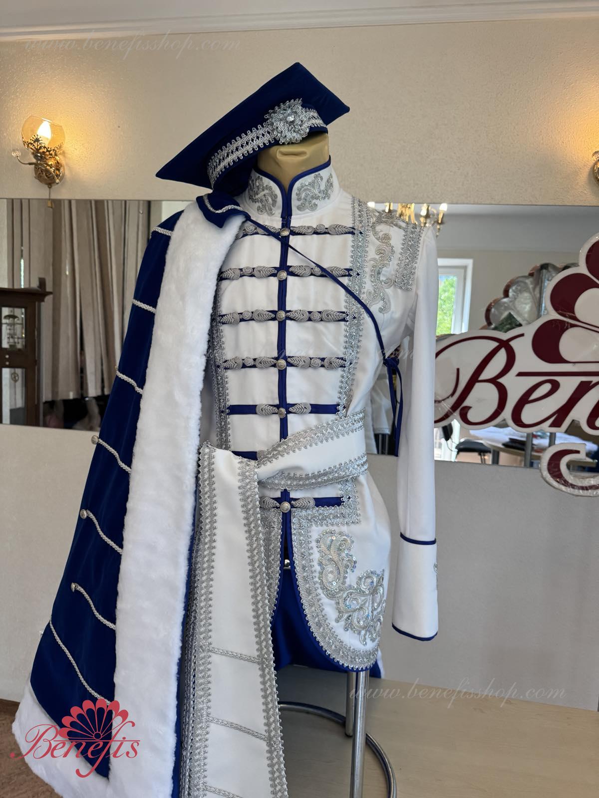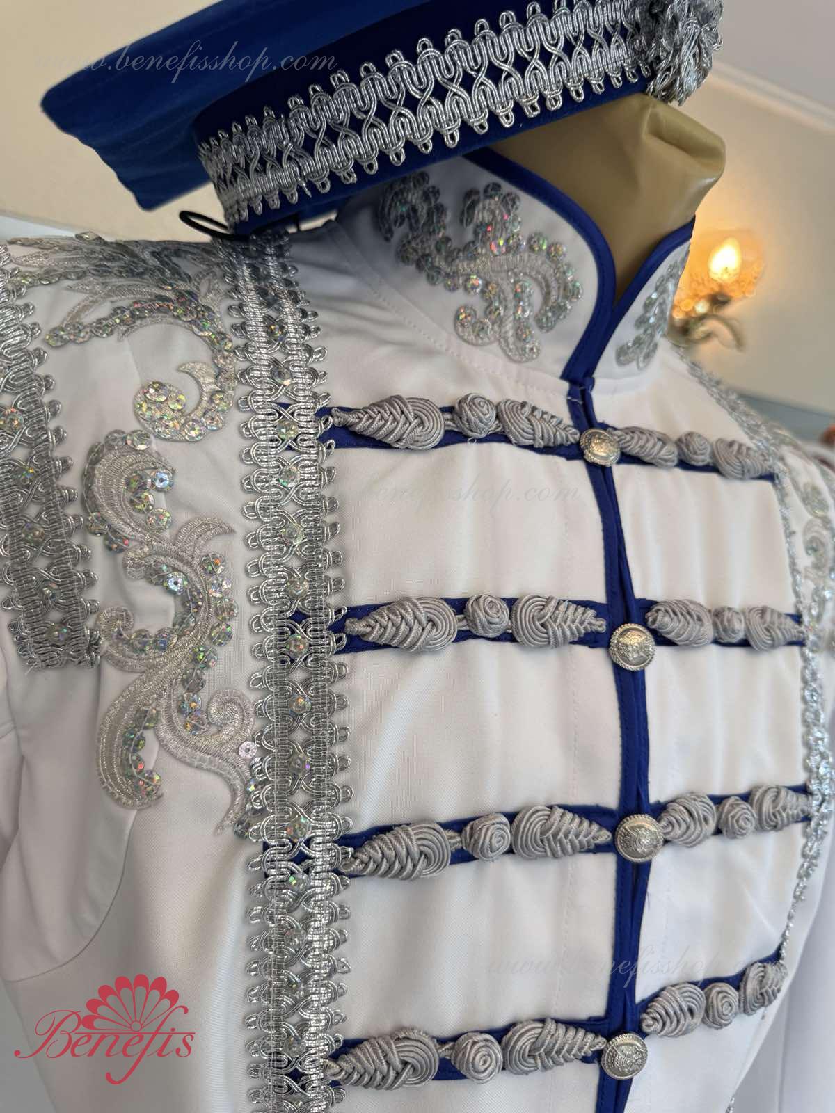 Costumul este bogat brodat cu decor auriu, ce este compus din panglica lata, applicatii, paiete. Panglica rosie de satin subliniaza liniile stricte ale costumului.
