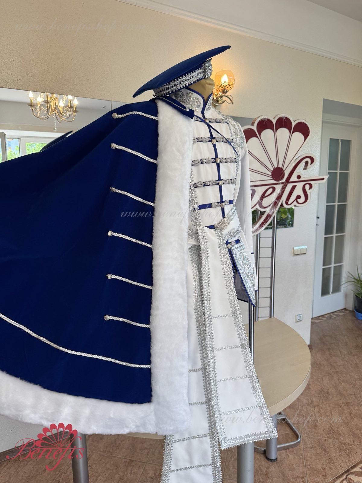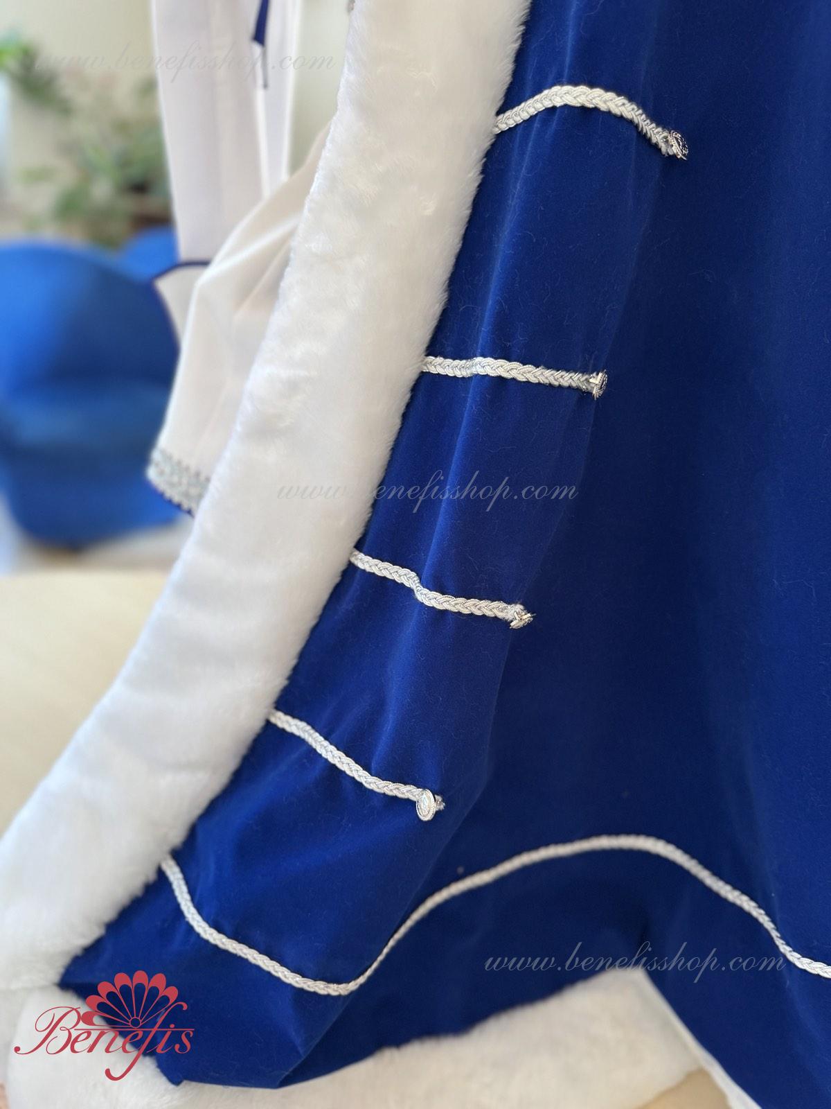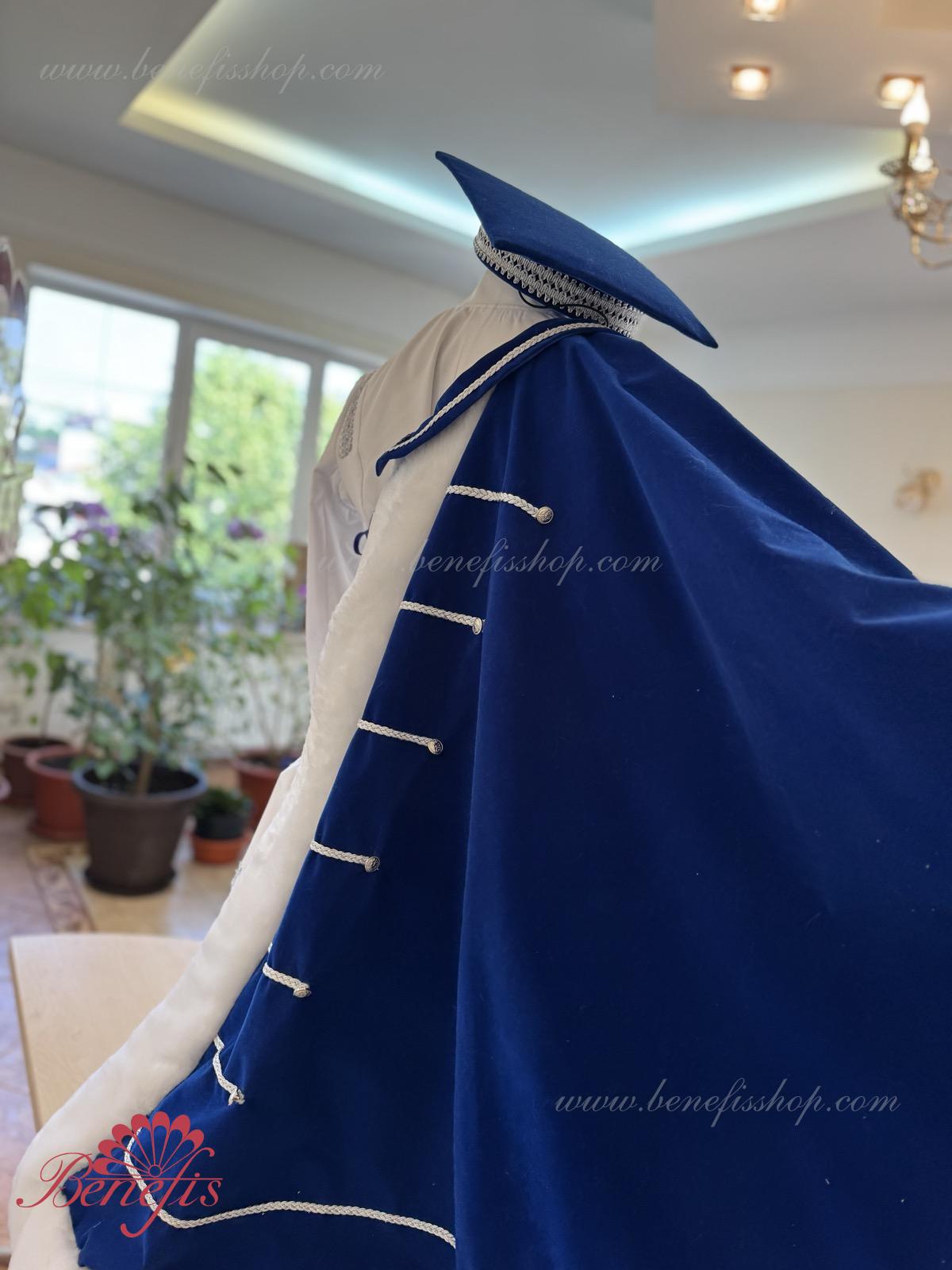 Trenciul de velvet pe captuseala, se margineste cu blana si este infrumusetat cu panglica aurie si nasturi, se imbraca pe un umar si se leaga cu o fundita rosie.